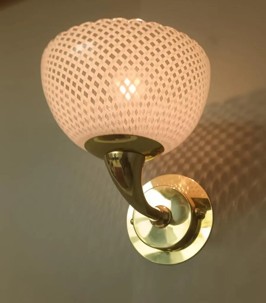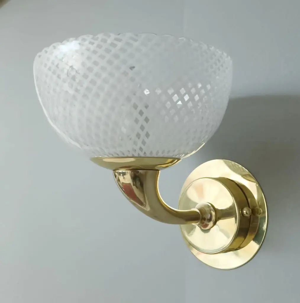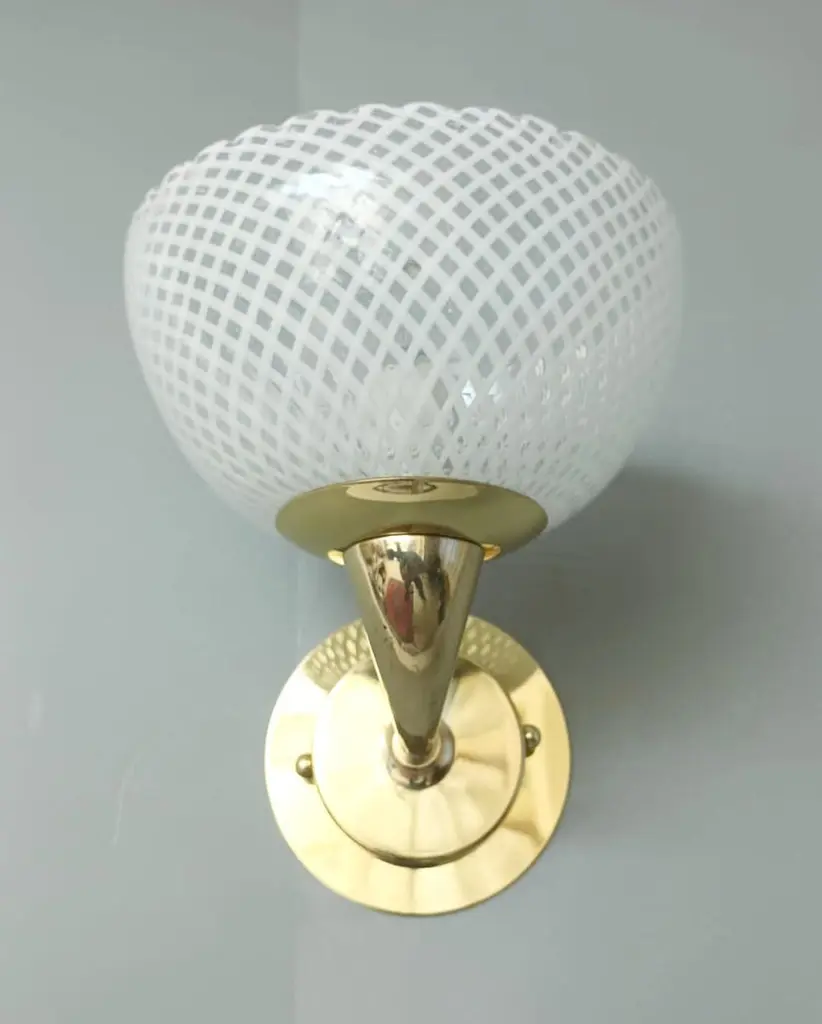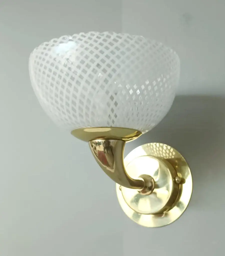 Vintage Italian wall lights with Murano glass cups hand blown in "reticello" technique to form crisscross pattern of white filaments, mounted on brass frames / Made in Italy in the style of Venini, circa 1950sMeasures: Height 8 inches, width 7 inches, depth 8.5 inches1 light / E12 or E14 type / max 40W 3 Pairs available in stock in Italy, price listed is for each pairOrder reference #: FABIOLTD H126