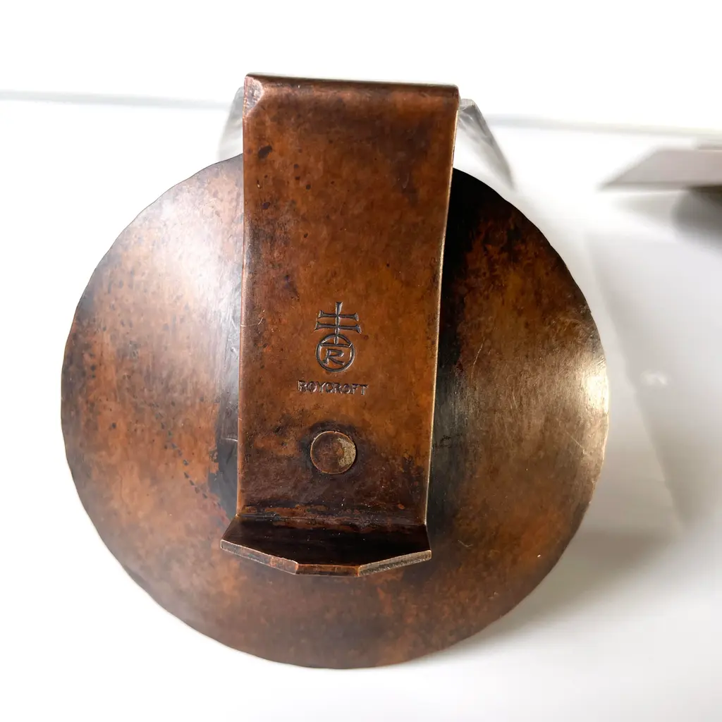 Beautiful pair of Roycroft arts & crafts copper sconces. Marked. Roycroft was a reformist community of craft workers and artists which formed part of the Arts and Crafts movement in the United States. Elbert Hubbard founded the community in 1895, in the village of East Aurora, New York, near Buffalo. Participants were known as Roycrofters. The work and philosophy of the group, often referred to as the Roycroft movement, had a strong influence on the development of American architecture and design in the early 20th century.