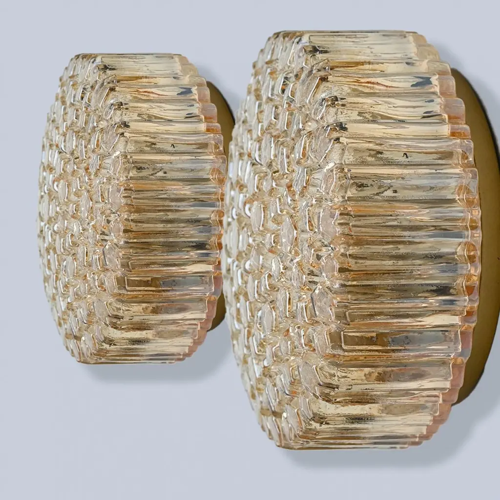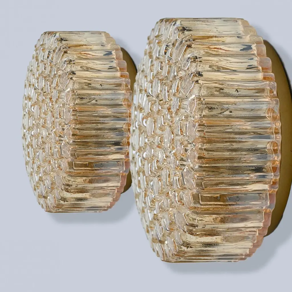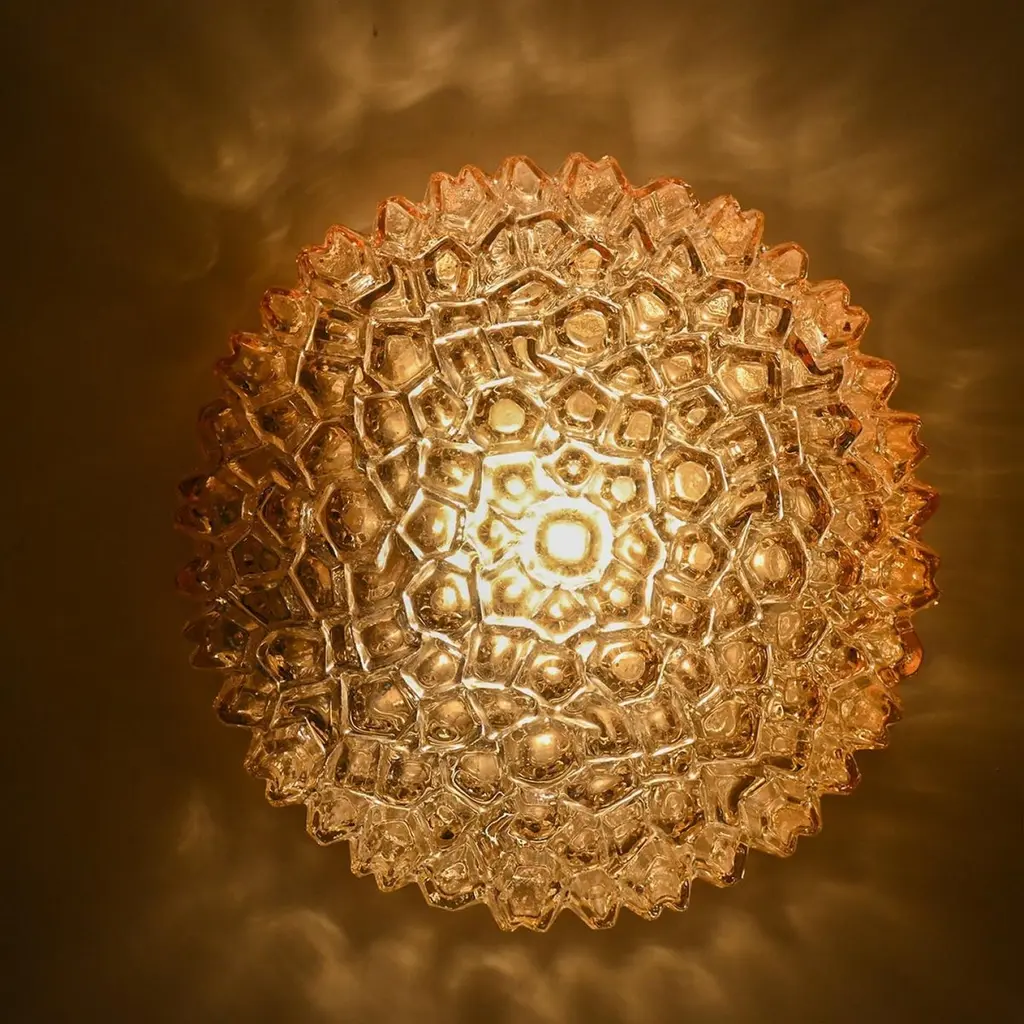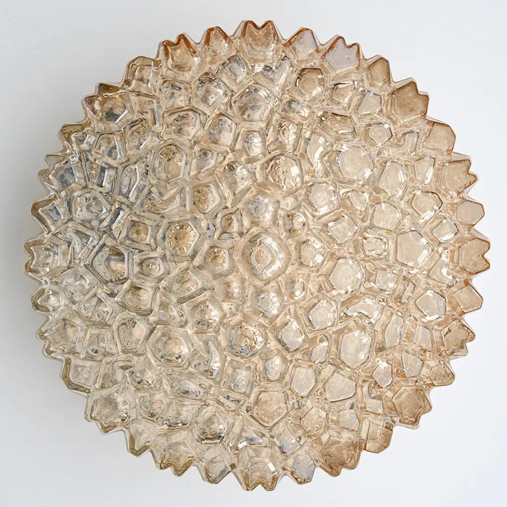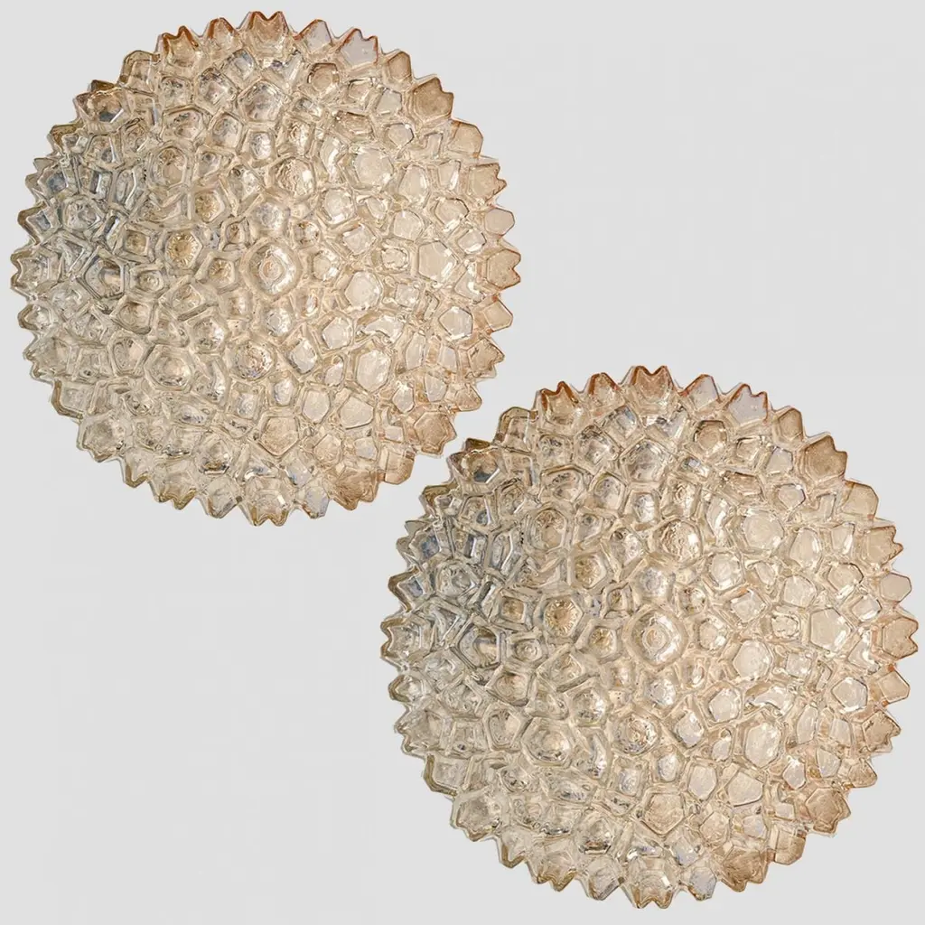 Clear colored textured glass wall light designed in the style of Glashütte Limburg around 1960-1970 in Europe, Germany. The rich textured bubbled glass gives a wonderful glow. There are multiple similarly designed lights available, please check the website for more information.Can be used as wall lights or flush mounts. Please notice the [price is for 1 piece. Several pieces available.Dimensions:Diameter: 7.87" (20 cm)Depth: " ( 10 cm)Cleaned and well-wired, in full working order and ready to use. The brass frame is in very good condition. The wall lights can be disassembled and the glass individually wrapped for easy transport. The fixture requires 1 E27 standard bulb. Also LED compatible.