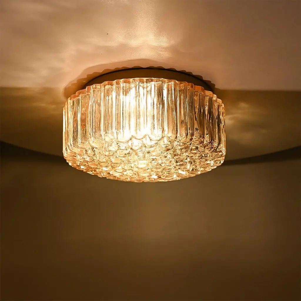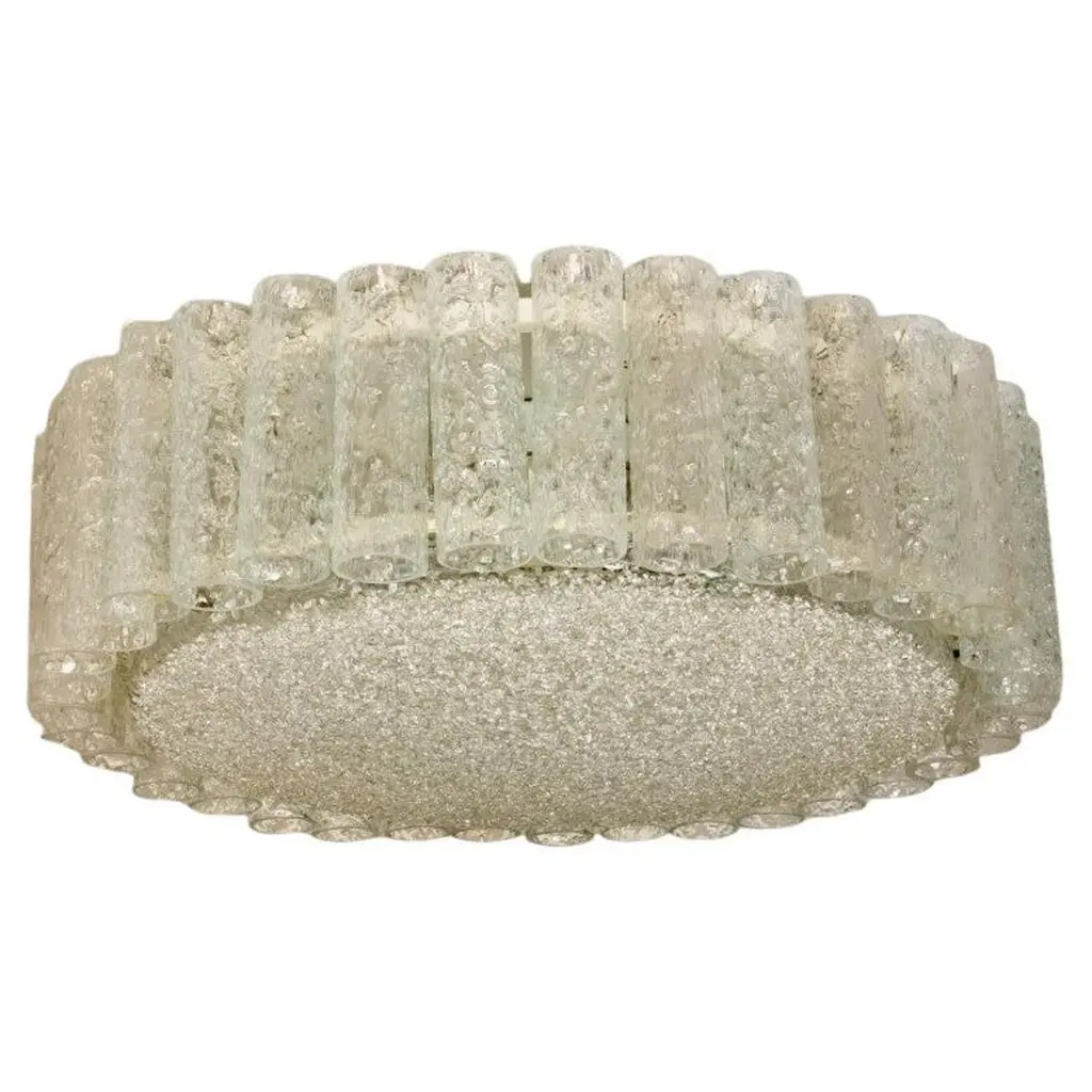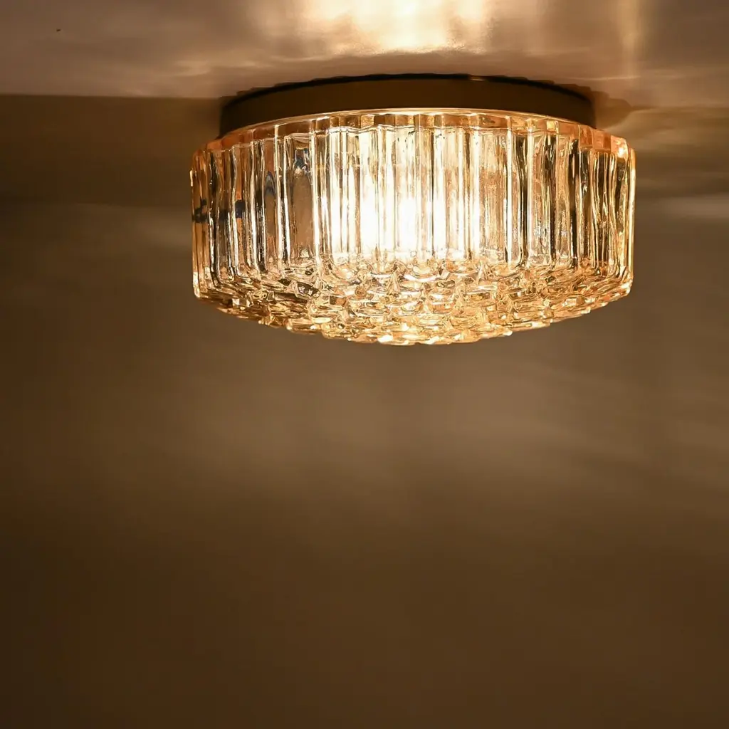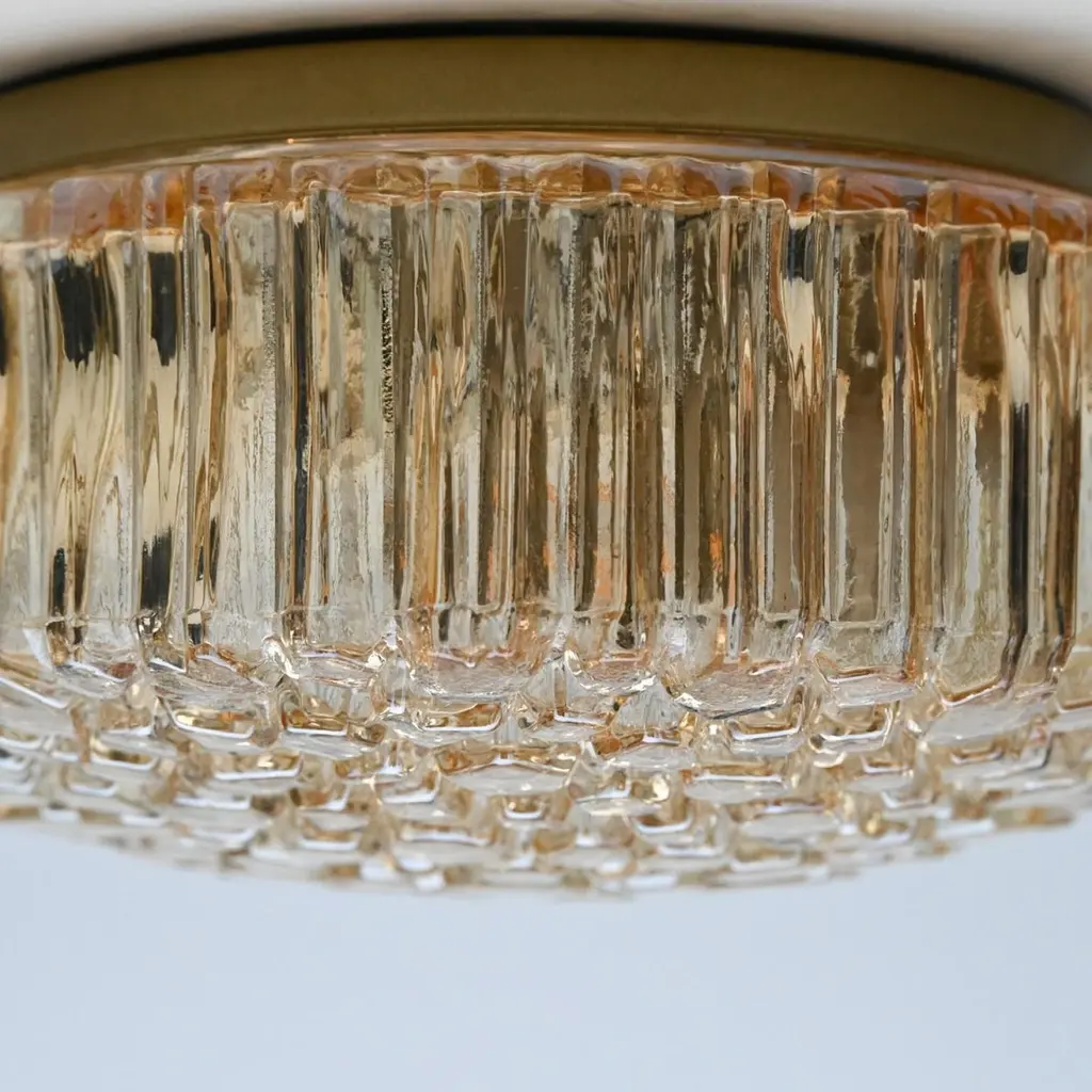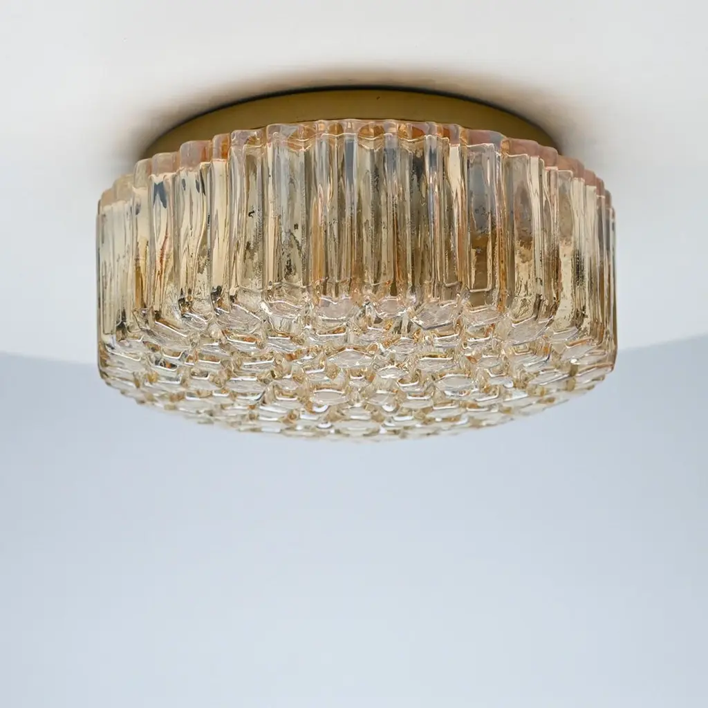 Clear colored textured glass wall light designed in the style of Glashütte Limburg around 1960-1970 in Europe, Germany. The rich textured bubbled glass gives a wonderful glow. There are multiple similarly designed lights available, please check the website for more information.Can be used as wall lights or flush mounts. Please notice the [price is for 1 piece. Several pieces available.Dimensions:Diameter: 7.87" (20 cm)Depth: " ( 10 cm)Cleaned and well-wired, in full working order and ready to use. The brass frame is in very good condition. The wall lights can be disassembled and the glass individually wrapped for easy transport. The fixture requires 1 E27 standard bulb. Also LED compatible.