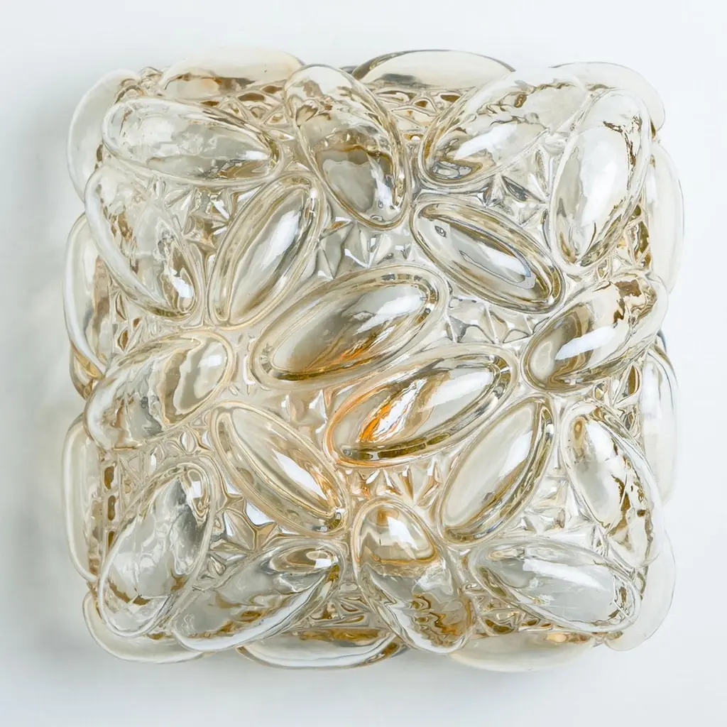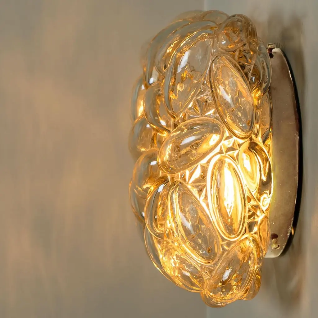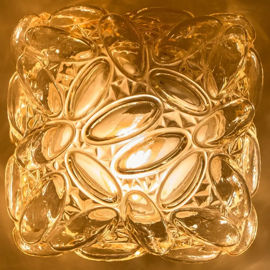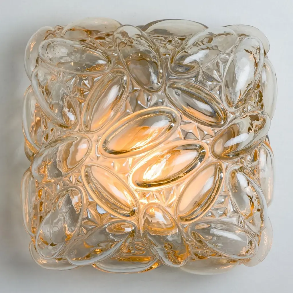 1 of the 2 clear bubble glass wall light designed in the style of Helena Tynell around 1960-1970 in Europe, Germany. The rich textured bubbled glass gives a wonderful glow. The square-shaped glass is mounted on a gold colored metal back plate.Can be used as wall lights or flush mounts.Dimensions:Height: 9.44" (24 cm)Width: 9.44" (24 cm)Depth: 4.72" (12 cm)Cleaned and well-wired, in full working order and ready to use. The brass frame is in very good condition. The wall lights can be disassembled and the glass individually wrapped for easy transport. The fixture requires 1 E27 standard bulb. Also LED compatible.