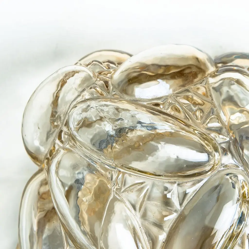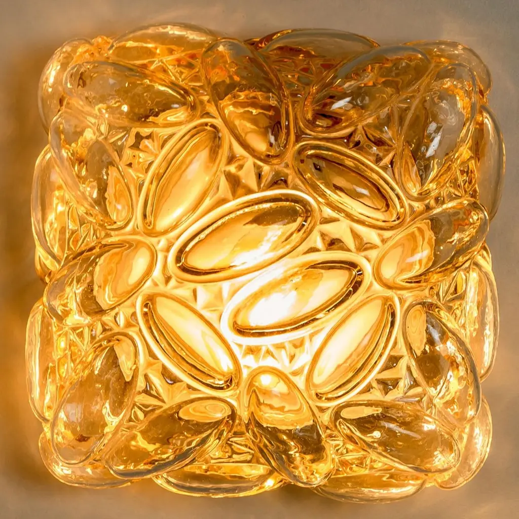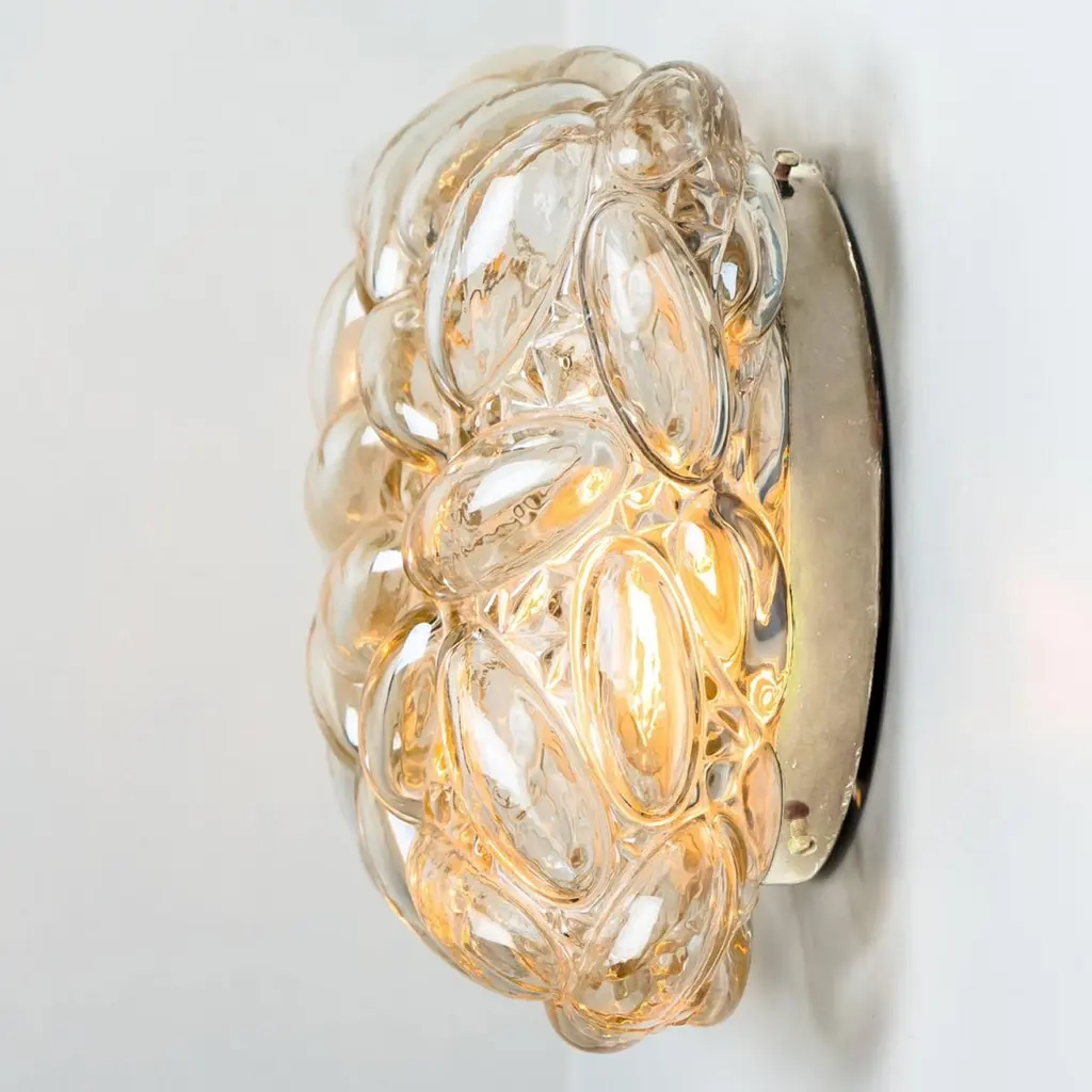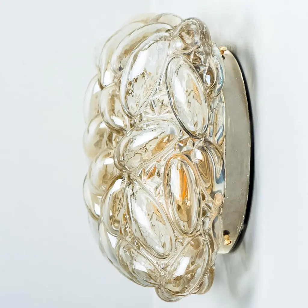 1 of the 2 clear bubble glass wall light designed in the style of Helena Tynell around 1960-1970 in Europe, Germany. The rich textured bubbled glass gives a wonderful glow. The square-shaped glass is mounted on a gold colored metal back plate.Can be used as wall lights or flush mounts.Dimensions:Height: 9.44" (24 cm)Width: 9.44" (24 cm)Depth: 4.72" (12 cm)Cleaned and well-wired, in full working order and ready to use. The brass frame is in very good condition. The wall lights can be disassembled and the glass individually wrapped for easy transport. The fixture requires 1 E27 standard bulb. Also LED compatible.