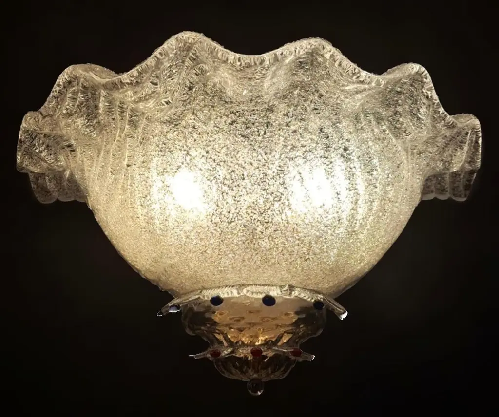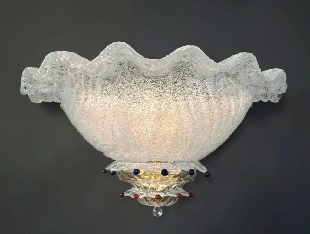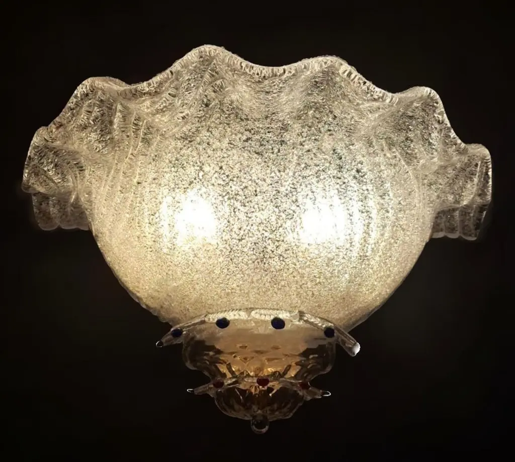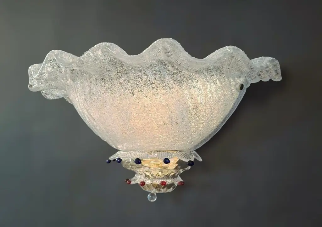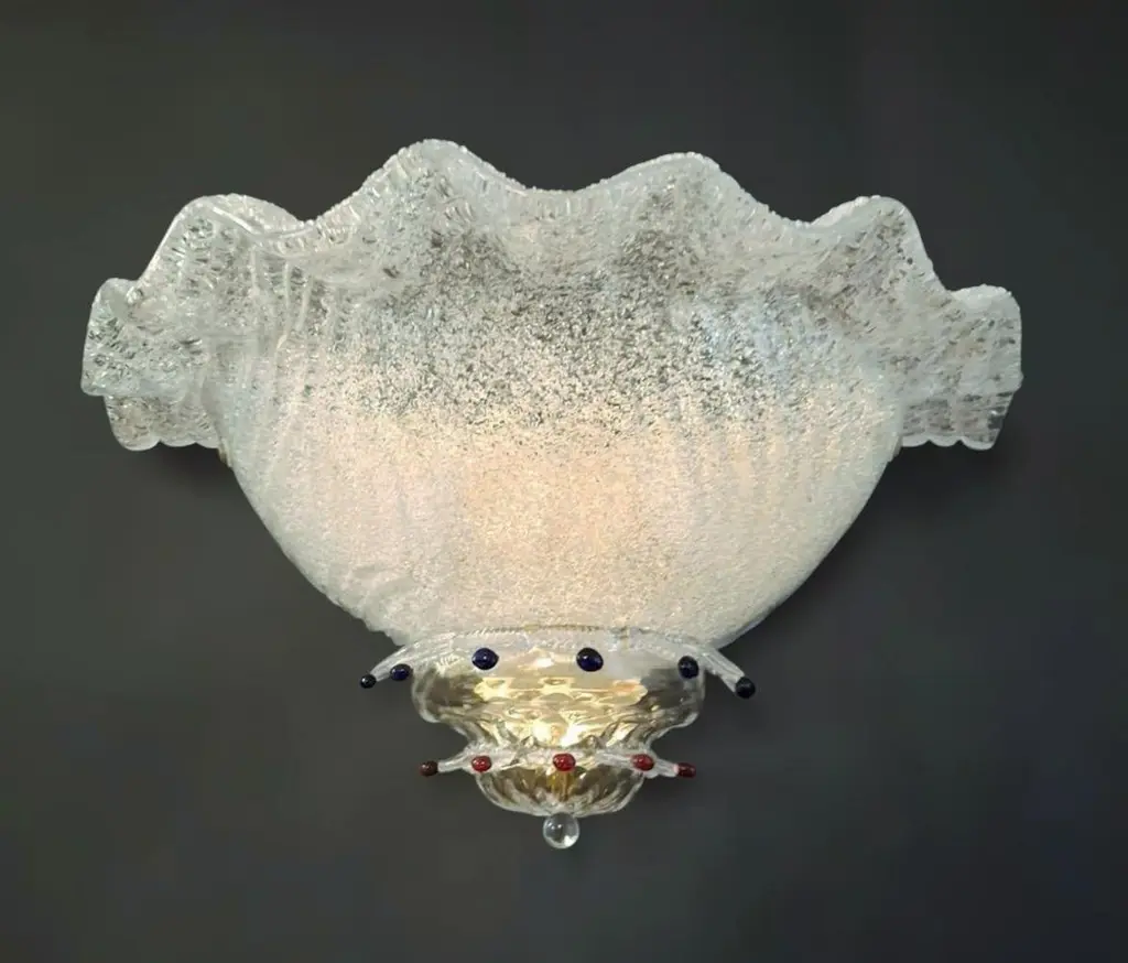 Vintage Italian wall light with clear Murano glass shades hand blown using graniglia technique, decorated with blue and red glass buttons, mounted on brass frames / Made in Italy in the style of Barovier e Toso, circa 1970sMeasures: width 18 inches / Height 8.5 inches / Depth 9 inches2 lights / E12 or E14 type / max 40W each2 pairs available in stock in Italy, price listed is for each pairplease note the light bulb direction is different for each pairOrder reference #: FABIOLTD K156