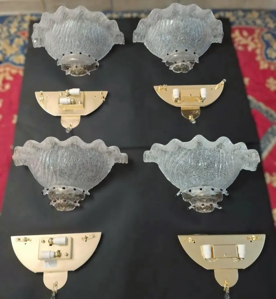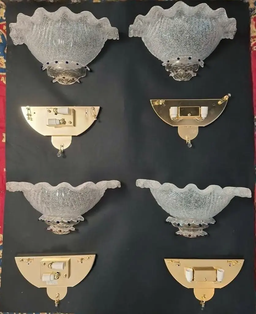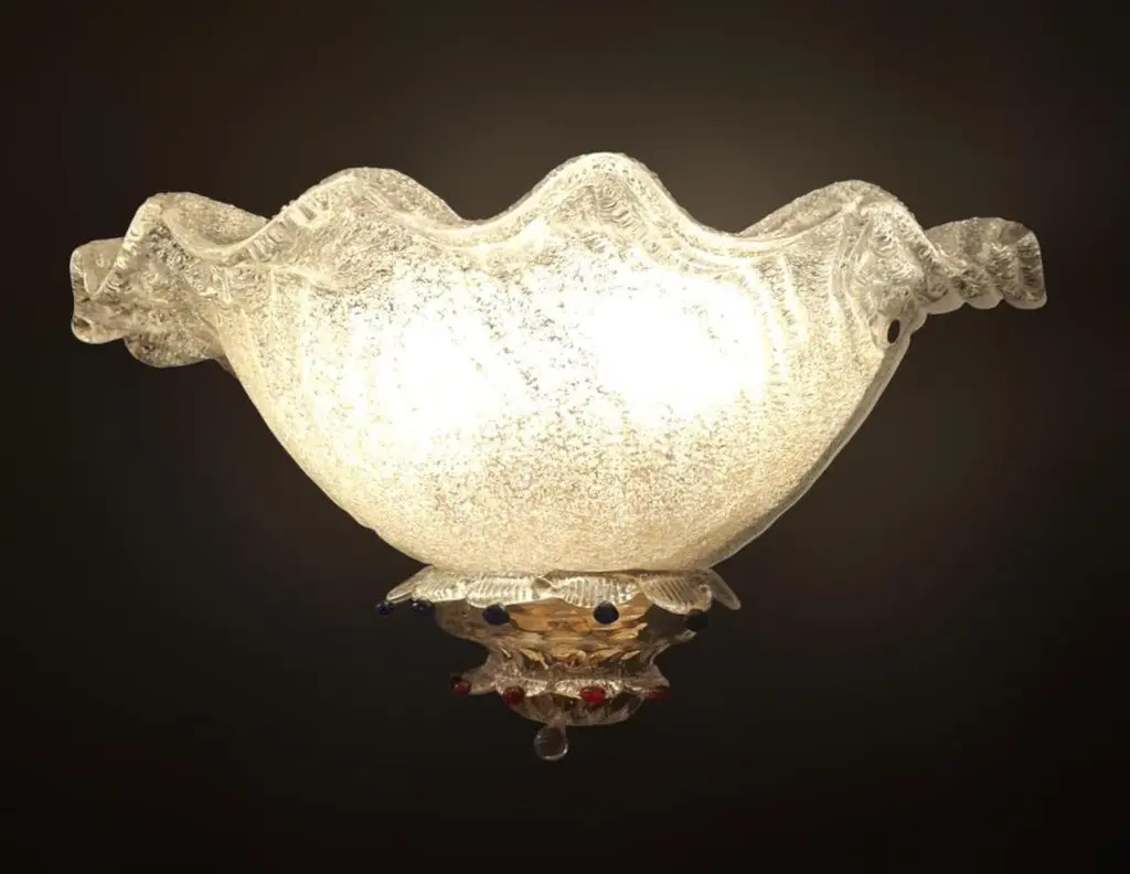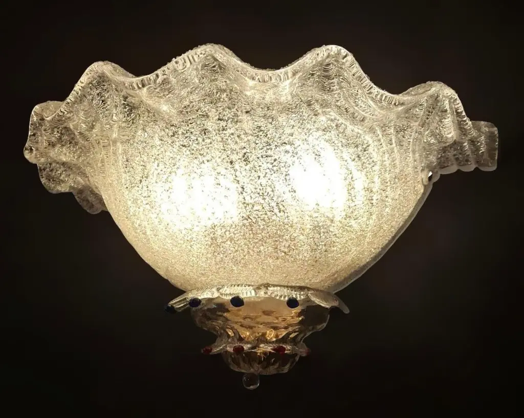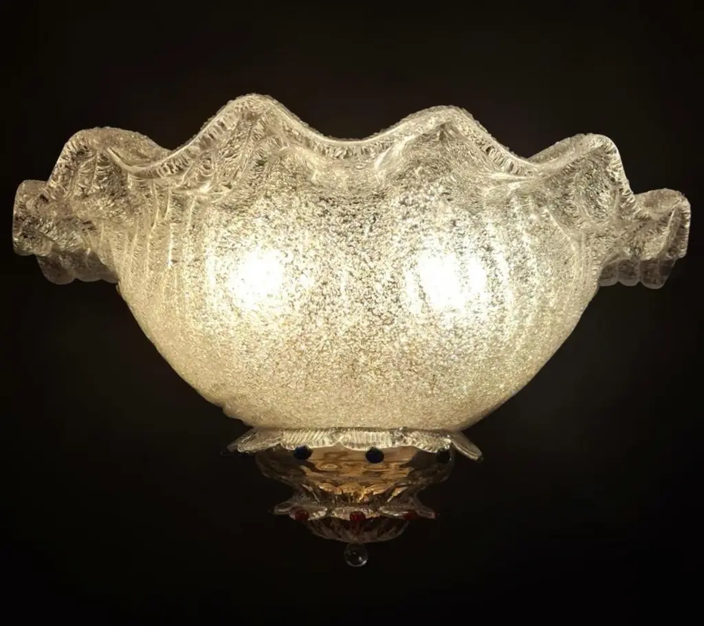 Vintage Italian wall light with clear Murano glass shades hand blown using graniglia technique, decorated with blue and red glass buttons, mounted on brass frames / Made in Italy in the style of Barovier e Toso, circa 1970sMeasures: width 18 inches / Height 8.5 inches / Depth 9 inches2 lights / E12 or E14 type / max 40W each2 pairs available in stock in Italy, price listed is for each pairplease note the light bulb direction is different for each pairOrder reference #: FABIOLTD K156
