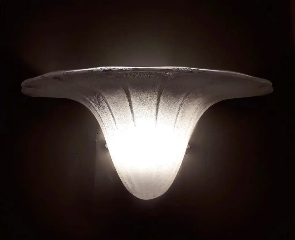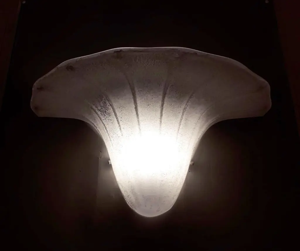 Vintage oversized Italian wall lights with frosted Murano glass shades infused with silver flecks / made in Italy by Seguso, circa 1960sOriginal sticker on glassMeasures: height 8 inches, width 20.5 inches, depth 11 inches1 light / E26 or E27 type / max 60W2 pairs available in stock in Italy, price is for each pair.