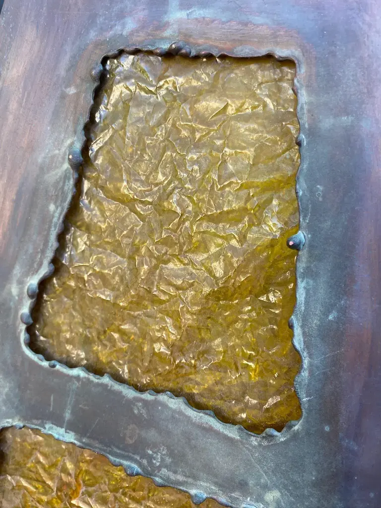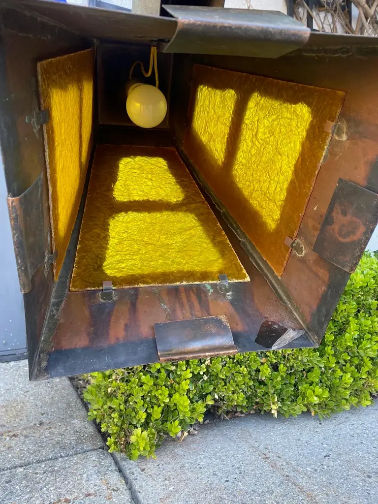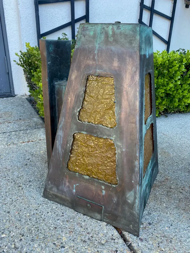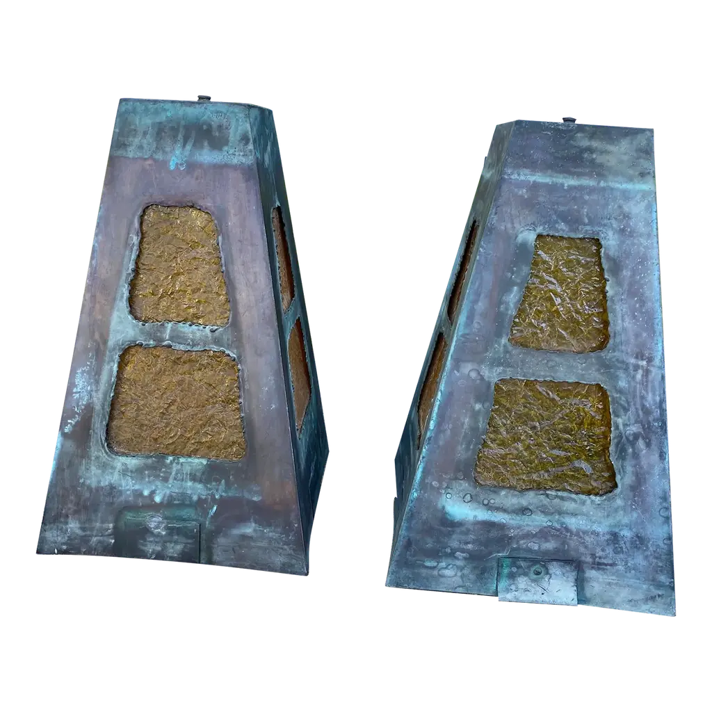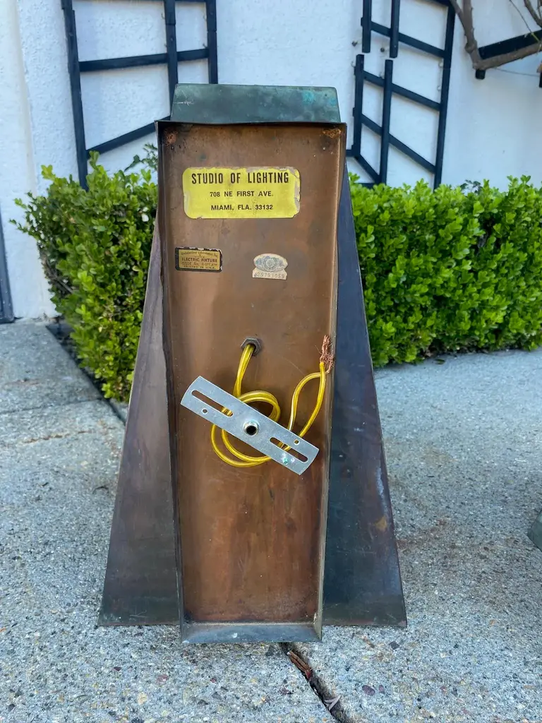 Pair of Vintage Studio of Lighting Copper Brutalist Sconces Backplate: 4 5/8"W x 15 5/8"H x 3/4" Shade: 5 1/2"W at top, 11"W at bottom 13" projection 18 1/4"H The source of this piece is unknown, but we curate from a variety of estate sales, acquisitions, flea markets and more to bring unique items to your home! less
