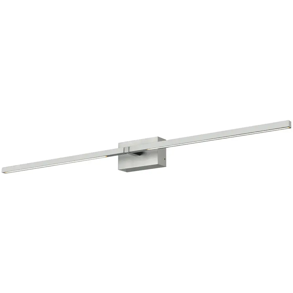 Dual square profile linear aluminum arms with rectangular wall mount. Inset opal polymeric diffusers. Finely textured plate or powder-coated finish. Wall emitting lights with rotational adjustment.