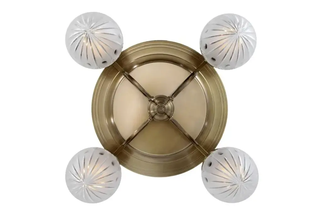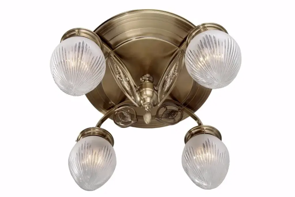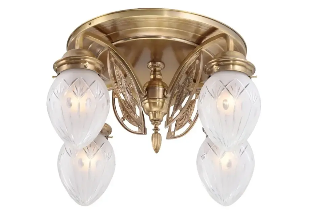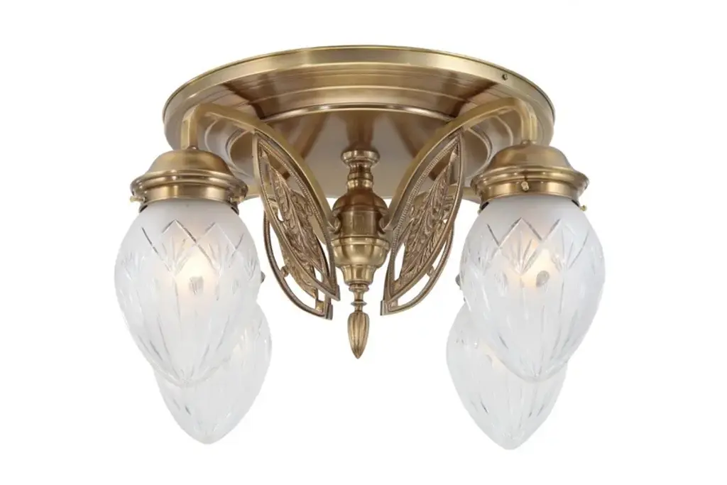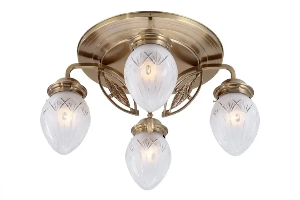Pannon 4 is a ceiling lamp made of brass available in different finishes.Finishes: Antique, Shiny brass, Matt brass, Shiny nickel, Matt nickelCapacity : 4x75 W E27Due to their lightweight bodies, the lamps of this collection are a perfect solution for those looking for richness, opulence and lightness in one lamp. The chandeliers are all fitted with conical or egg-shaped carved shades. The chandeliers and the matching wall light are adorned with simple leaf motives, while the pendant gets as minimalistic as possible.