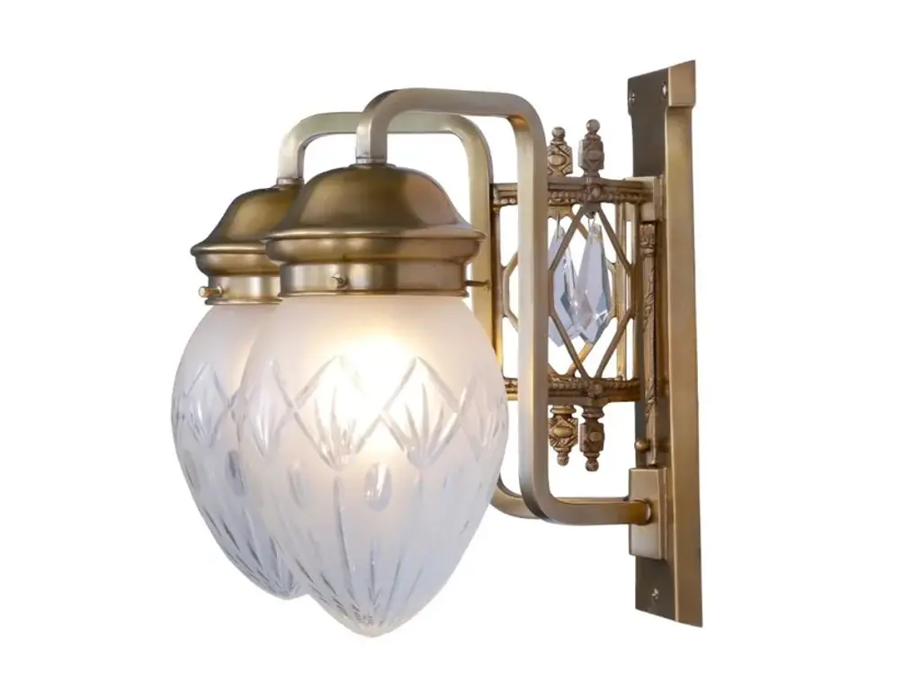 Pannon II is a wall lamp made of brass available in different finishes.Finishes: Antique, Shiny brass, Matt brass, Shiny nickel, Matt nickelCapacity : 2x75 W E27Due to their lightweight bodies, the lamps of this collection are a perfect solution for those looking for richness, opulence and lightness in one lamp. The chandeliers are all fitted with conical or egg-shaped carved shades. The chandeliers and the matching wall light are adorned with simple leaf motives, while the pendant gets as minimalistic as possible.
