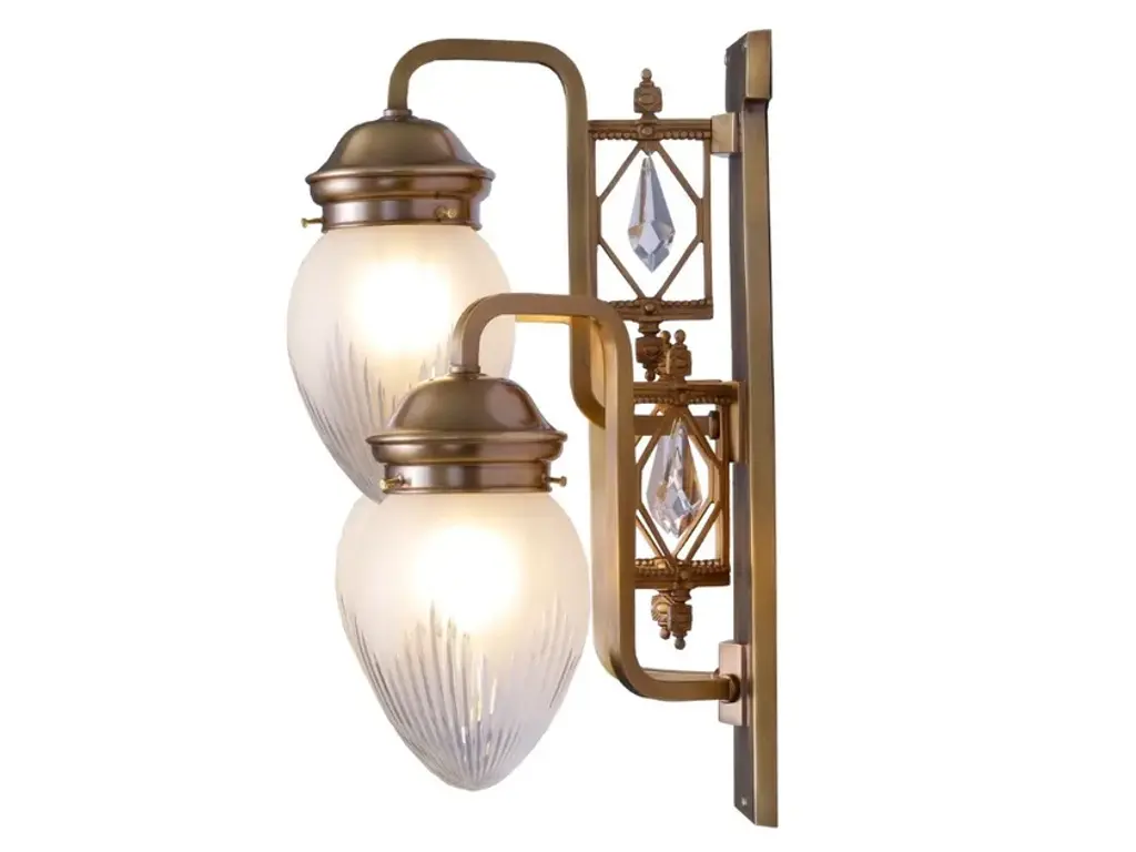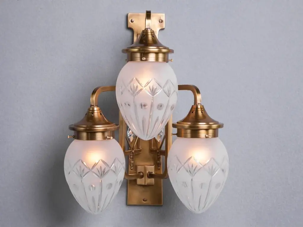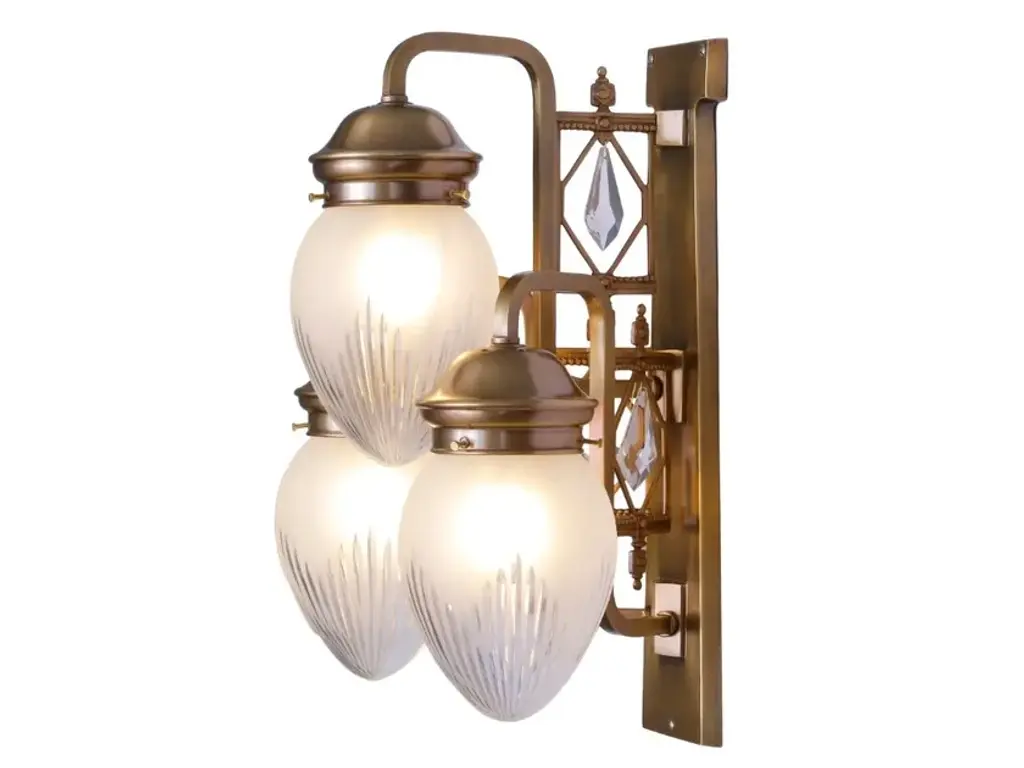 Pannon III is a wall lamp made of brass available in different finishes.Finishes: Antique, Shiny brass, Matt brass, Shiny nickel, Matt nickelCapacity : 3x75 W E27Due to their lightweight bodies, the lamps of this collection are a perfect solution for those looking for richness, opulence and lightness in one lamp. The chandeliers are all fitted with conical or egg-shaped carved shades. The chandeliers and the matching wall light are adorned with simple leaf motives, while the pendant gets as minimalistic as possible.