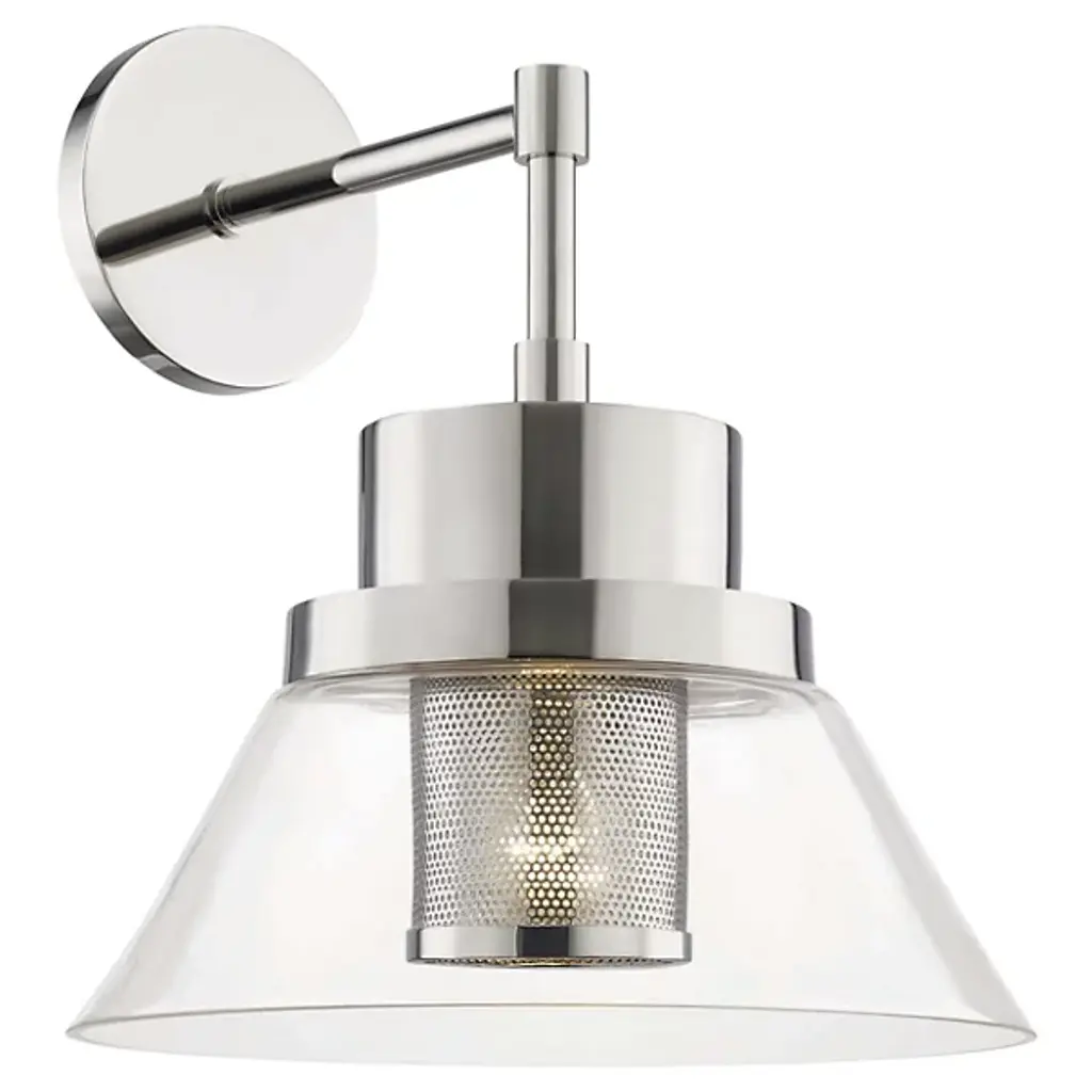 Defined by a chic industrial aesthetic, the Paoli Wall Sconce complements contemporary and traditional styles. The modern Steel and Glass design by Hudson Valley Lighting features a stepped cylinder top with a mesh diffuser and a Clear Glass tapered shade. Suitable for damp locations, the versatile wall light provides an added layer of lighting in a modern farmhouse kitchen or eye-pleasing task lighting alongside a bathroom vanity mirror.