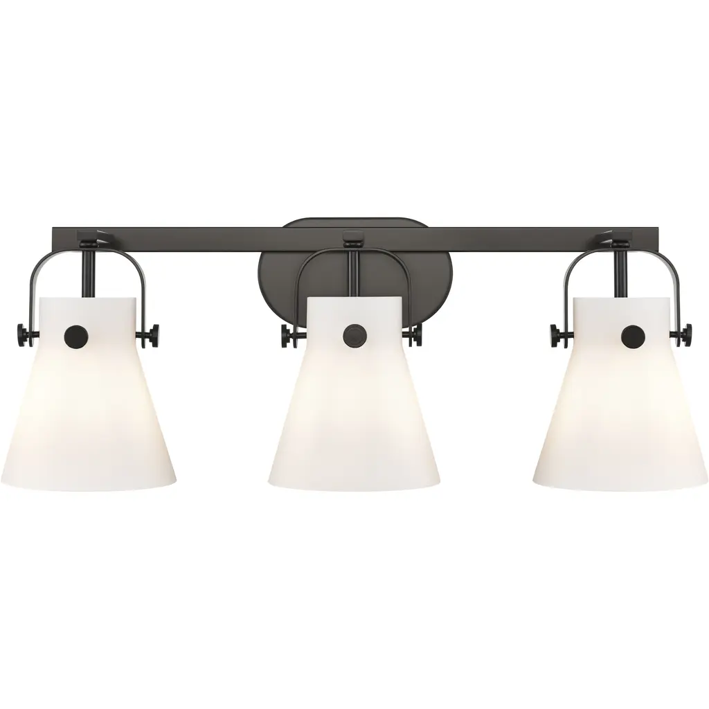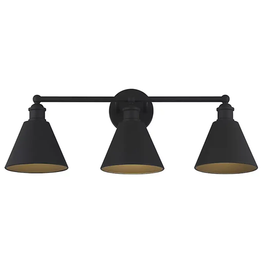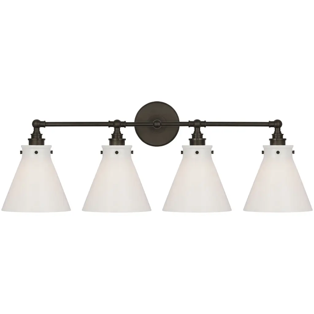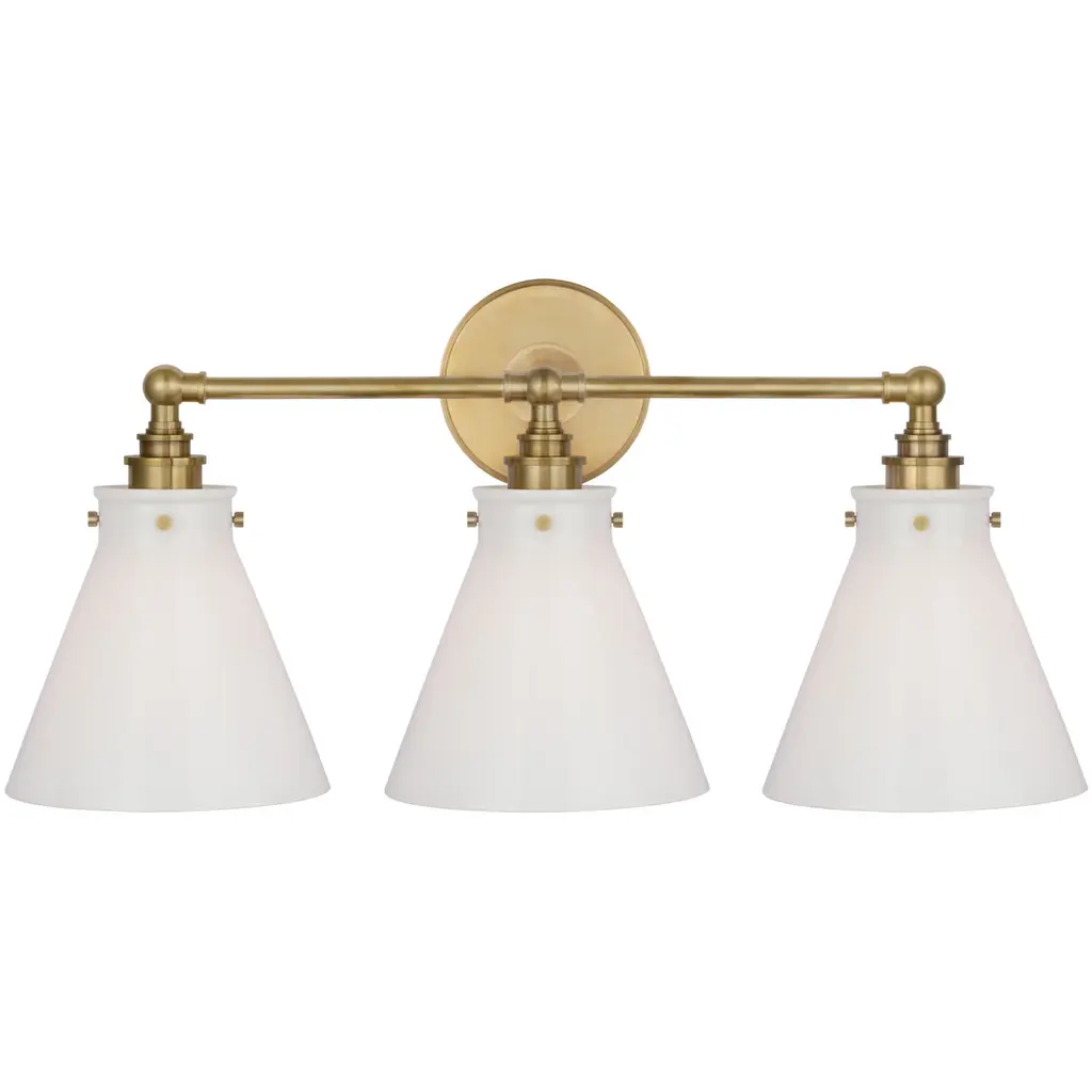 The Parkington Bath Bar from Visual Comfort Signature presents a tasteful vintage character enhanced by fulsome functionality. A circular wall plate offers ample security for the fixture, extending a slender bar across its center and setting three downward-facing and damp-rated socket housings along it. Excellent when positioned above a bathroom mirror, conical glass shades surround each lamp, muting glare to the sides and transmitting a mix of focused downlight and radiant warmth below.
