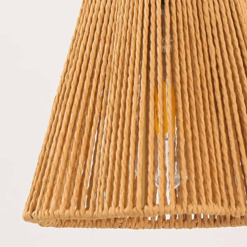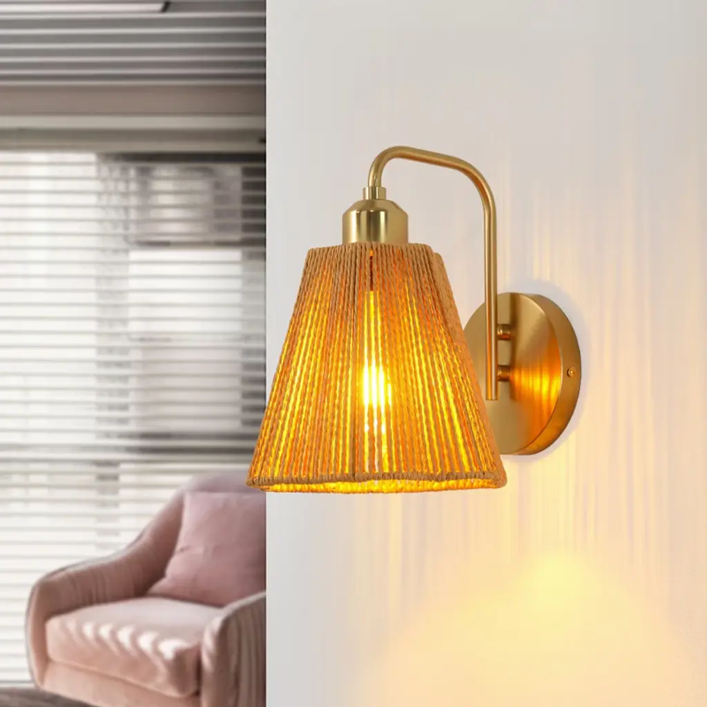 This 9-inch rustic wall lamp infuses any space with warmth and a sense of artistry through its natural and dynamic design. The open shade structure balances aesthetics with practicality, leaving ample space at the top or sides for easy bulb replacement without disassembling the entire structure, greatly enhancing its convenience for daily use. The lamp finish is clad in gold-plated ironwork, making it suitable for indoor settings such as balconies, gardens, porches, and cafes. When lit, the woven rope texture casts soft, dappled shadows, resembling natural vines dancing with the light, creating a warm and soothing pastoral atmosphere. Whether used as functional lighting or as a decorative accent, this wall lamp perfectly blends natural aesthetics with practical functionality, adding a touch of simple yet elegant poetry to life.
