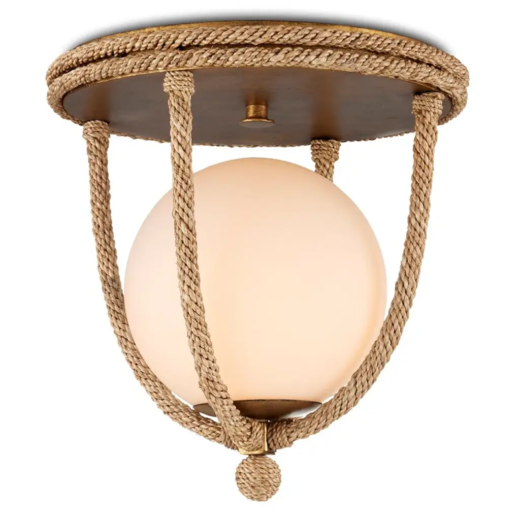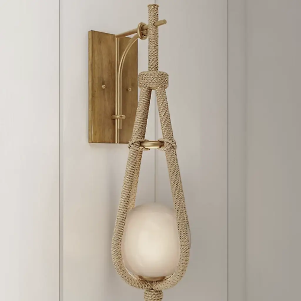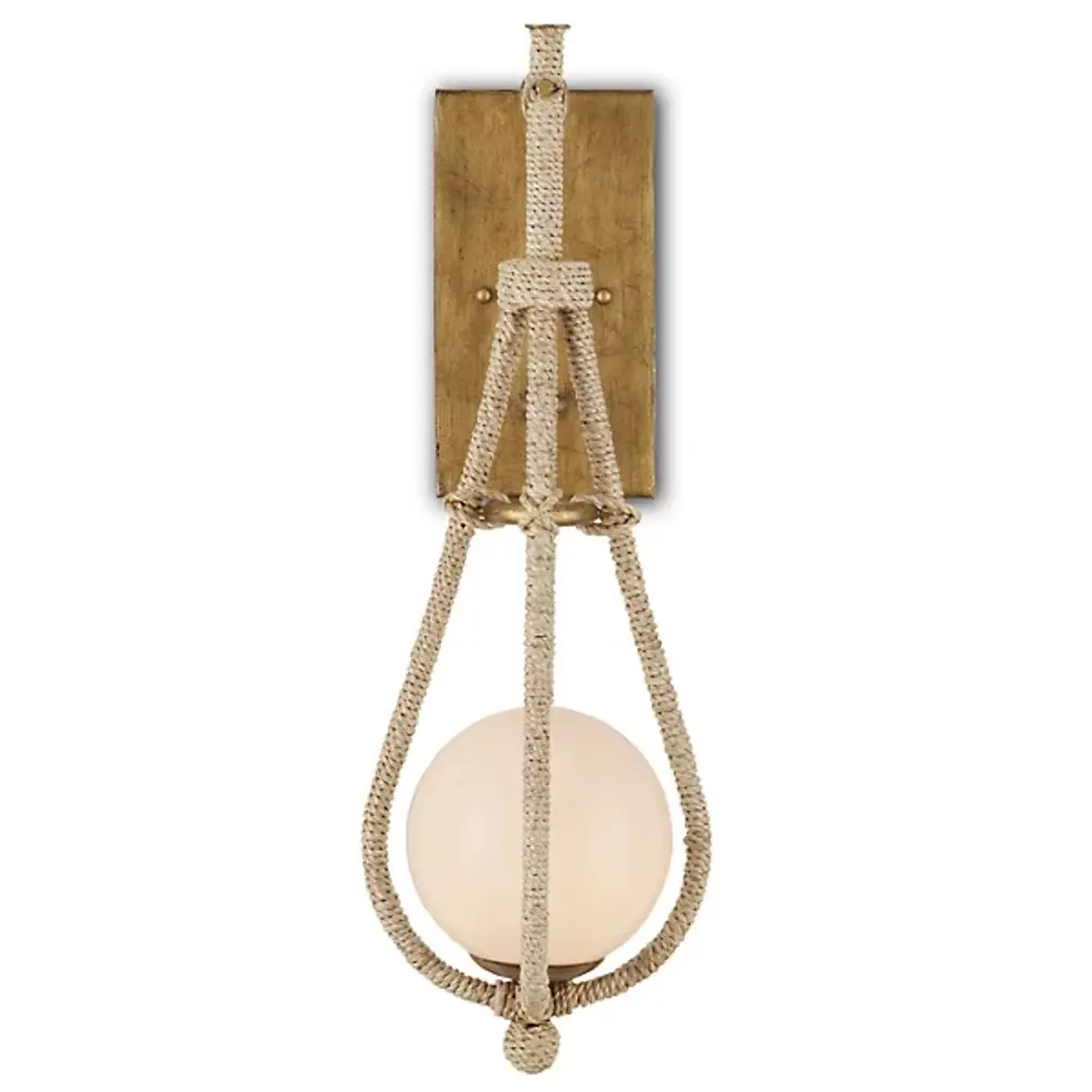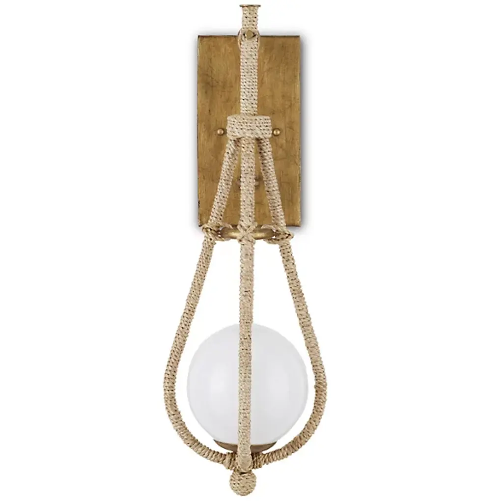 The Passageway Wall Sconce by Currey & Company exemplifies a fine mix of Transitional, Coastal, and Nautical styles to create a captivating lighting fixture. Designed by Clarence Mallari, it exemplifies elegance with layered details and texture. The design features a metallic finish on the wall plate, a central ring, and a cup holding the frosted glass globe. A cleverly dangling abaca rope-wrapped structure creates an expressive pear-shaped appeal. At the same time, a removable bottom finial allows for easy bulb replacement beneath the translucent glass shade, bringing warmth and coastal elegance to any space.