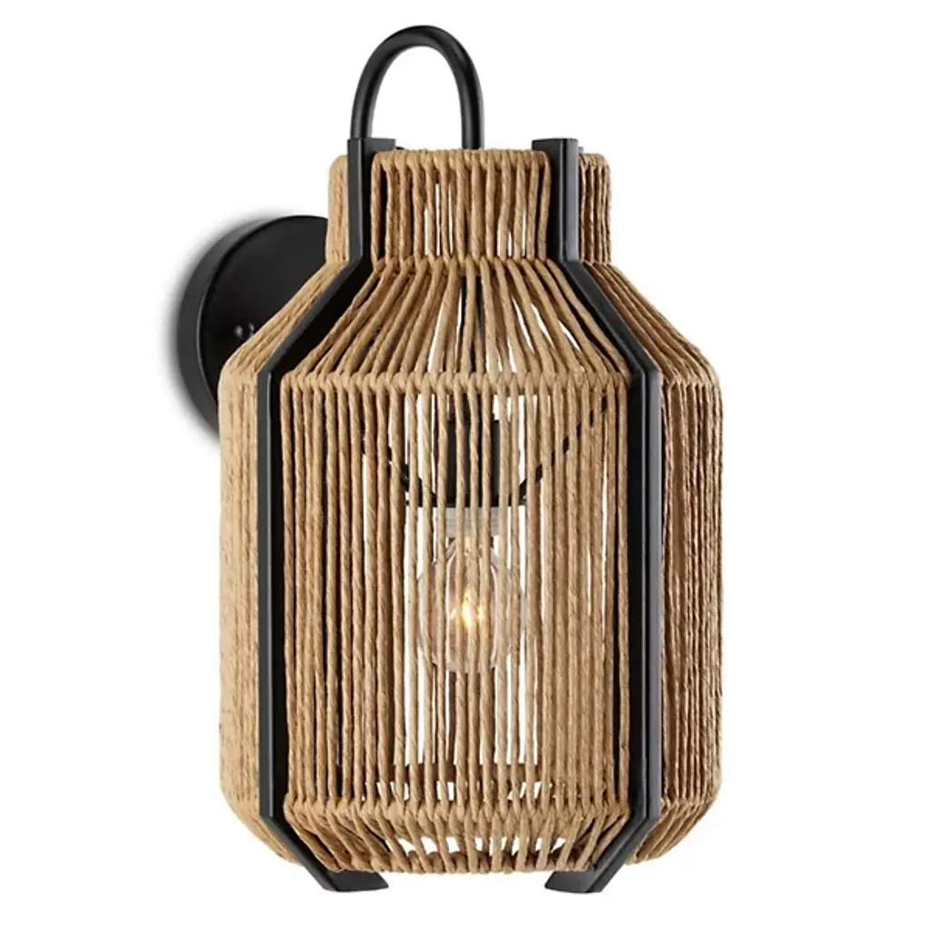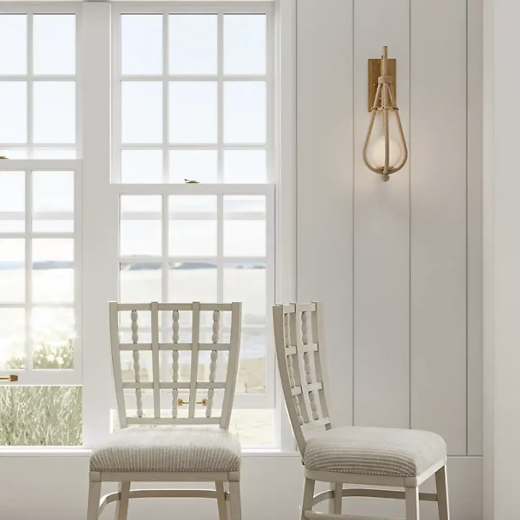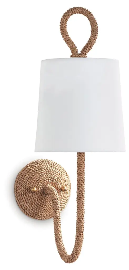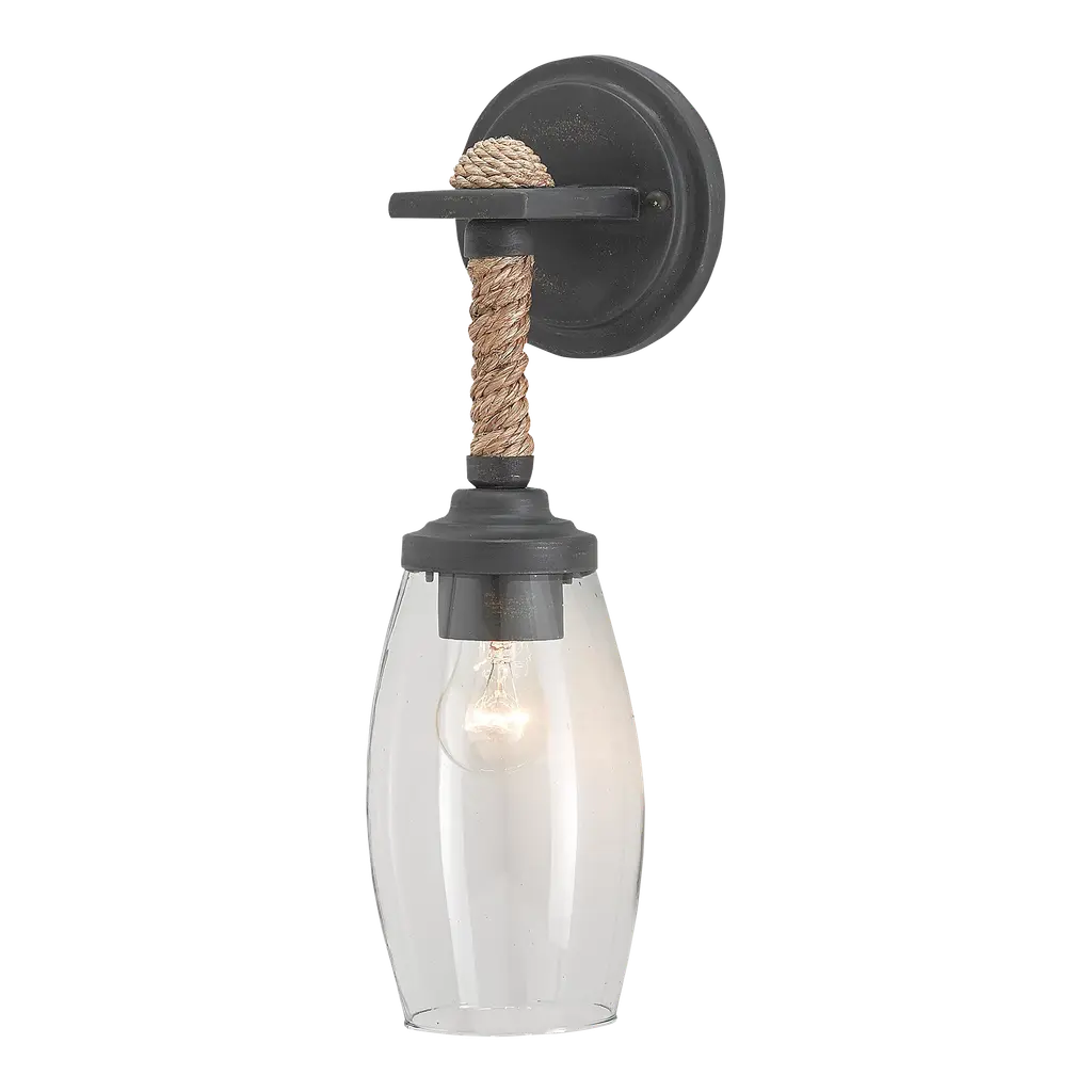 The Passageway Wall Sconce by Currey & Company exemplifies a fine mix of Transitional, Coastal, and Nautical styles to create a captivating lighting fixture. Designed by Clarence Mallari, it exemplifies elegance with layered details and texture. The design features a metallic finish on the wall plate, a central ring, and a cup holding the frosted glass globe. A cleverly dangling abaca rope-wrapped structure creates an expressive pear-shaped appeal. At the same time, a removable bottom finial allows for easy bulb replacement beneath the translucent glass shade, bringing warmth and coastal elegance to any space.