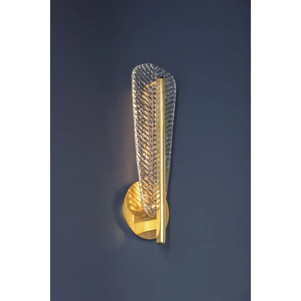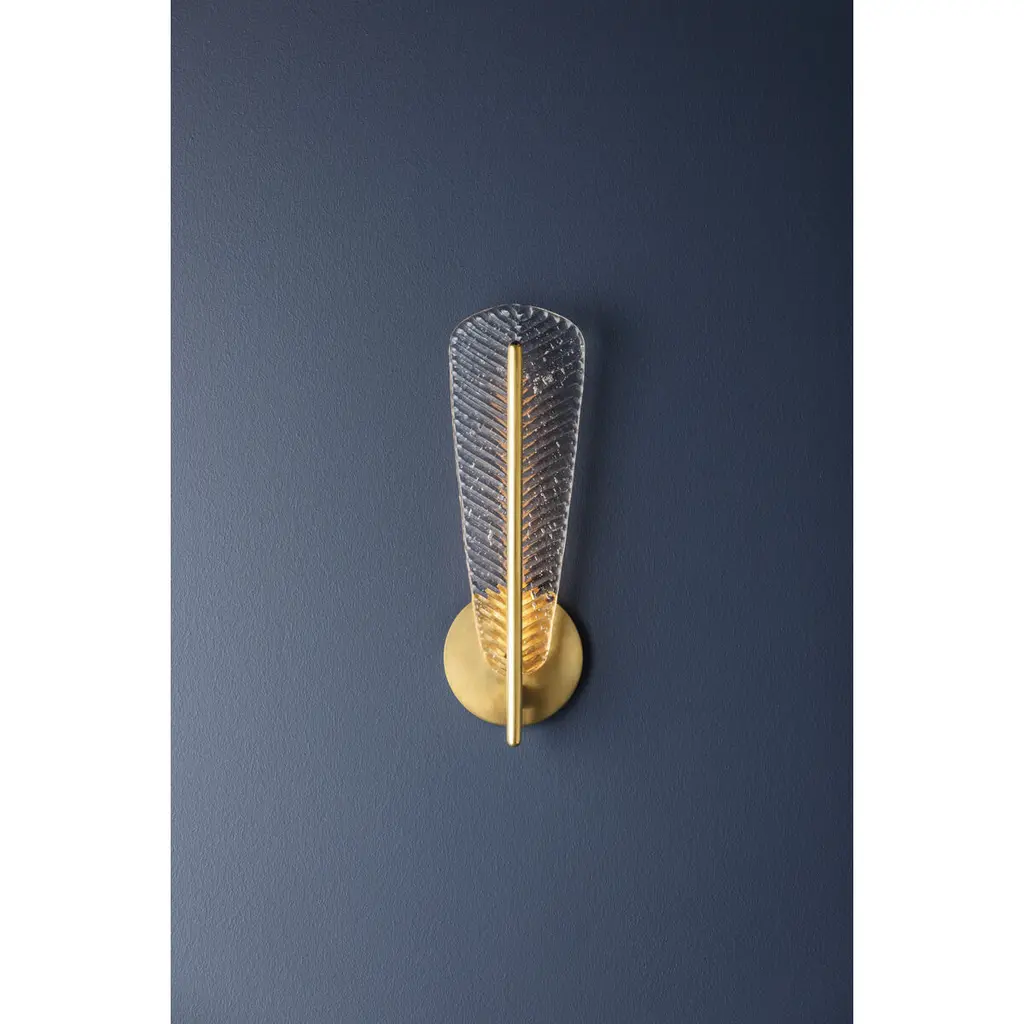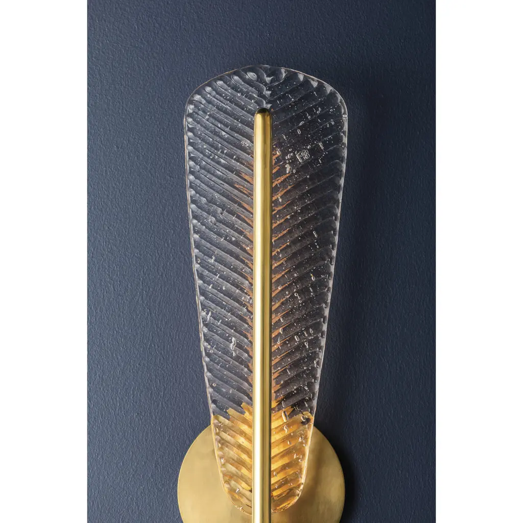 A delicate and slender hand-blown piece of Piastra glass is mounted on an Aged Brass ‘stem,’creating the focal point of this botanical-inspired sconce. Resembling a leaf, the glass has beencrafted with grooves that replicate the natural texture and variation of leaves. Concealing anLED, this sconce gently diffuses light over small areas.*Due to the one-of-a-kind nature of the medium, exact colors and patterns may vary slightly fromthe image shown.
