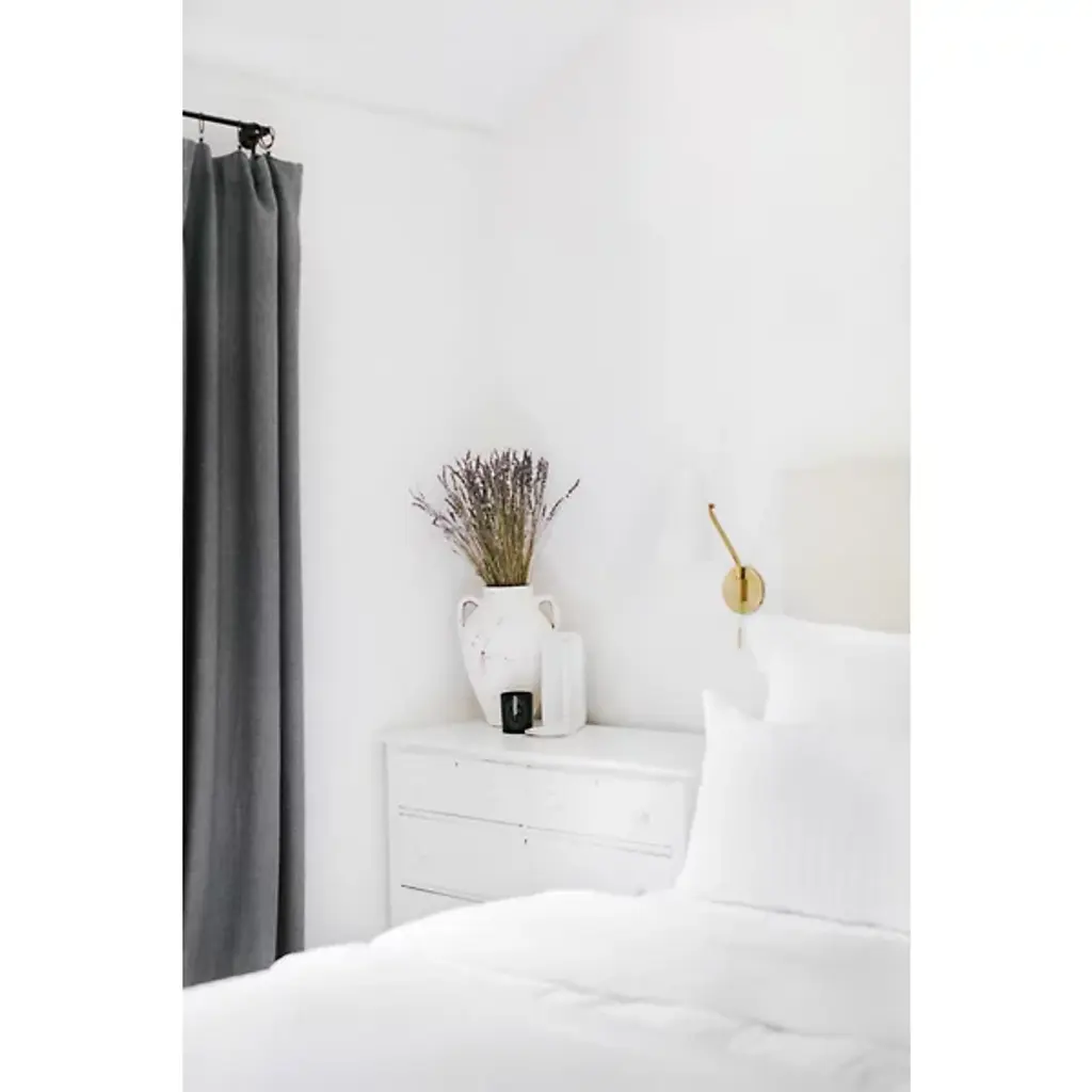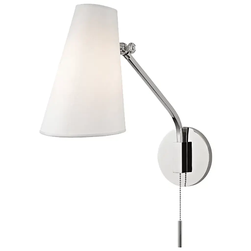 The stylish Pattern Wall Sconce by Hudson Valley Lighting brings a modern aesthetic to your home. With its funneled silk shade, light is guided downwards to illuminate surfaces, countertops, and other areas mired in darkness. Its sleek metal stem angles down and curves into a holder (with an on/off pull chain) that is then mounted to a circular wall plate. This altogether clean design makes a perfect living room or bedside reading lamp.