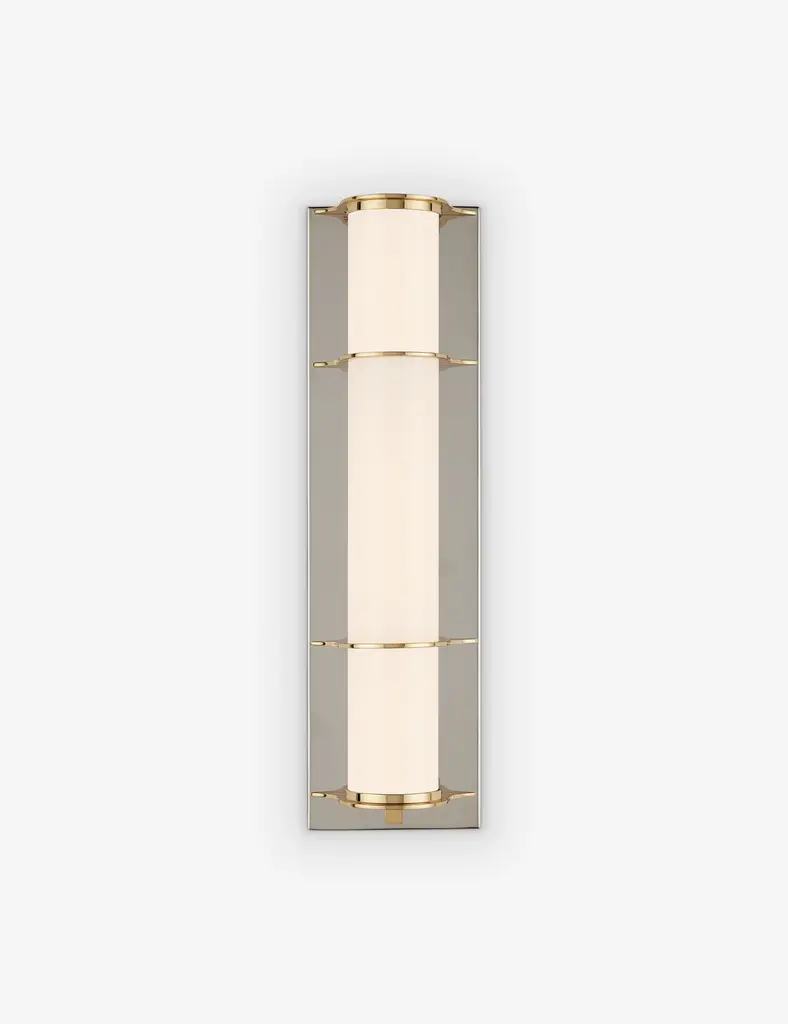 The Payson sconce is a chic nod to vintage bath lighting. A milky glass tube rests within a sleek metal frame, backed by a streamlined wallplate for contrast. We love this wall sconce for flanking mirrors in both modern and transitional bathrooms.