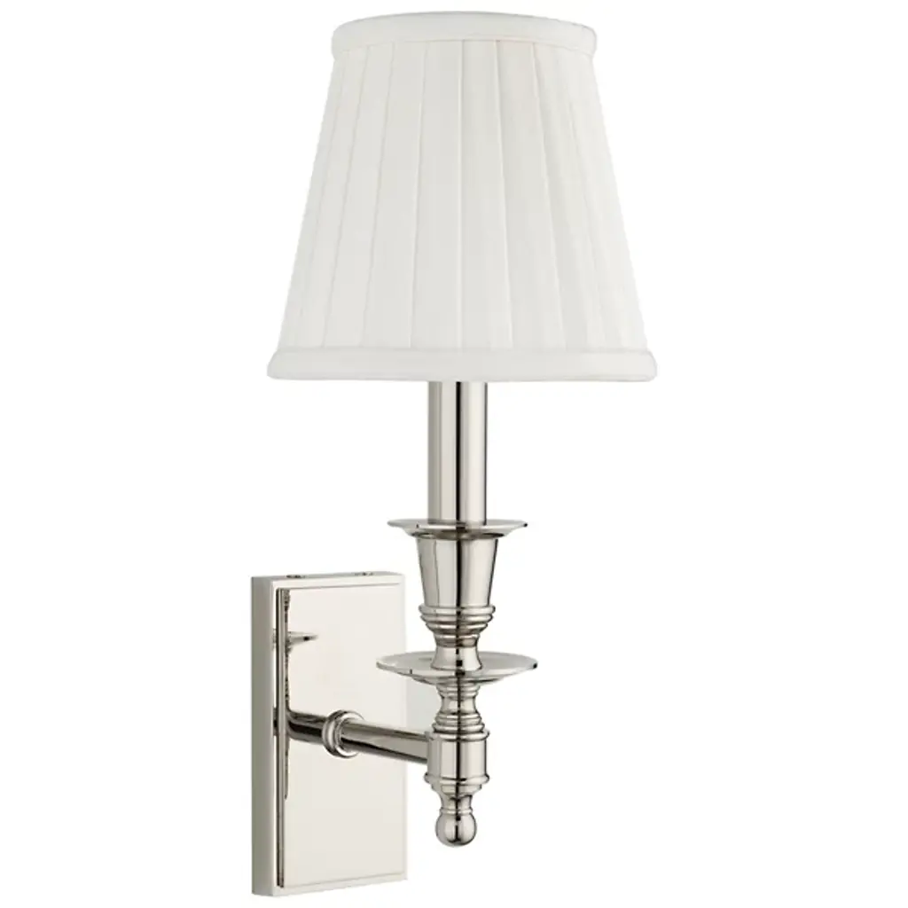 Classically elegant, this brass sconce flaunts a shapely stem and beveled backplate. A pleated silk shade with rolled edges ties in the look. Hardwired.
