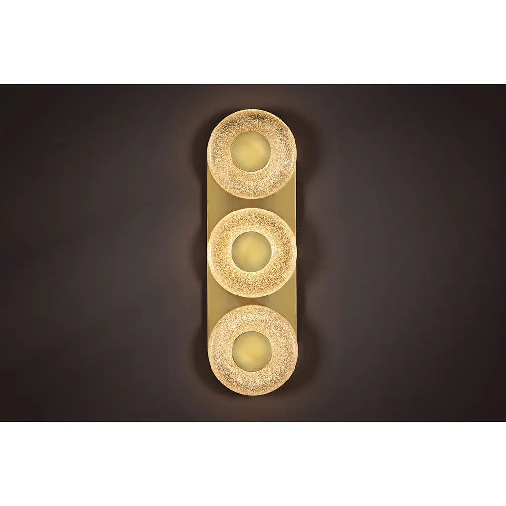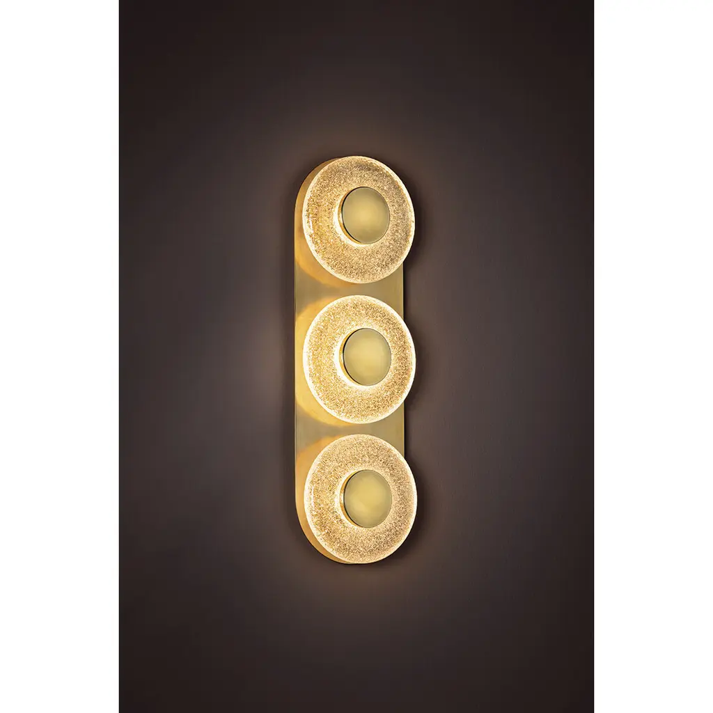 Combining simple shapes, a slim profile and luxe materials to make a big impact, this modern design features thick circles of clear cast glass displayed around rings of Vintage Brass or Polished Nickel. The glass is lit from behind, highlighting the chill marks and adding texture and gorgeous refraction. The three- and five-light sconces can be mounted vertically or horizontally for even more versatility.