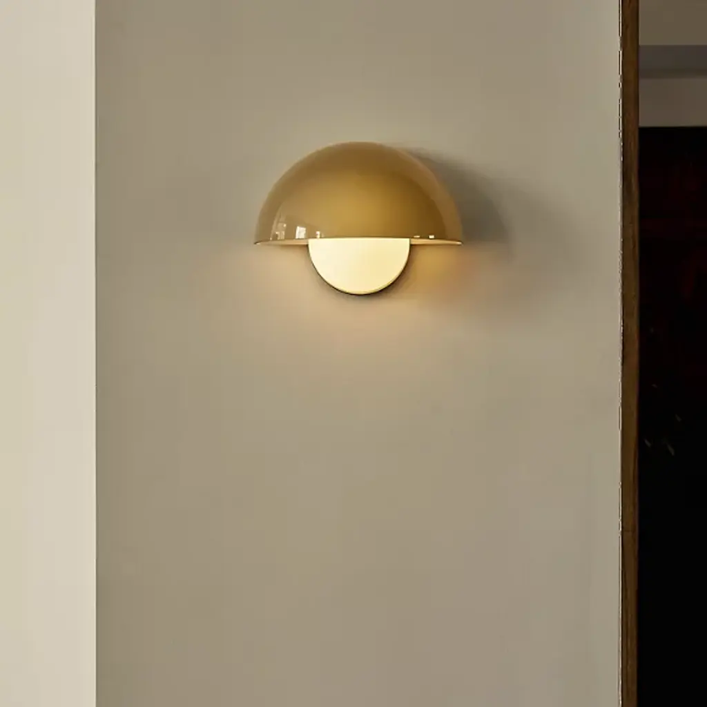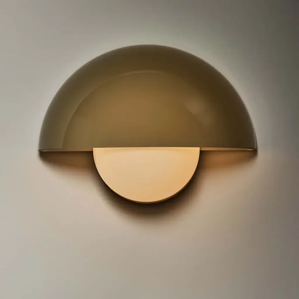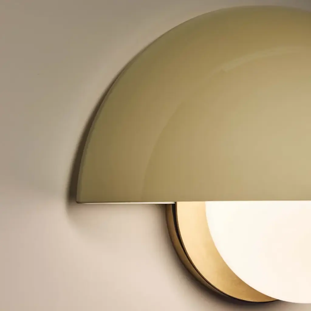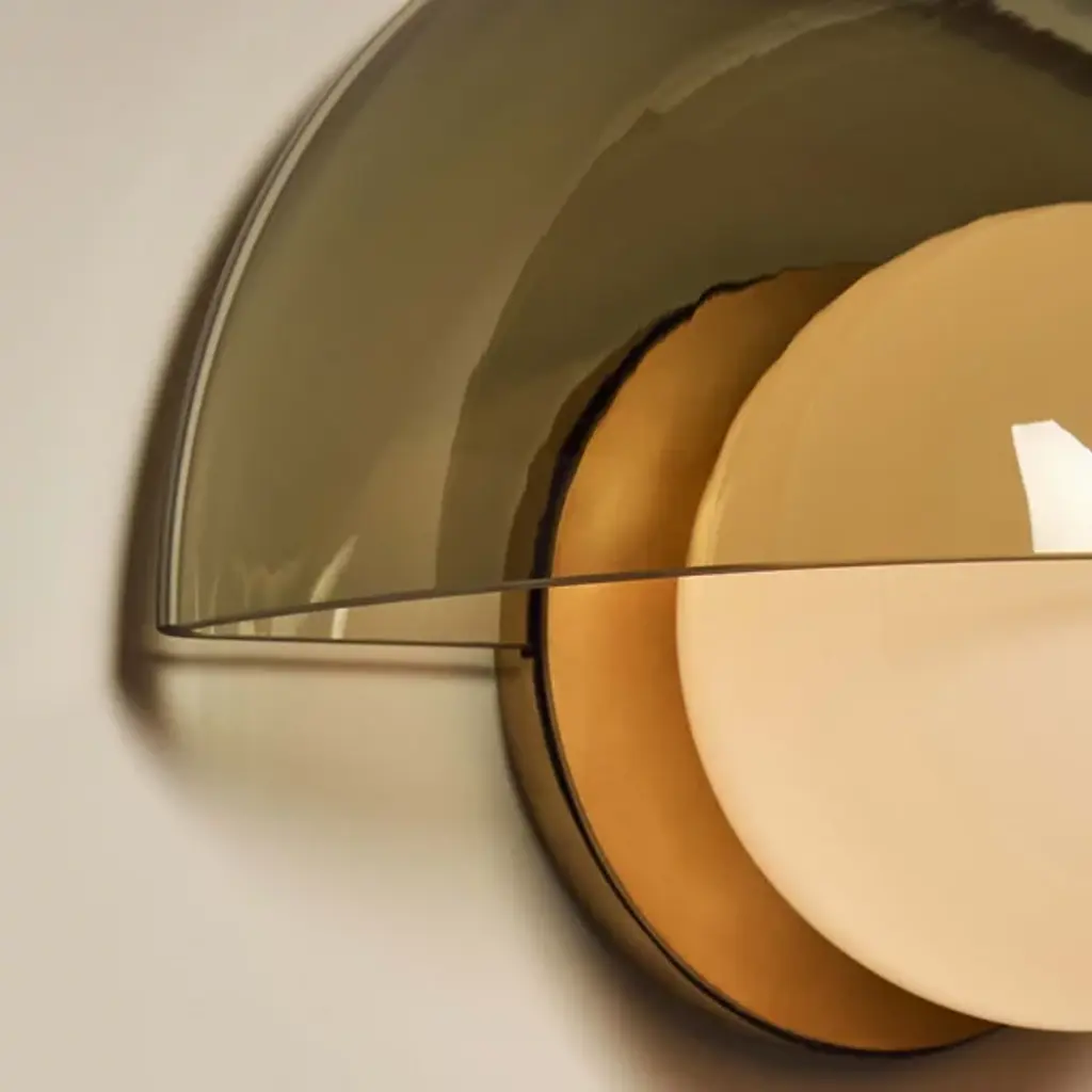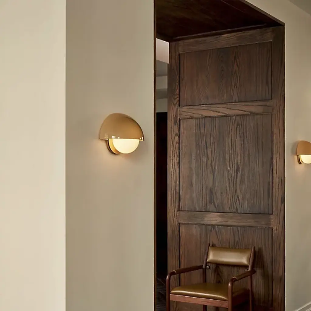 Pearl LED Wall Sconce from Roll & Hill leverages 1980s elegance to shape inside walls with curving, layered forms. A rich brass and glass construction that echoes the stylized form of an oyster shell, the LED lamping takes on the form and place of a pearl inside a curving pocket of handblown Italian glass, giving the fixture an expressive form with an opulent feel. Anchored by a brass disc, the round inner glass diffuser cheekily peeps out from the partial shell shade above, almost winking as it illuminates with a mix of warm ambiance over a radiant wall wash.