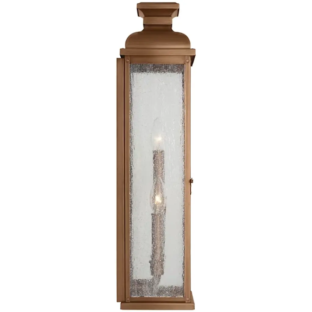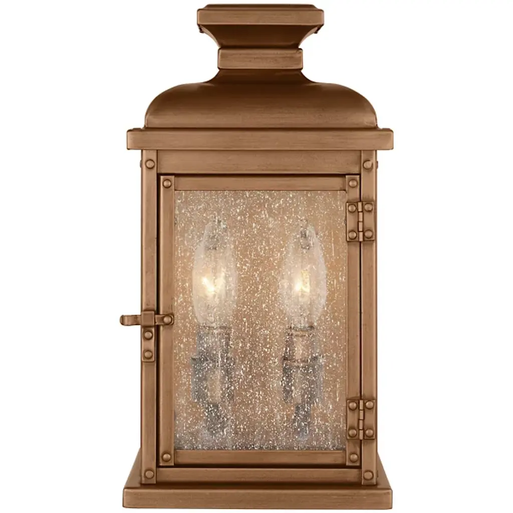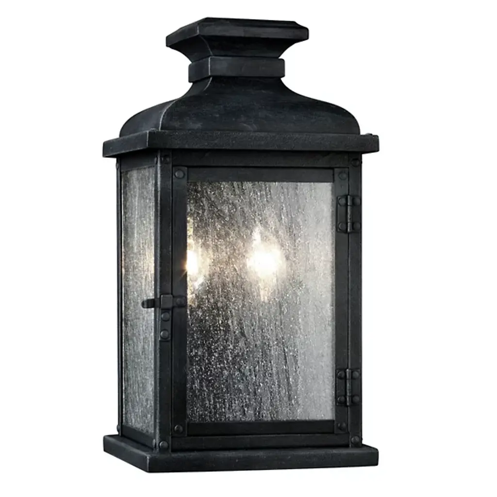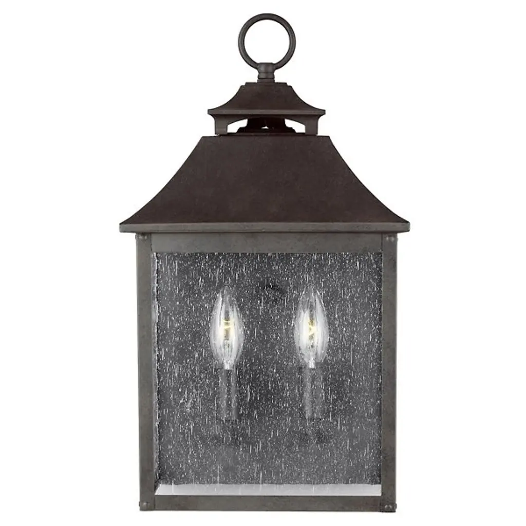 Bring the dark, austere character of London street lanterns to your wall. The Pediment Outdoor Wall Sconce by Visual Comfort Studio, formerly known as Sean Lavin, does just that, with a distinctively Industrial character and the robust construction found in contemporary pieces. The outdoor wall sconce is framed by a Dark Weathered Zinc frame shaped like a rectangle, which holds a shade made of various rectangular pieces of Clear Seeded Glass. Two sockets suitable for candelabra bulbs are included inside the shade, adding to the piece’s vintage look.