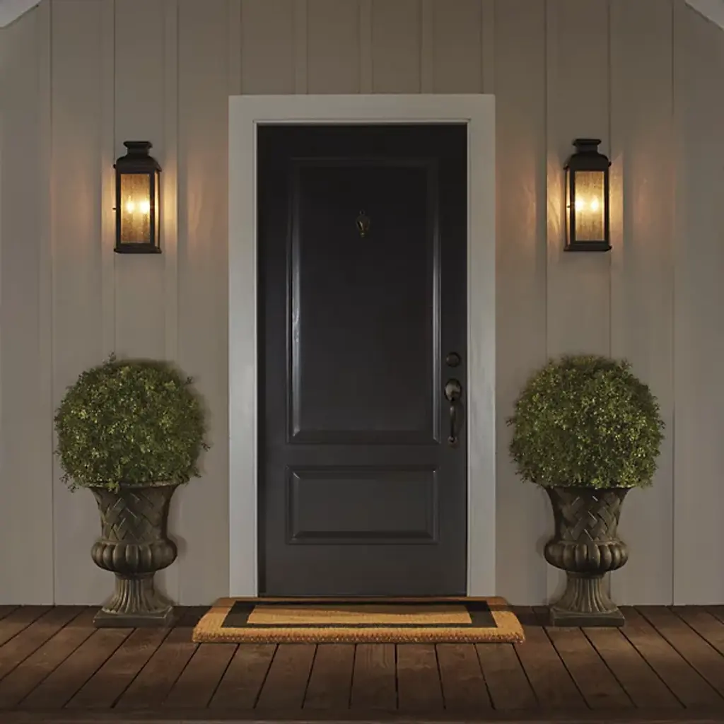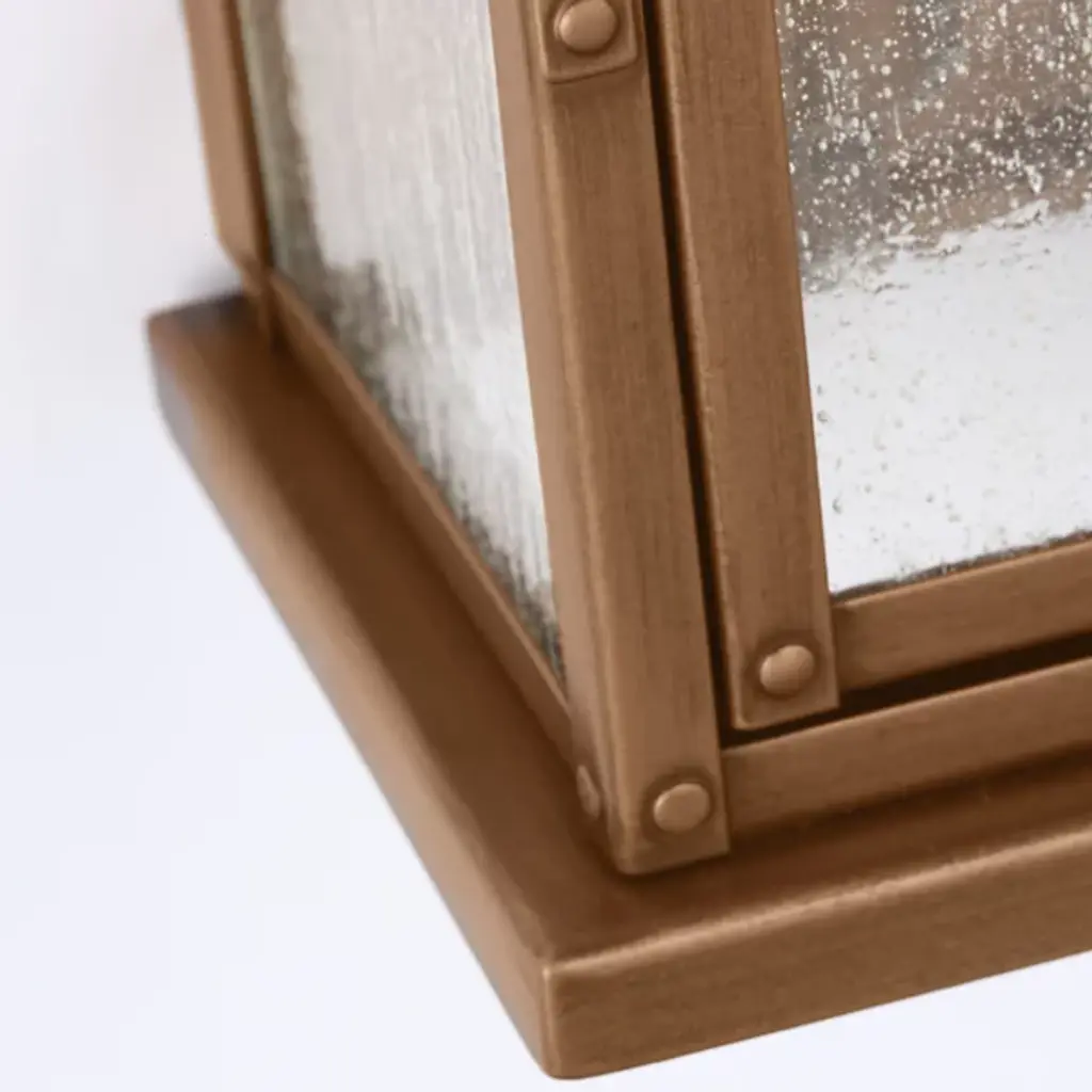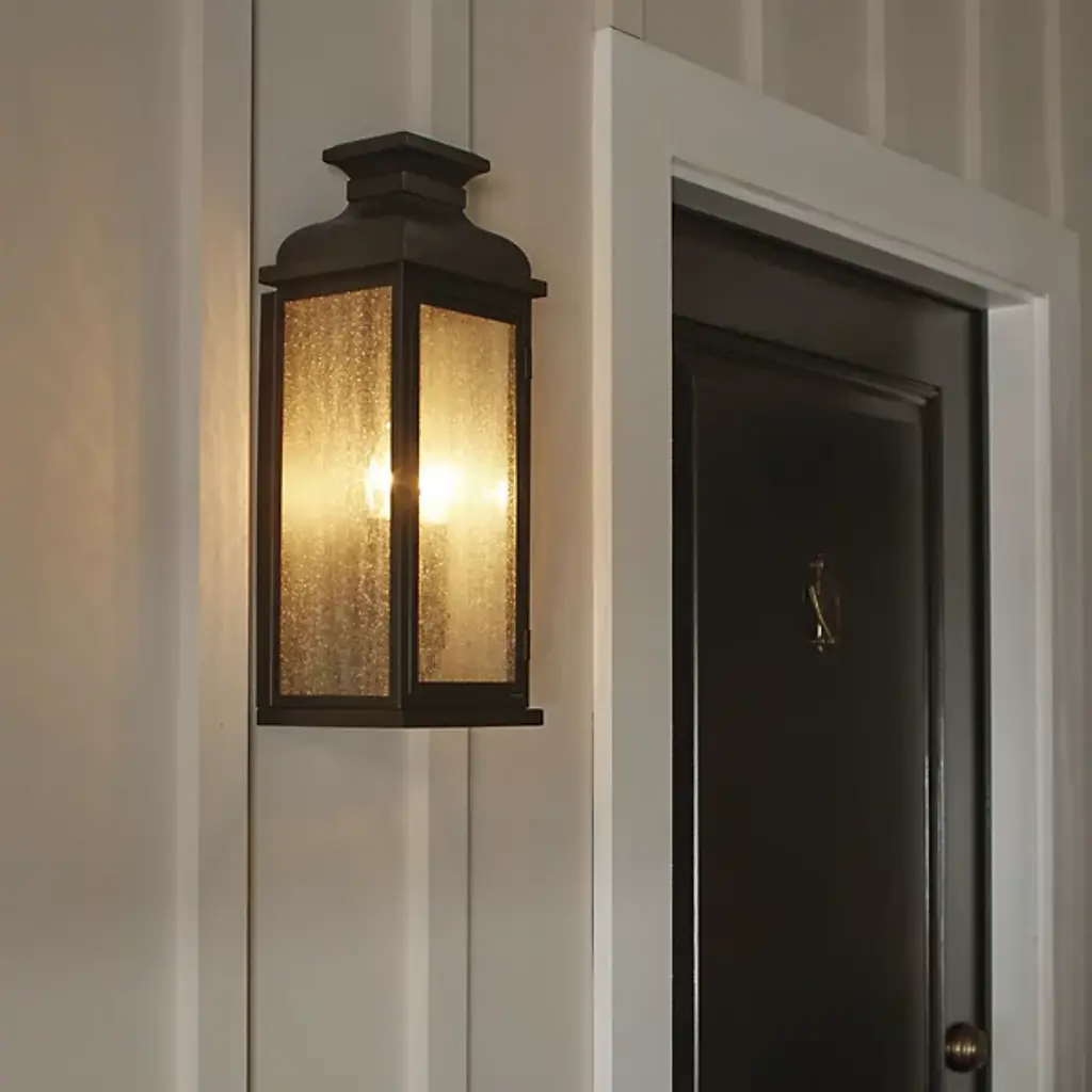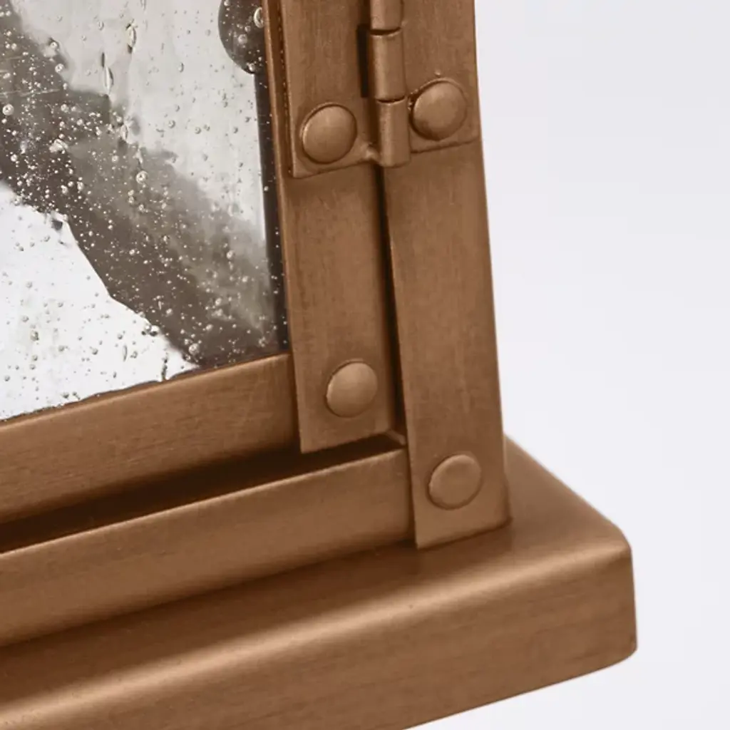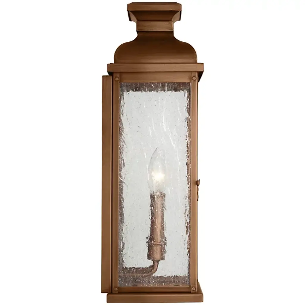 Bring the dark, austere character of London street lanterns to your wall. The Pediment Outdoor Wall Sconce by Visual Comfort Studio, formerly known as Sean Lavin, does just that, with a distinctively Industrial character and the robust construction found in contemporary pieces. The outdoor wall sconce is framed by a Dark Weathered Zinc frame shaped like a rectangle, which holds a shade made of various rectangular pieces of Clear Seeded Glass. Two sockets suitable for candelabra bulbs are included inside the shade, adding to the piece’s vintage look.
