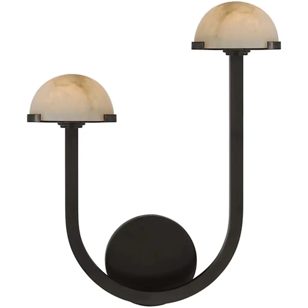 Whimsical sophistication. Generous curves swing the eye from side to side with the smile-worthy design of the Pedra LED Assymetrical Wall Sconce from Visual Comfort Signature, formerly known as Visual Comfort, It’s a modern design with a playful personality. While key functionally, the compact circular backplate appears in silhouette like a ball rolling up the arm’s u-shaped curve. The sleek metal arm adds to the sconce’s sculptural personality as an asymmetric shape. A surge of texture pulls the eyes to the veiny alabaster domes. The domes fan out a warm ambient light with a comfortable, diffused quality.