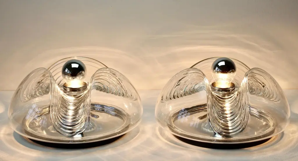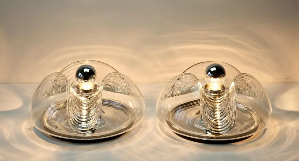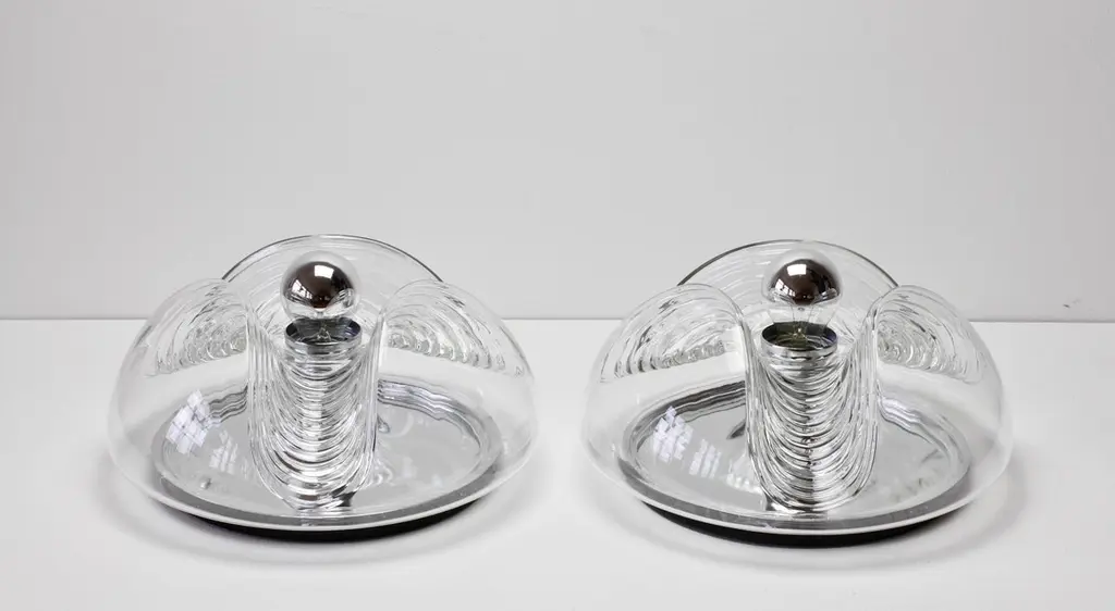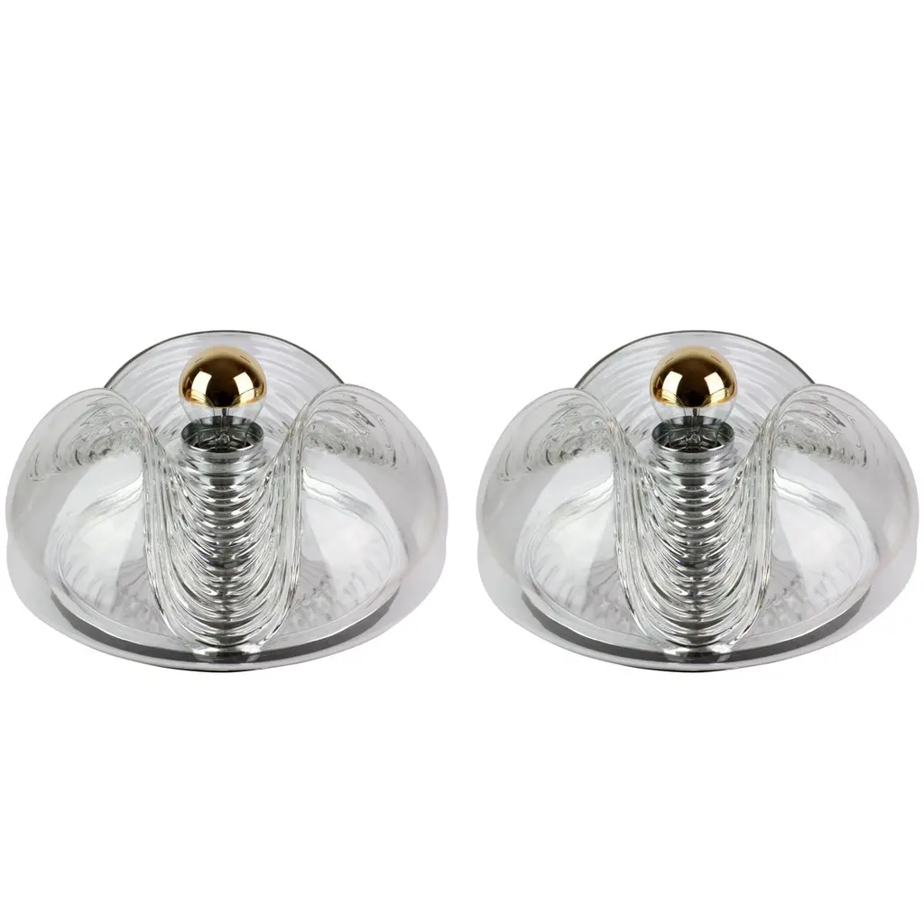 One of four vintage mid-century flushmount wall lights, lamps or sconces by Peill & Putzler in the 1970s. This is an absolutely Classic piece of German design, featuring a clear glass globe shade with a waved/ribbed molded bubble form, casting a beautiful rippled light across a wall or ceiling.With its biomorphic, futuristic shape which echoes that of the Space Age race of that era the light looks great paired with any items made of acrylic or items with bold "Space Age" forms. Four available, priced and sold individually, in pairs or as a set of four.Newly rewired to EU standards (220 volts) & should also work on US standards (110 volts), each light requires a single E27 screw fit light bulb (150 Watt max).