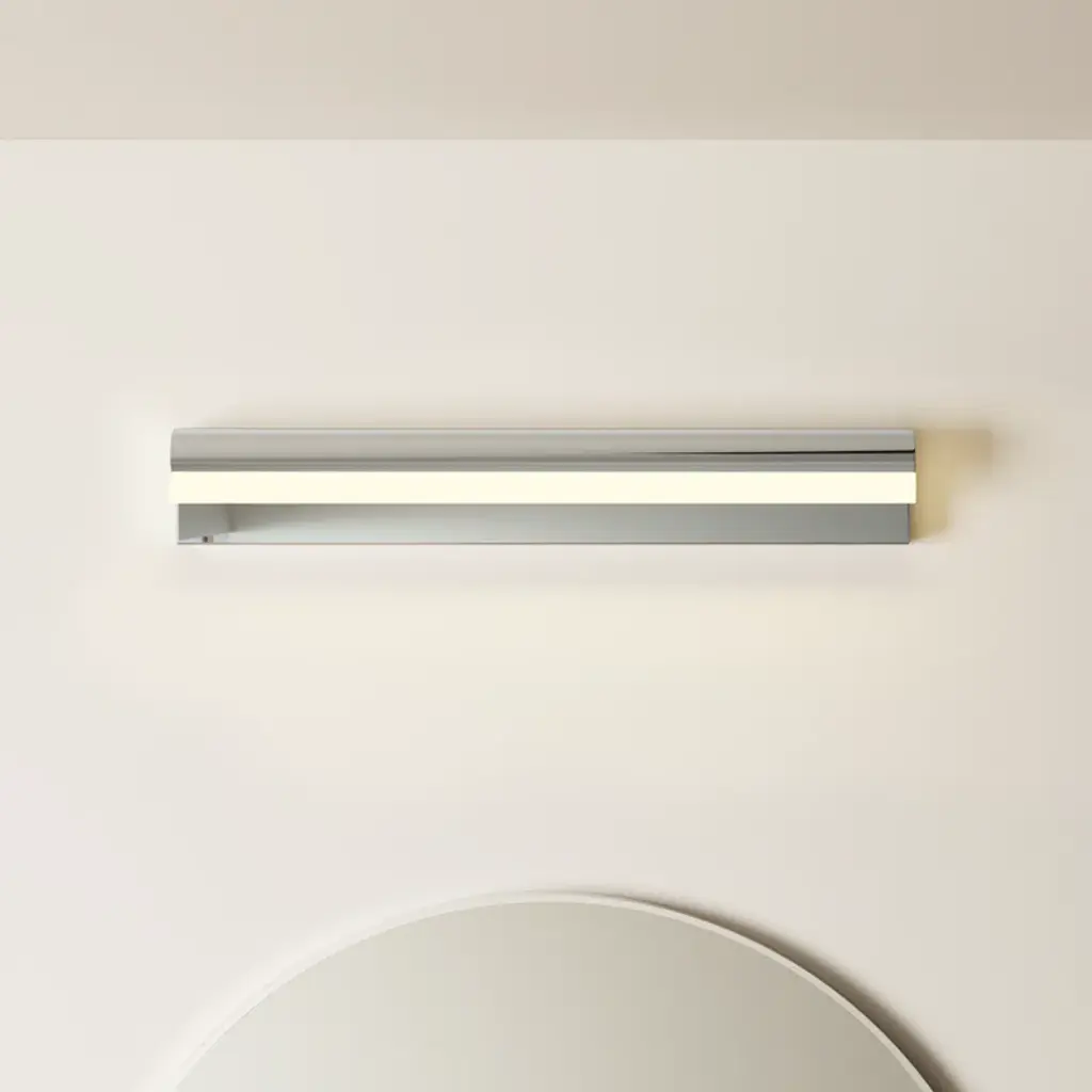 This streamlined take on vanity lighting updates your bathroom with the sleek, minimalist look of a bath bar. Crafted from metal and acrylic, this bath bar features a clean-lined silhouette with a square backplate and a curving arm. At the bottom of the arm an integrated LED light with a white diffuser shines downward, and reflects off of the backplate for an ambient glow. At 30'' wide, this fixture is idea for casting light on medium-sized mirrors. It's is rated for damp spaces, and is compatible with dimmer switches.