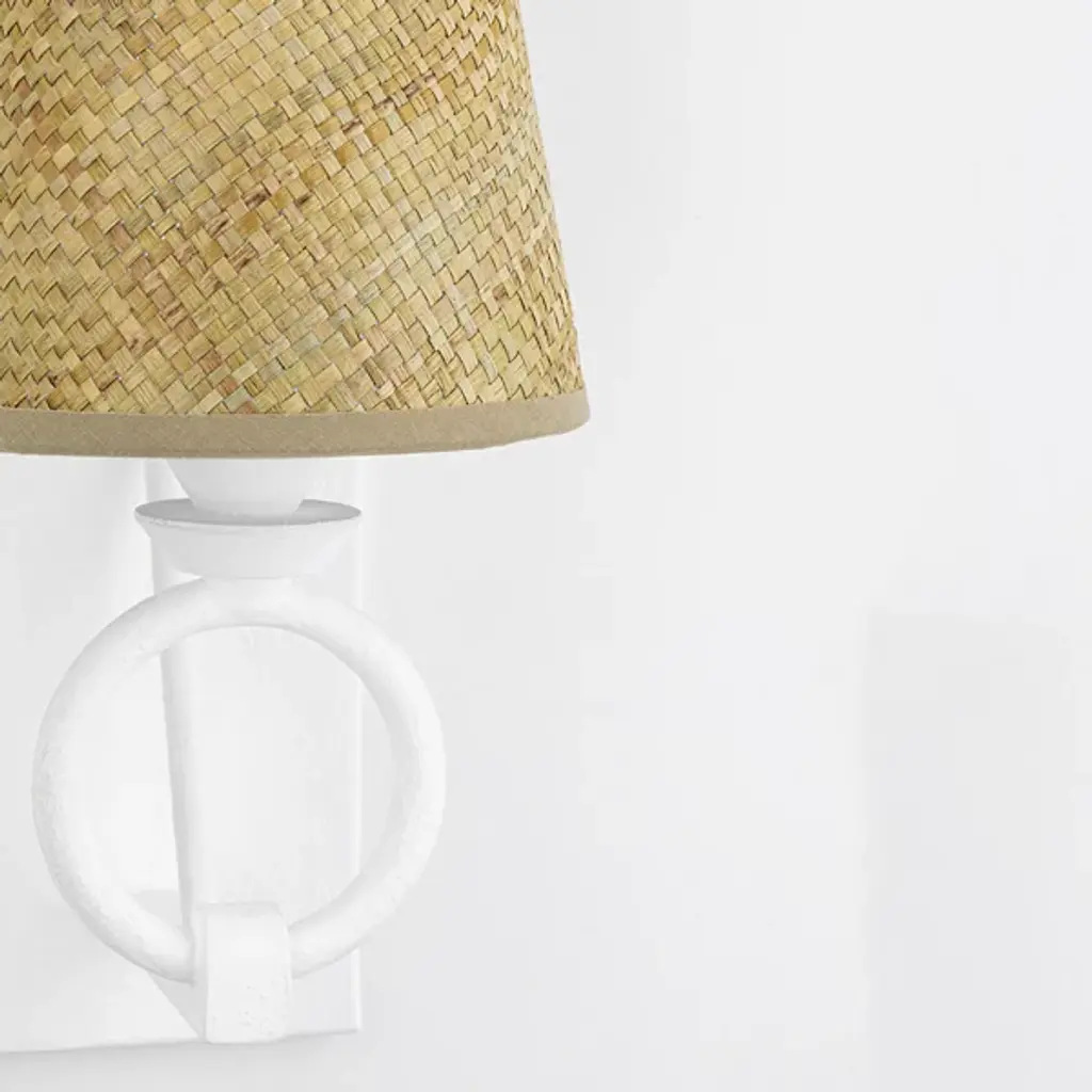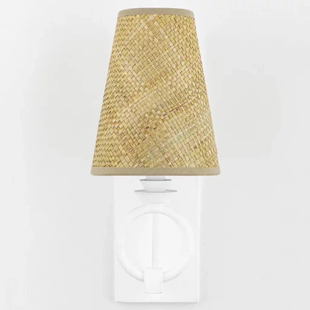 The Pendelton Wall Sconce by Hudson Valley Lighting combines modern and organic touches for a sophisticated transitional style of lighting that reflects beautifully in any space. Crafted from Steel, a rectangular wall mount with an angular brace holds a prominent ring base topped with a two-tier stylized gemstone. Above the ring, a tapered shade made from woven Buri palm leaves warmly diffuses the light from a single candelabra. This showpiece sconce shines as an additional layer of light in a foyer, bedroom, dining room or home office.