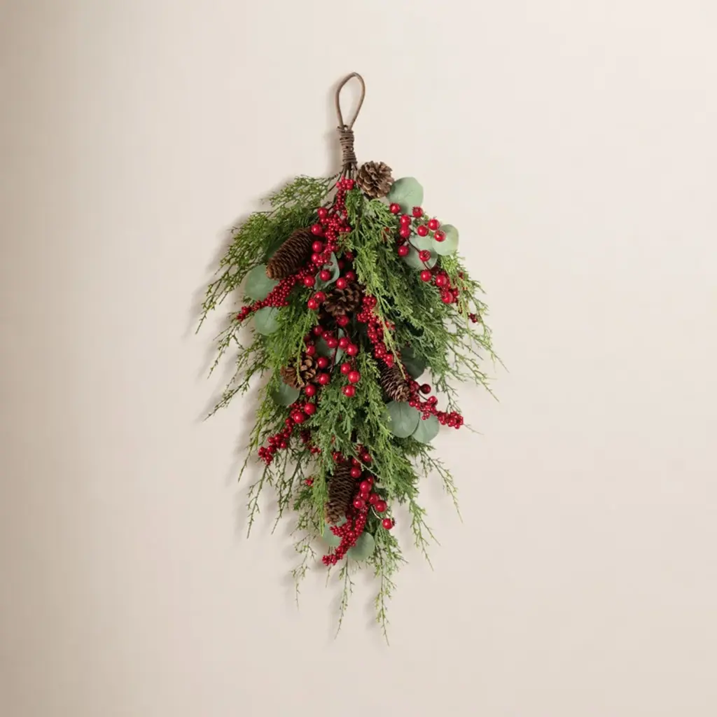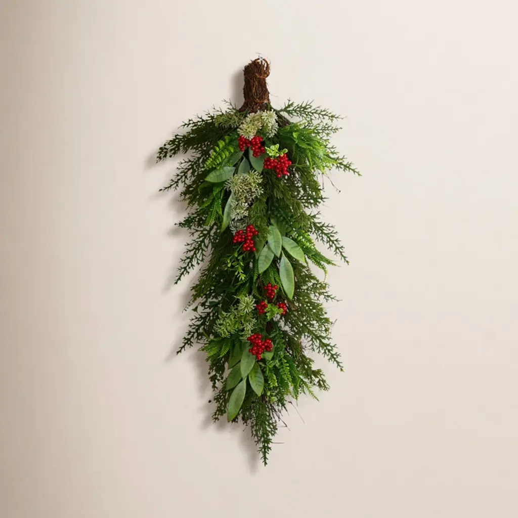 A blend of lifelike cypress, cedar, black spruce, white spruce, silver dollar eucalyptus, lamb's ears and peony blooms display a beautiful variation of green tones, accented by red berries and pine cones. Lifelike foliage UV treated to prevent fading To maximize the life of your greenery, we recommend a limit of 3 months of outdoor exposure per year Fluff and shape greenery after unpacking Floral wire back to attach/bend onto sconce and endless places throughout your home Wipe clean with a soft, dry cloth or duster For indoor or outdoor use Imported A Frontgate exclusive. At Frontgate, our primary focus is quality. We guarantee that every product we sell will stand up to the supreme test – our customers' satisfaction. To learn more about our policies, visit our Shipping & Processing, Returns & Exchanges and Warranty & Price Guarantee pages.