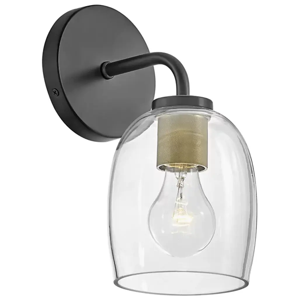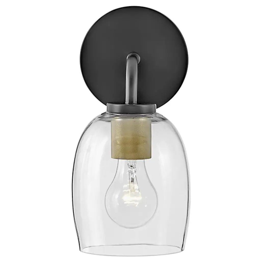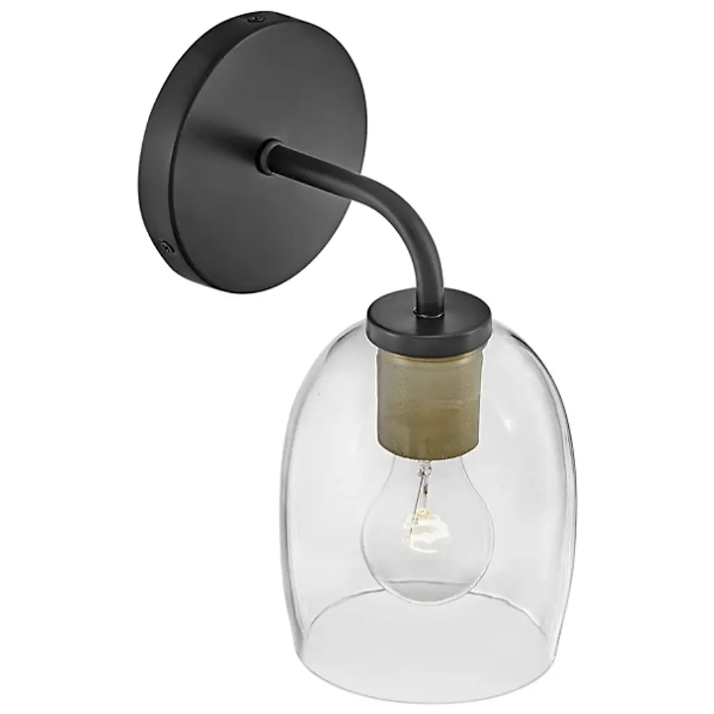 The Percy Bath Sconce from Lark offers a smooth transitional appeal to spaces. A sleek circular wall plate secures the fixture, extending a curving arm out to damp-listed lamping, which blazes out inside a curving bell-shaped shade of clear glass. This sleek medium gentles glare to the sides, transforming it into an even ambiance that splashes out around a column of uplight or downlight, depending on whether the fixture is oriented up or down.