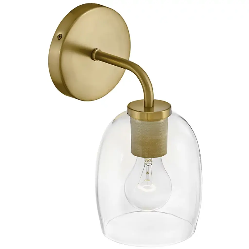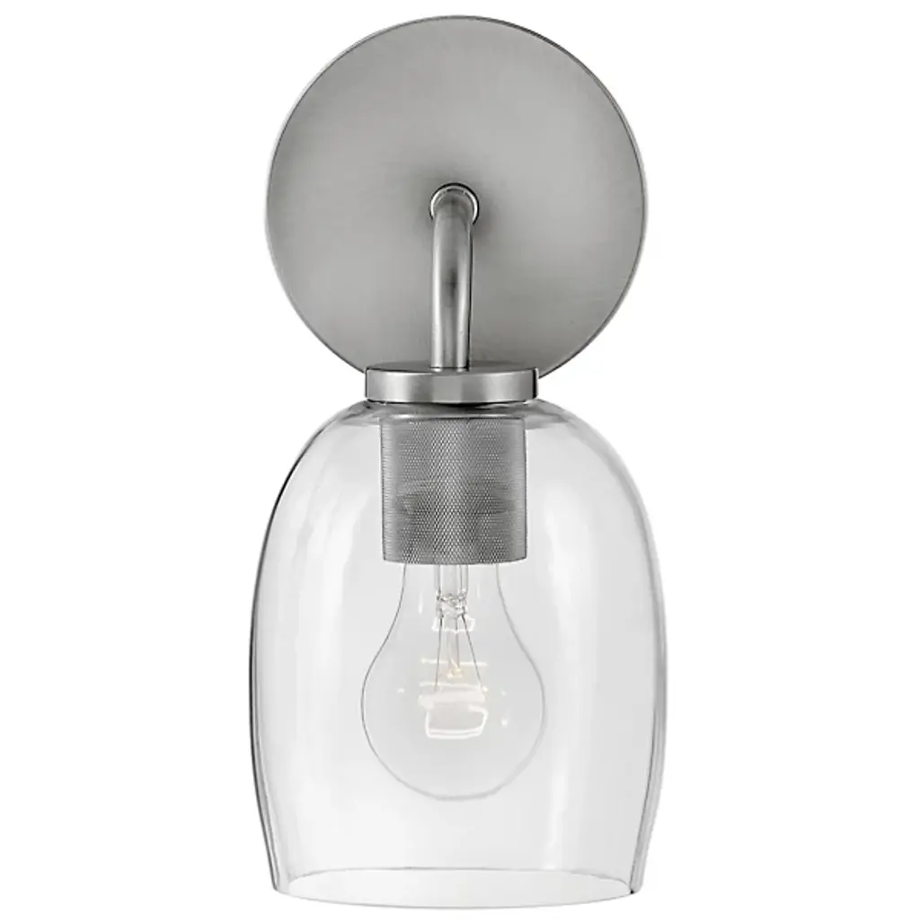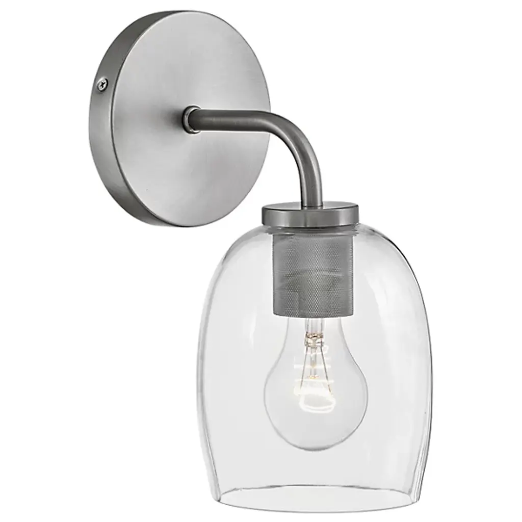 The Percy Bath Sconce from Lark offers a smooth transitional appeal to spaces. A sleek circular wall plate secures the fixture, extending a curving arm out to damp-listed lamping, which blazes out inside a curving bell-shaped shade of clear glass. This sleek medium gentles glare to the sides, transforming it into an even ambiance that splashes out around a column of uplight or downlight, depending on whether the fixture is oriented up or down.