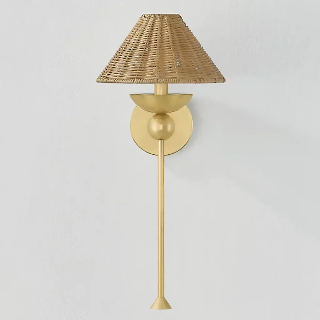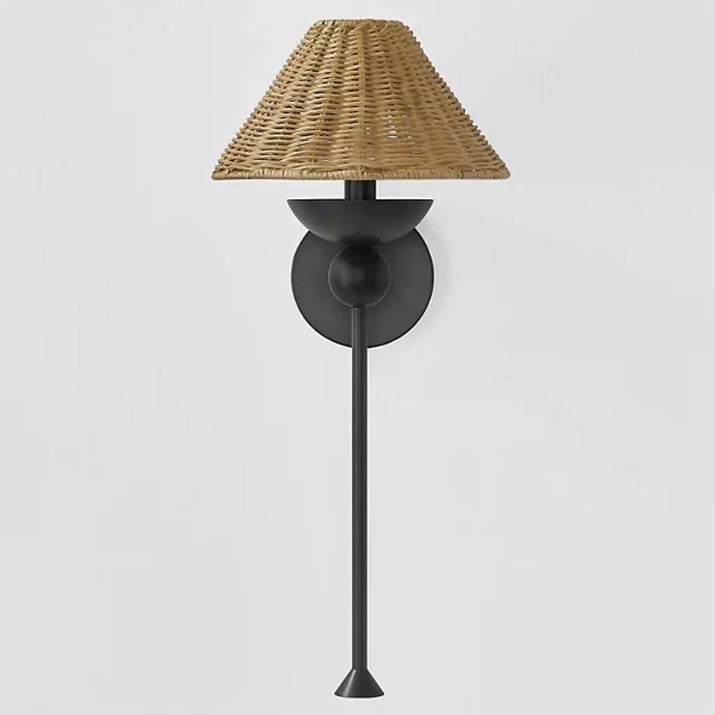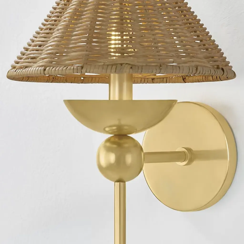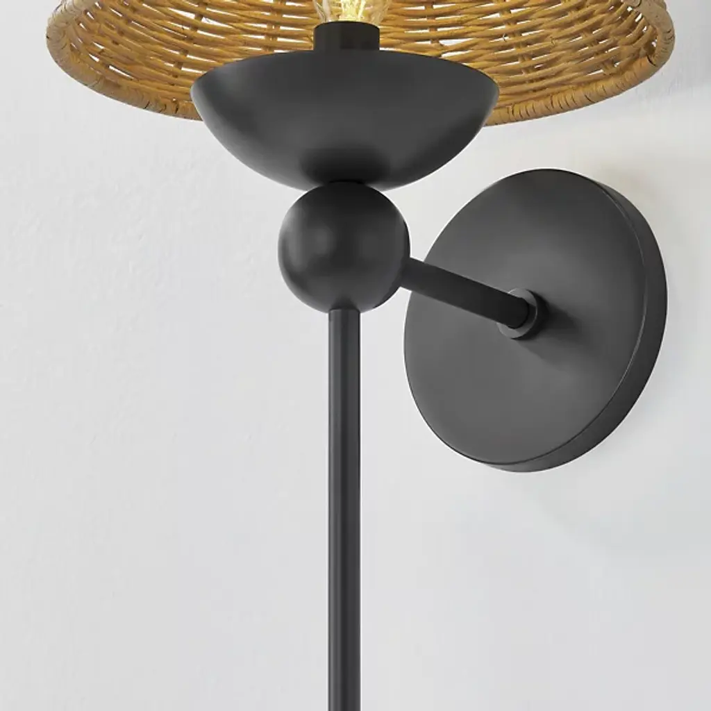 The Perilla Wall Sconce from Mitzi, designed by DABITO, blends slender elegance with a rustic character, showing off a striking play of shapes and textures with an eye on transitional and bohemian styles. This wall sconce features a long, slender rod suspended from a circular wall plate by a sphere accent, elevating bright lamping beneath a woven wicker rattan shade with dome-shaped metal accents. Small accents add an artisanal touch, and the unique construction of each sconce leaves it able to echo neighbors if part of a multiple fixture arrangement.