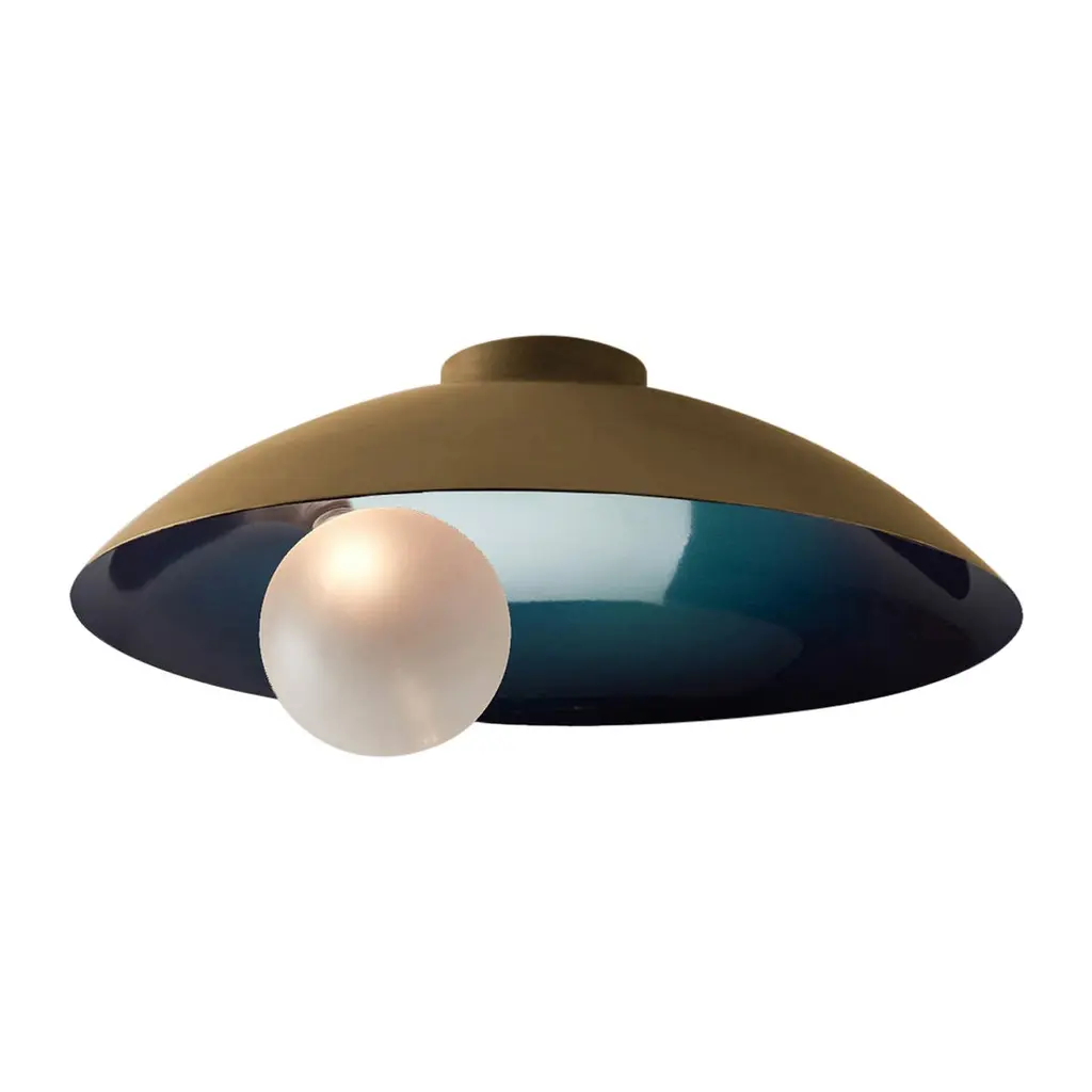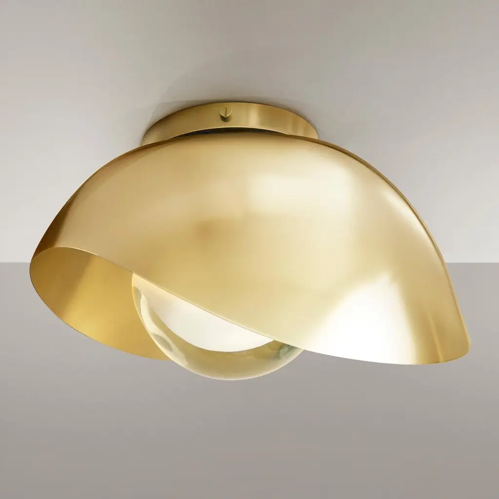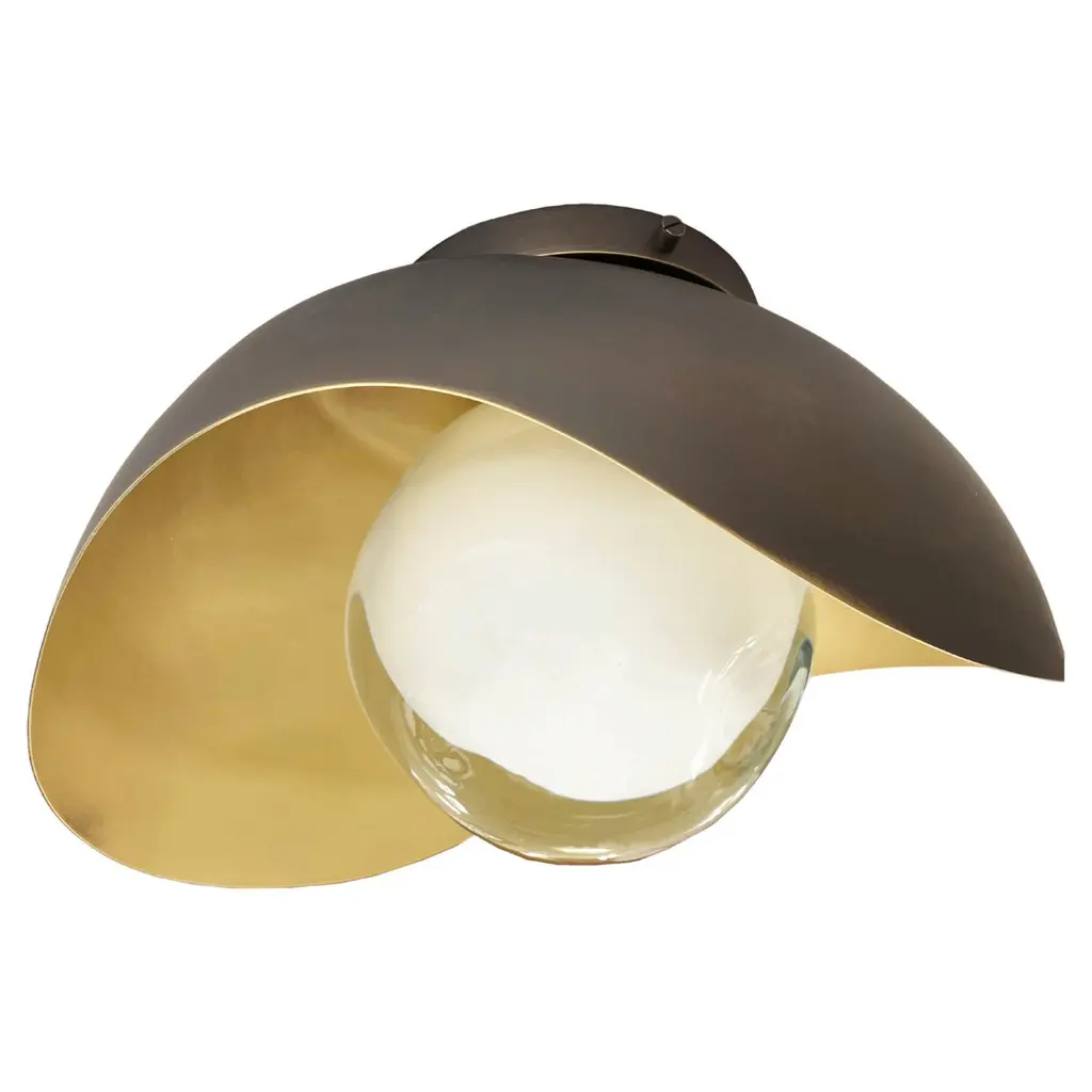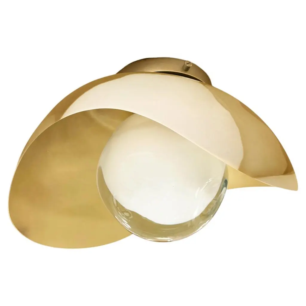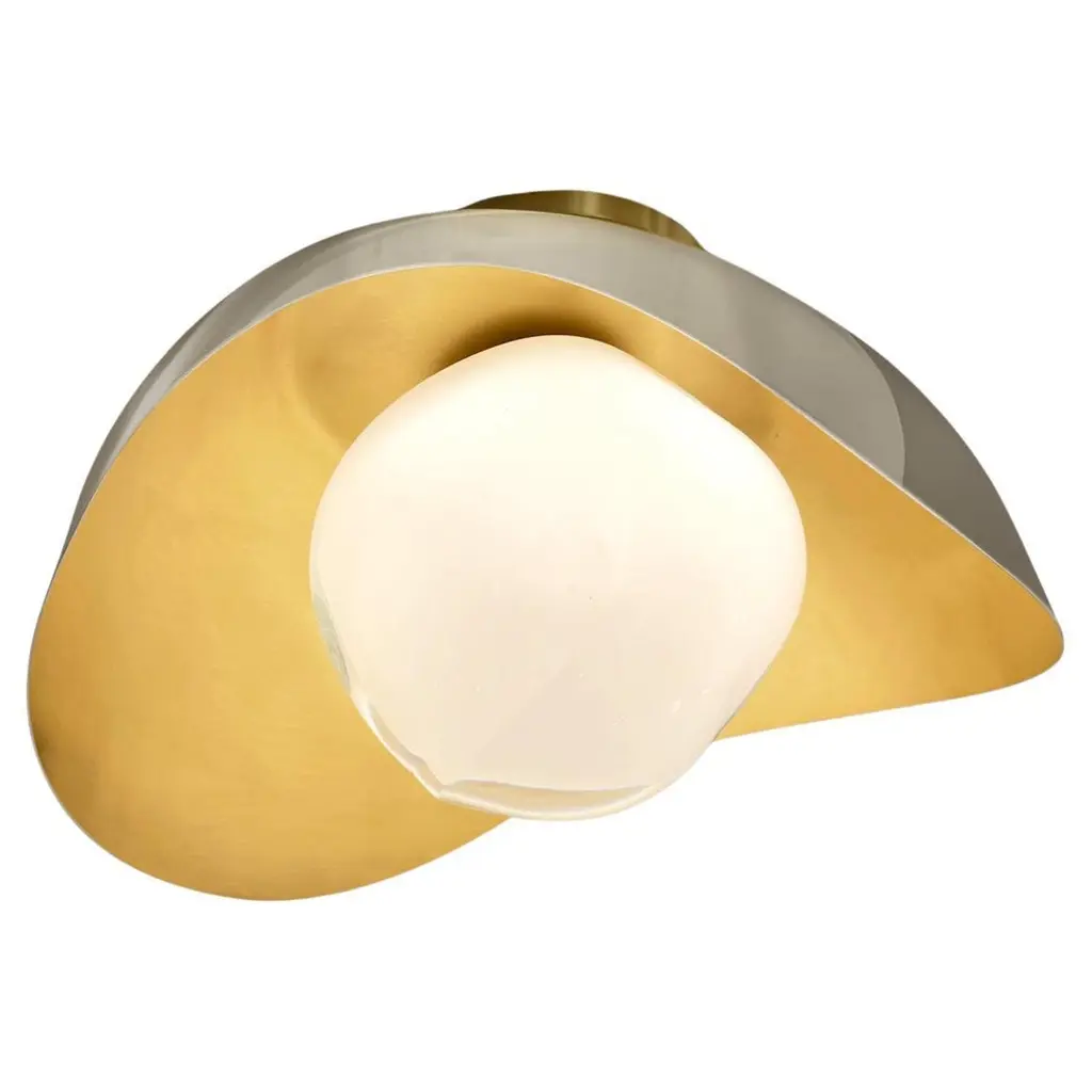 The Perla flushmount features an organic brass shell nestling our Sfera glass handblown in Tuscany. The first images show the fixture with a satin brass interior and polished brass exterior finish-subsequent pictures show it in a selection of alternative finishes. Can also be installed as a wall light.Starting at $ 2,600 for standard finishes.Starting at $ 2,950 for premium finishesCustomization options: Each fixture is hand crafted in Italy and is available in any of our 10 finishes and 8 enamel colors. Compatible with our Sfera glass.Lead time: 10-12 weeks plus shipping.Depth: 8.5”Height: 6.5”Width: 11”Electrical: One E12 base LED bulbs up to 40WModel#: LTZ811
