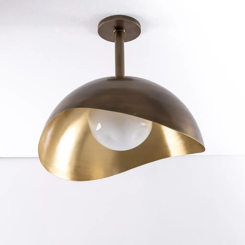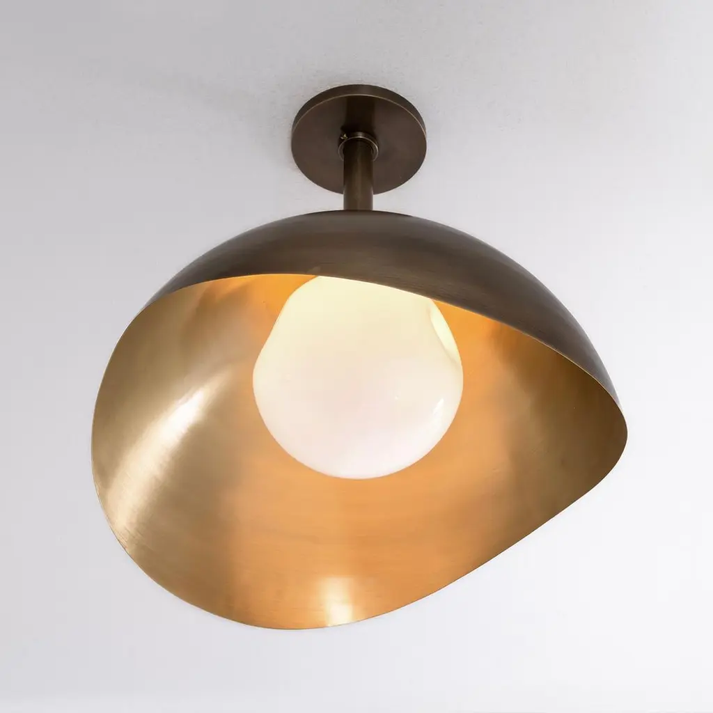 The Perla Grande features an organic brass shell nestling our sfera glass handblown in Murano. Shown in a two tone finish with a bronzo nuvolato exterior and satin brass interior. See our Perla flushmount and wall light for the smaller version. Starting at $ 5,600 for standard finishes.Starting at $ 6,200 for premium finishes.Customization Options:Each fixture is hand crafted in Italy and is available in any of our 10 metal finishes and 8 enamel colors on either a brass or copper base. Height of stem is adjustable.Lead Time: 10-12 weeks plus shipping.Depth: 19.5”Width: 19”Height: 9.5” for shell only (18” a shown-adjustable)Electrical: One E12 75W LED equivalentModel#: LTZ811L
