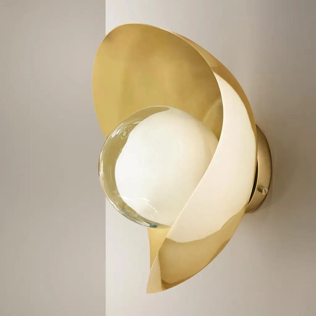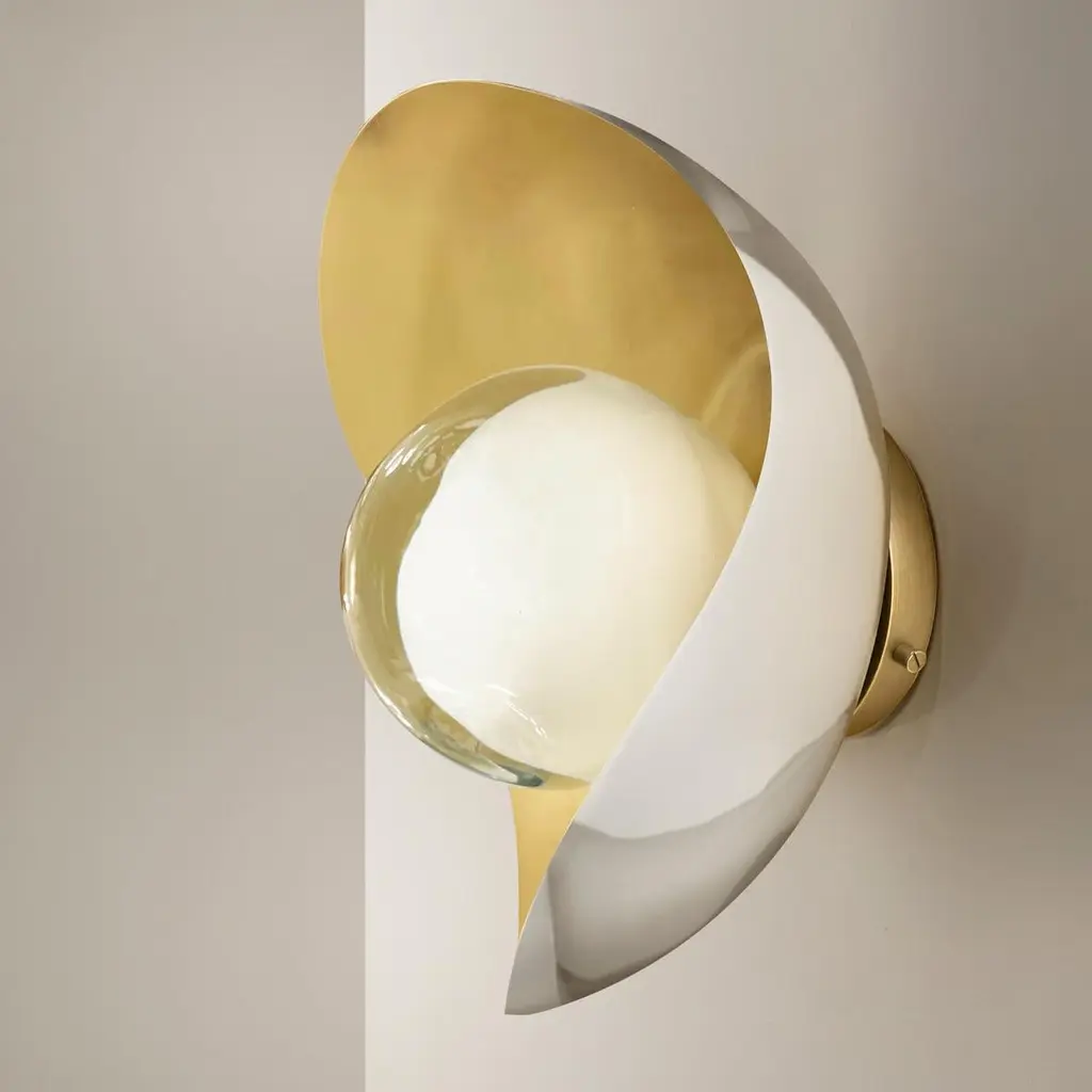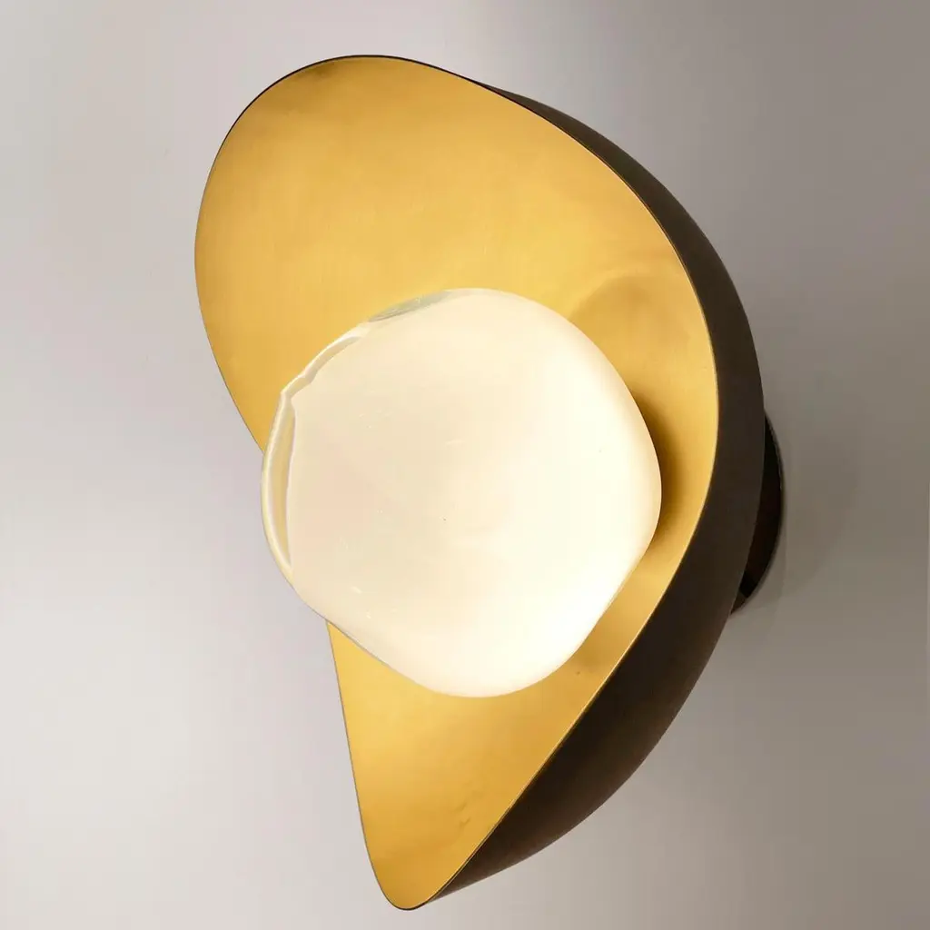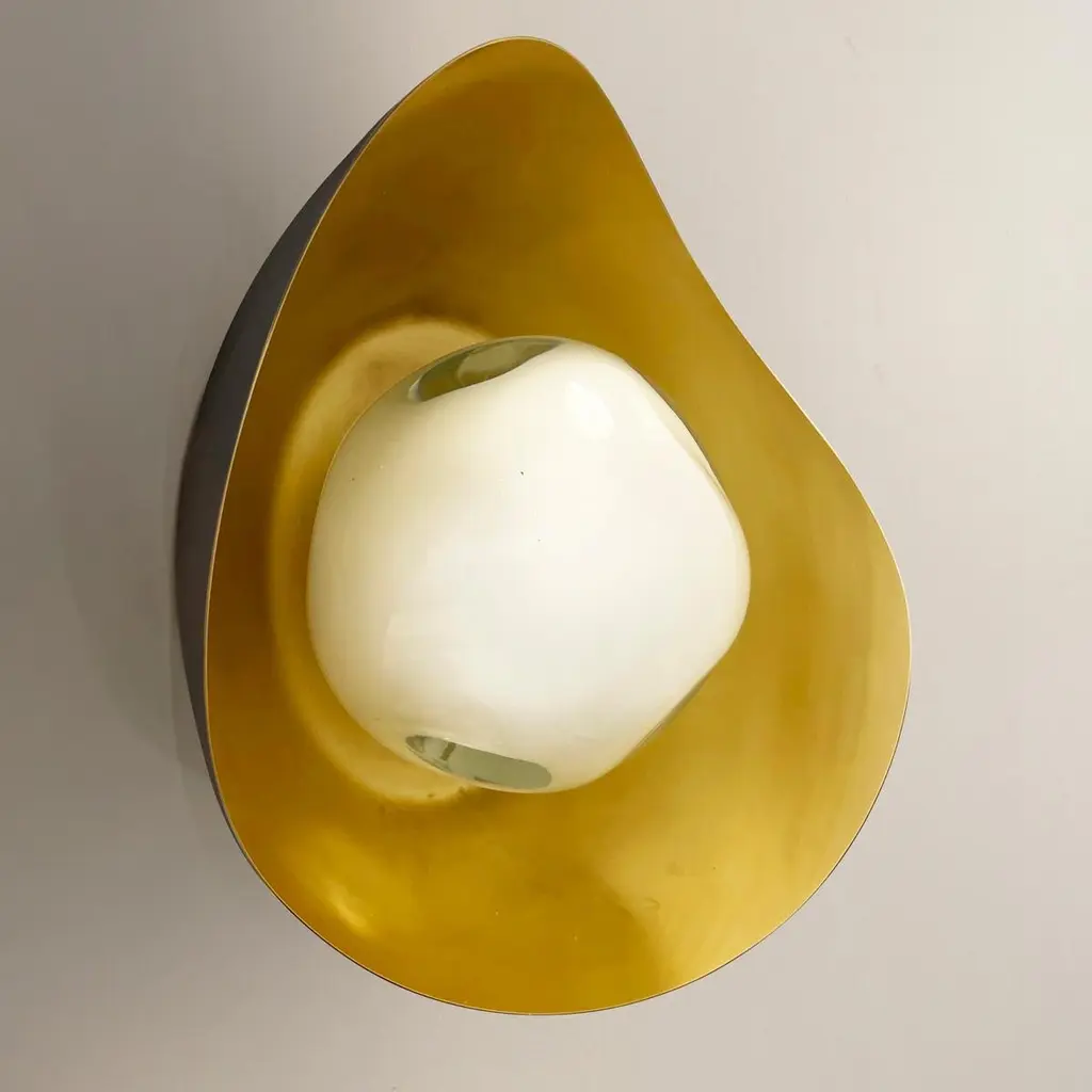 The Perla wall light features an organic brass shell nestling our Sfera glass handblown in Tuscany. The first images show the fixture with a satin brass interior and Bronzo Nuvolato (bronze) exterior finish-subsequent pictures show it in a selection of alternative finishes. Can also be installed as a ceiling light.Starting at $ 2,600 for standard finishes.Starting at $ 2,950 for premium finishesCustomization options: Each fixture is hand crafted in Italy and is available in any of our 10 finishes and 8 enamel colors. Compatible with our Sfera glass.Lead time: 10-12 weeks plus shipping.Width: 8.5”Depth: 6.5”Height: 11”Electrical: One E12 base LED bulbs up to 40WModel#: LTZ811