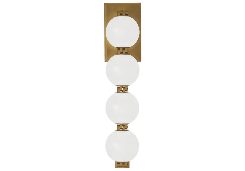 This tasteful sconce lends dimension and elegance with its chic, four LED ball lights contrasted by metal accents and backplate. Its textured design styles beautifully into bathrooms, mantles, and hallways for a graceful, sophisticated touch. Available in three finishes, bronze, nickel, and brass.