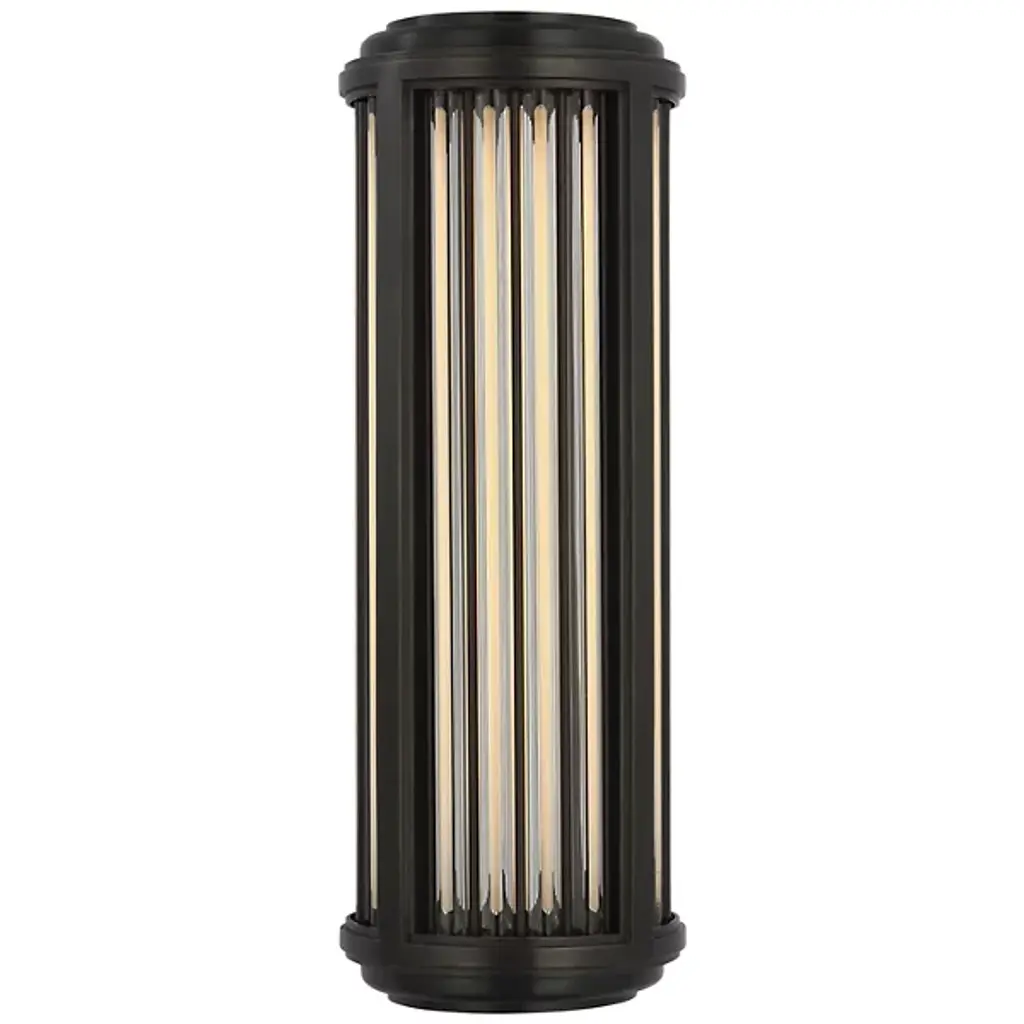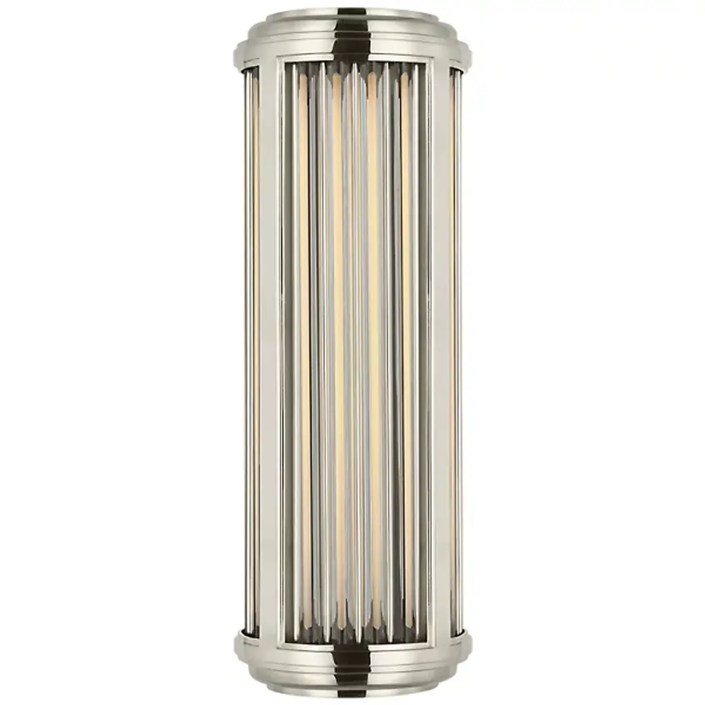Stripes of stylish light. The Perren LED Wall Sconce from Visual Comfort Signature, formerly known as Visual Comfort, is a piece of couture for the home, breaking down its radiant light into a beautiful pattern. This modern design features fine detailing on its metal structure that ties it to the regal styling of the early 20th century. The cylindrical metal structure creates windows for its light source. Clear glass rods wrap across the piece as a glare-free barrier between one and the light source. Even with the lights off during the day, the rods dazzle with reflective details. When the lights come on, the rods transform into golden stripes with an ambient glow escaping through their slender shapes.