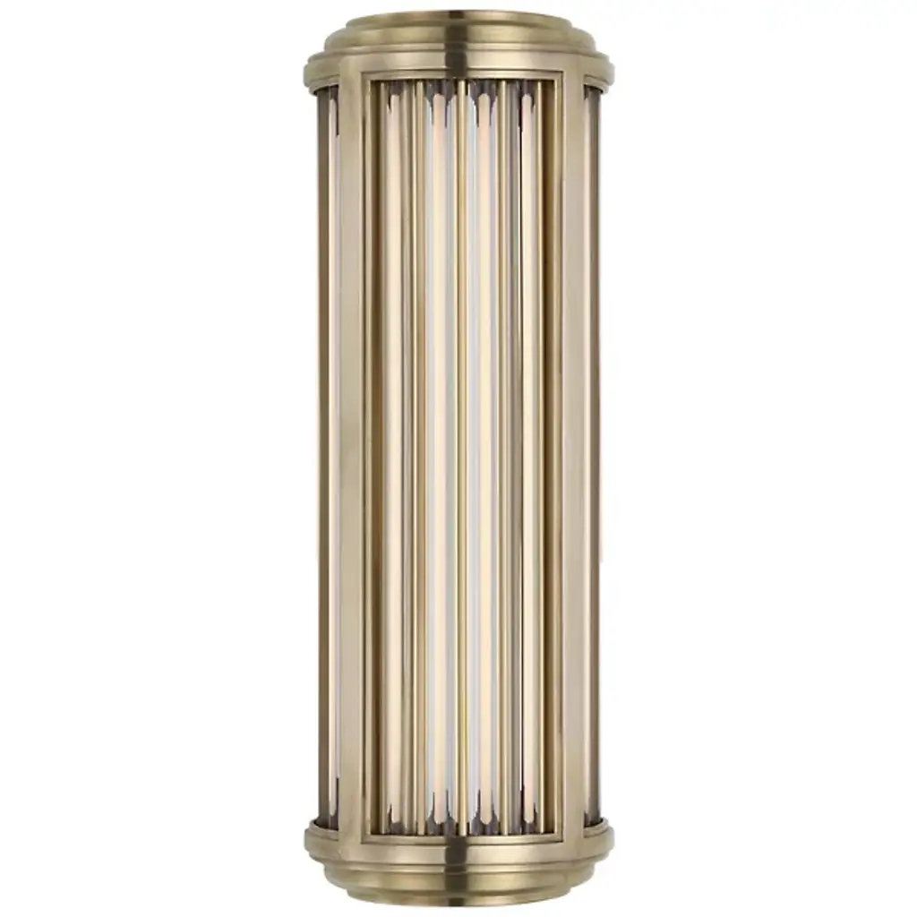 Stripes of stylish light. The Perren LED Wall Sconce from Visual Comfort Signature, formerly known as Visual Comfort, is a piece of couture for the home, breaking down its radiant light into a beautiful pattern. This modern design features fine detailing on its metal structure that ties it to the regal styling of the early 20th century. The cylindrical metal structure creates windows for its light source. Clear glass rods wrap across the piece as a glare-free barrier between one and the light source. Even with the lights off during the day, the rods dazzle with reflective details. When the lights come on, the rods transform into golden stripes with an ambient glow escaping through their slender shapes.
