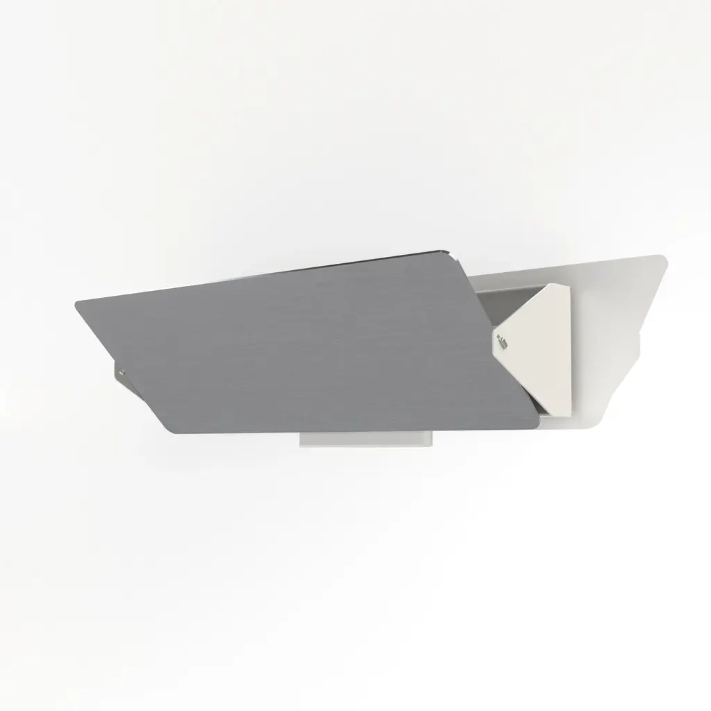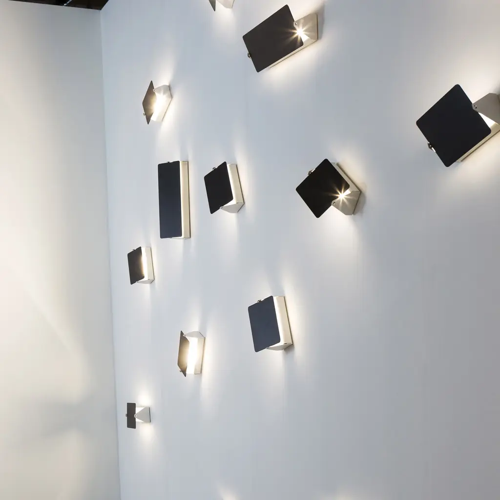 Wall lamps with aluminum adjustable diffuser “volet” and metal structure. Structure painted volet in natural anodized aluminum, black anodized aluminum or mirror polished stainless steel. For the small versions E12 and LED versions. E12 version is equipped with integrated switch (on board), cable and plug for a simple and free installation. Indirect light output towards the wall and orientable flood beam. Features
