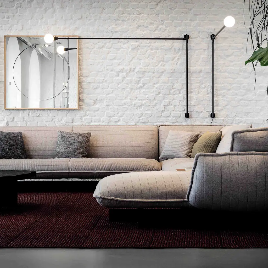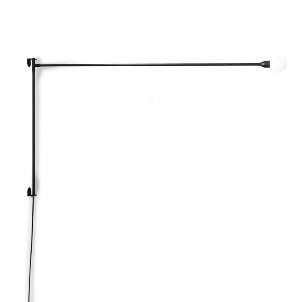 Embossed wall lamp inspired by the boom of sailboats. In aluminum and metal painted matt black, also available in the Mini version with reduced dimensions. The arm is fixed to the wall and rotates on the horizontal axis, forming an angle of almost 180°. Power cord supplied with plug and dimmer. Features
