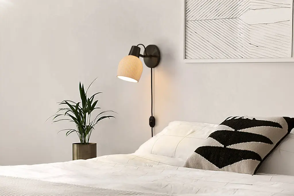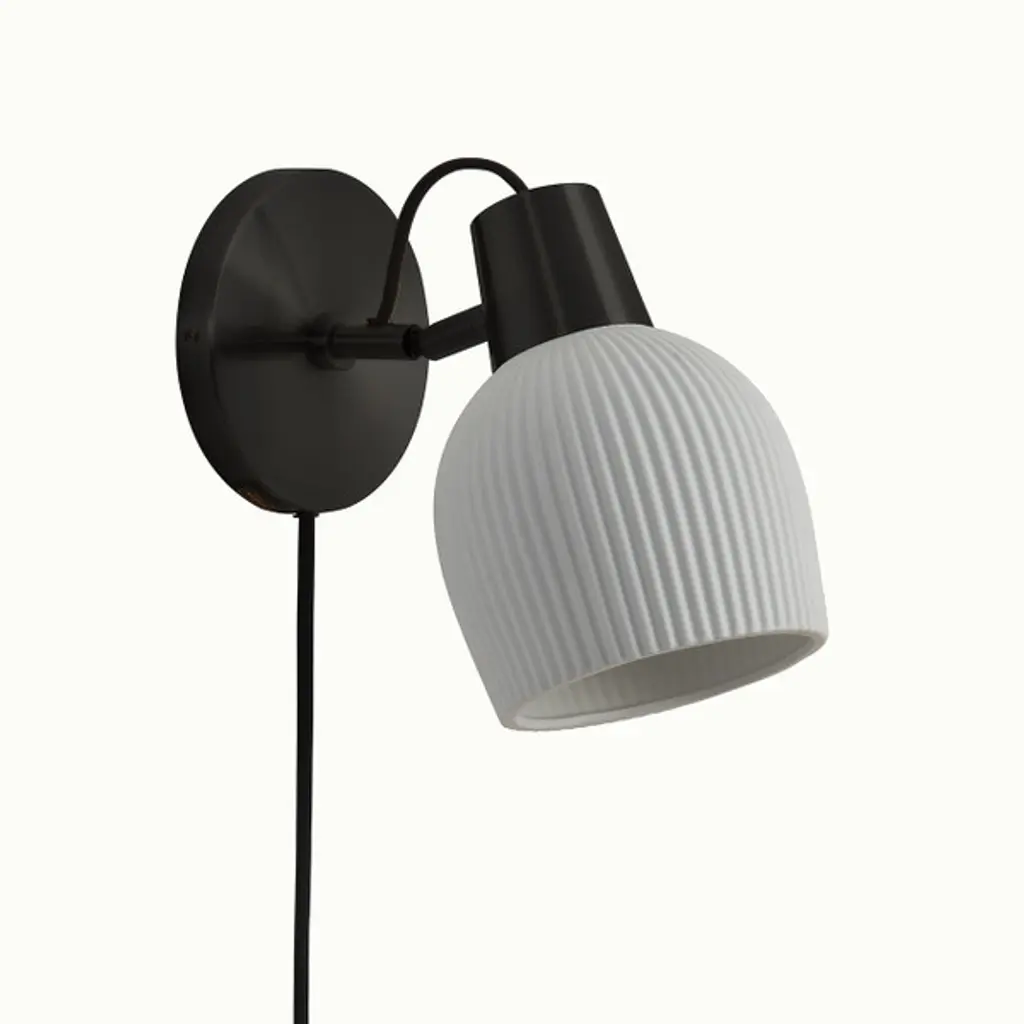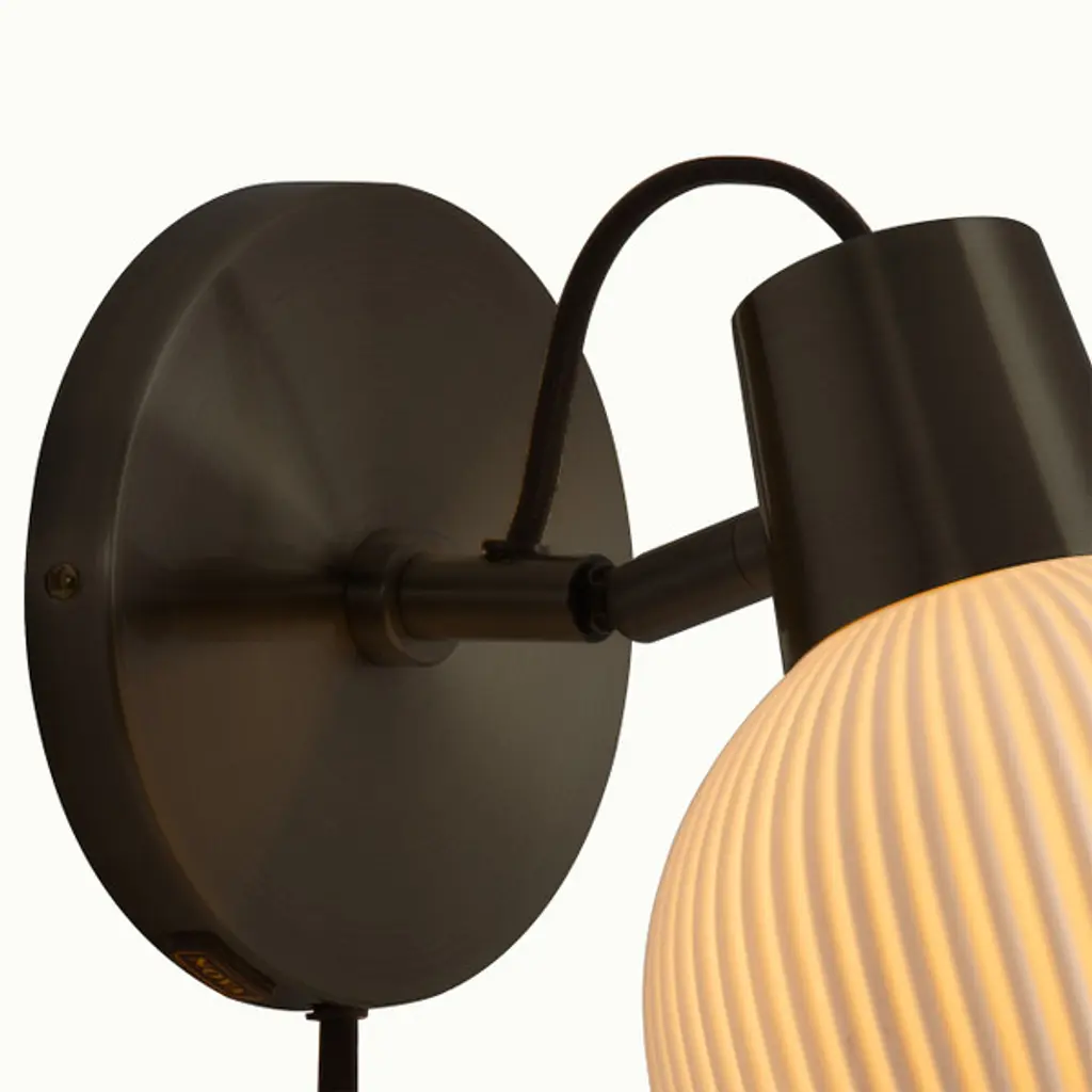 Blending handcrafted bone porcelain slip casting with refined matte black metal and innovative technology, the Petaluma Bone Porcelain Wall Sconce gently glows with warm, diffused light. The shade, meticulously fashioned from knife-pleated fine bone porcelain, showcases an etched line pattern that offers gradations of light intensity, creating an interplay of light and shadow across the surface. This union of porcelain and matte black renders the sconce an elegant addition to bedside tables, reading nooks, or hallways, making it a perfect fit for mid-century modern aesthetics. The Petaluma Wall Sconce is easy to install, eliminating the need for an electrician. Its plug-in design offers convenience, while also allowing for hard-wiring if preferred. Illuminate your surroundings with the delicate and captivating glow of the Petaluma Wall Sconce, a blend of aesthetic allure and modern convenience that effortlessly enhances your living space. Its versatile design ensures it can fit seamlessly into any room, adding a touch of sophistication and warmth.