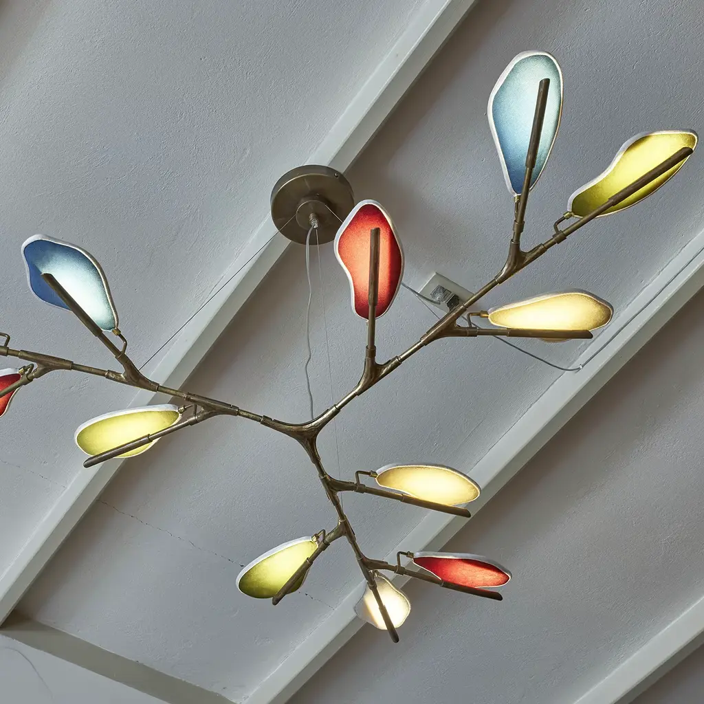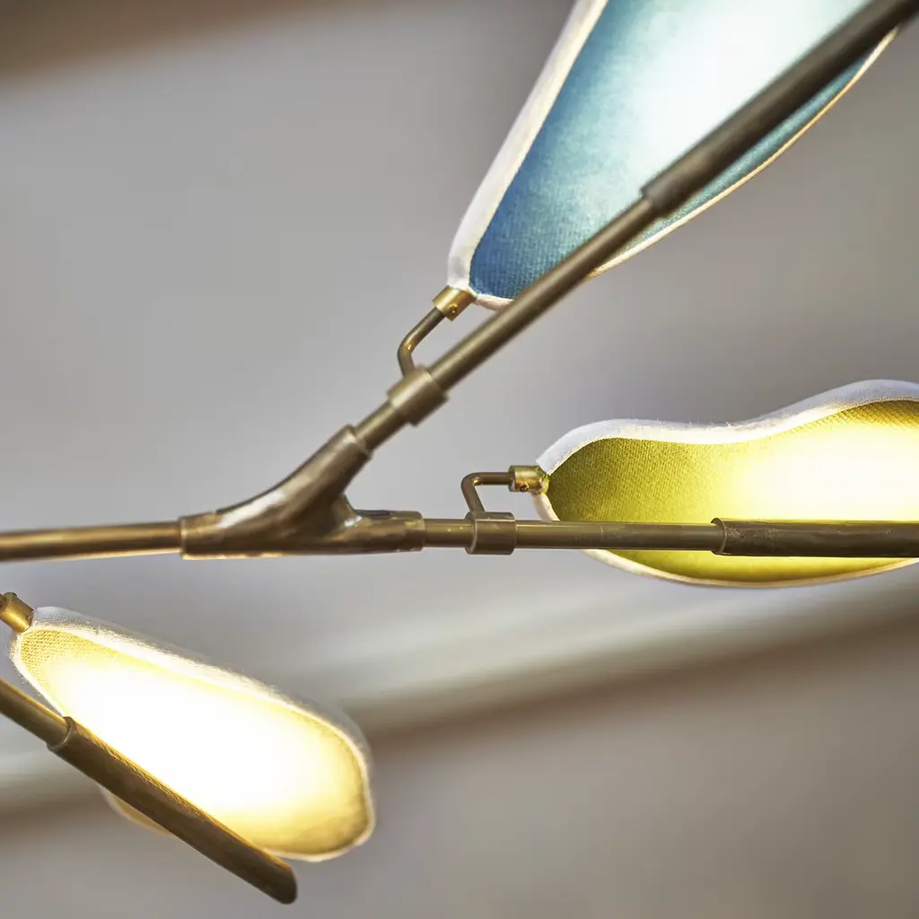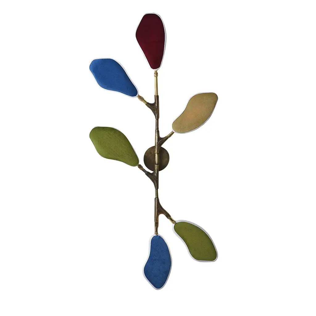 Aptly named after an original crisis between 'petal' and "lux" (the Latin word for light), this wall lamp sports a graceful and playful phytomorphic design. Three branch-shaped arms radiate from a round wall plate, all elements part of the same frame obtained from the meeting of brass. Bud-like velvet shades in contrasting tones of red, yellow, green, and blue complete the design.