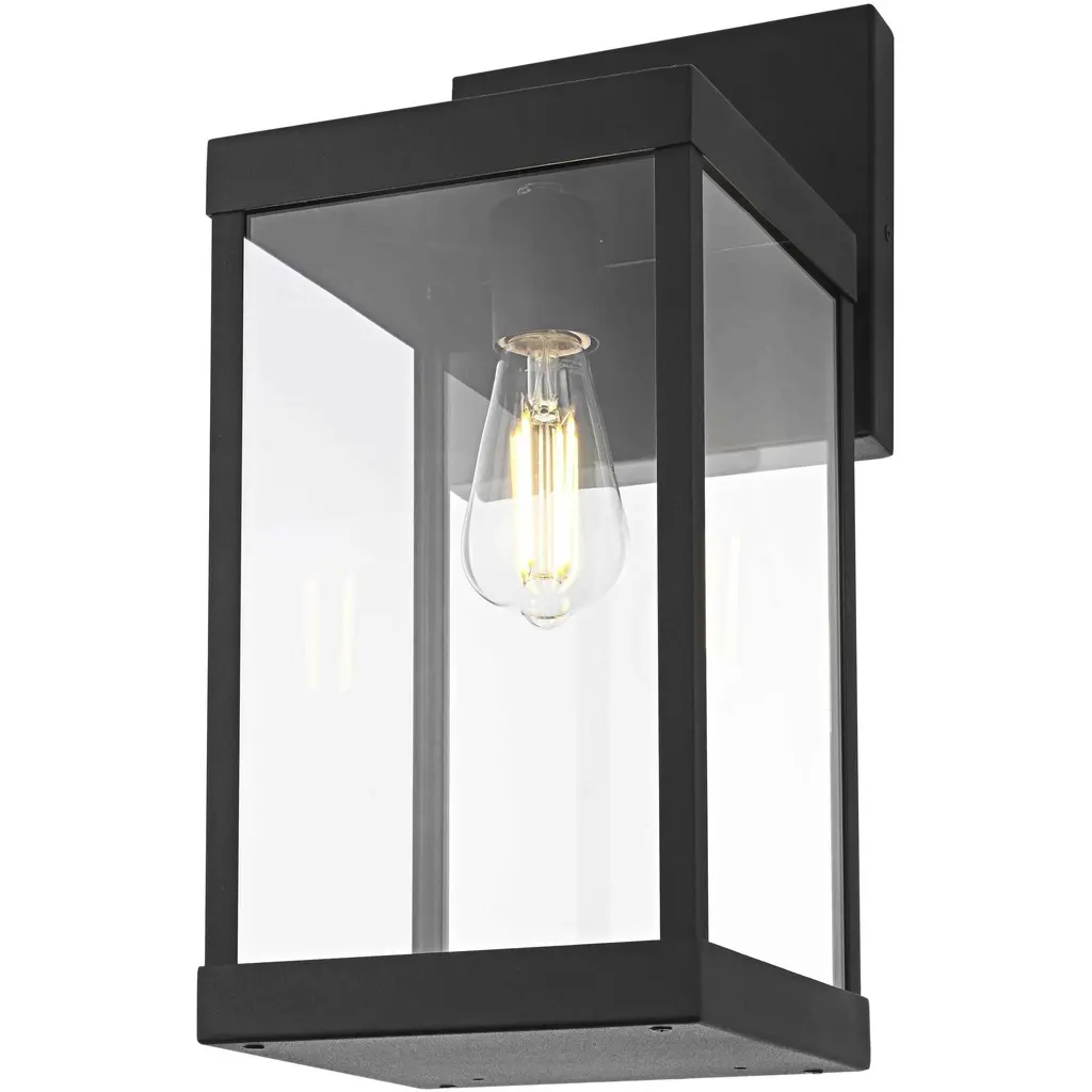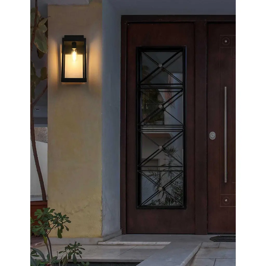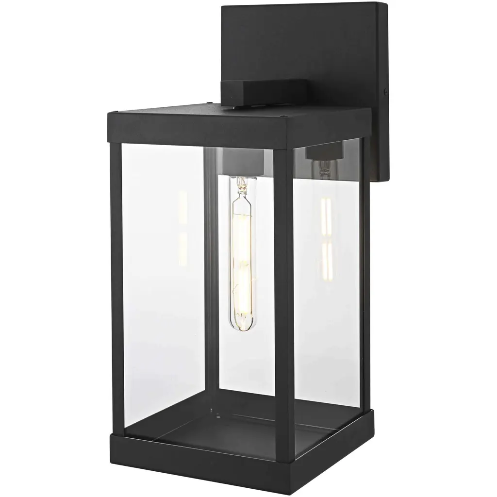 Bring definition and clarity to outdoor spaces with a modern lantern that makes a statement. A crisp rectangular frame, crafted from durable iron with a matte black finish, offers a bold contrast to the clear glass panels that surround the bulb. The structured design features an enclosed bottom for a clean and finished look, while the suspended bulb effect creates a striking focal point. A minimalist backplate and streamlined mounting arm maintain the sleek aesthetic, making this wet-rated wall light perfect for patios, entryways, and garages. Designed with an E26 socket (bulb not included), this lantern provides customizable lighting to enhance any exterior with precision and style.