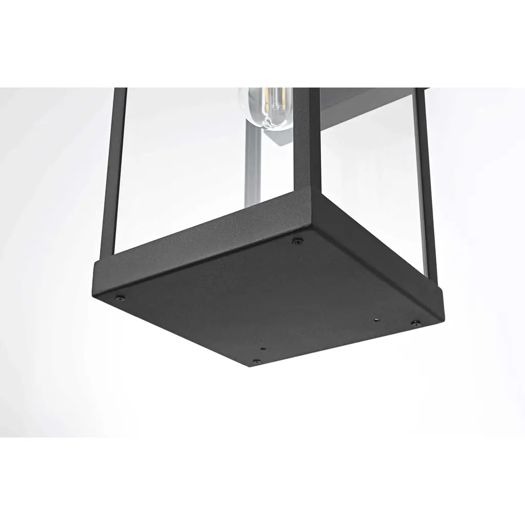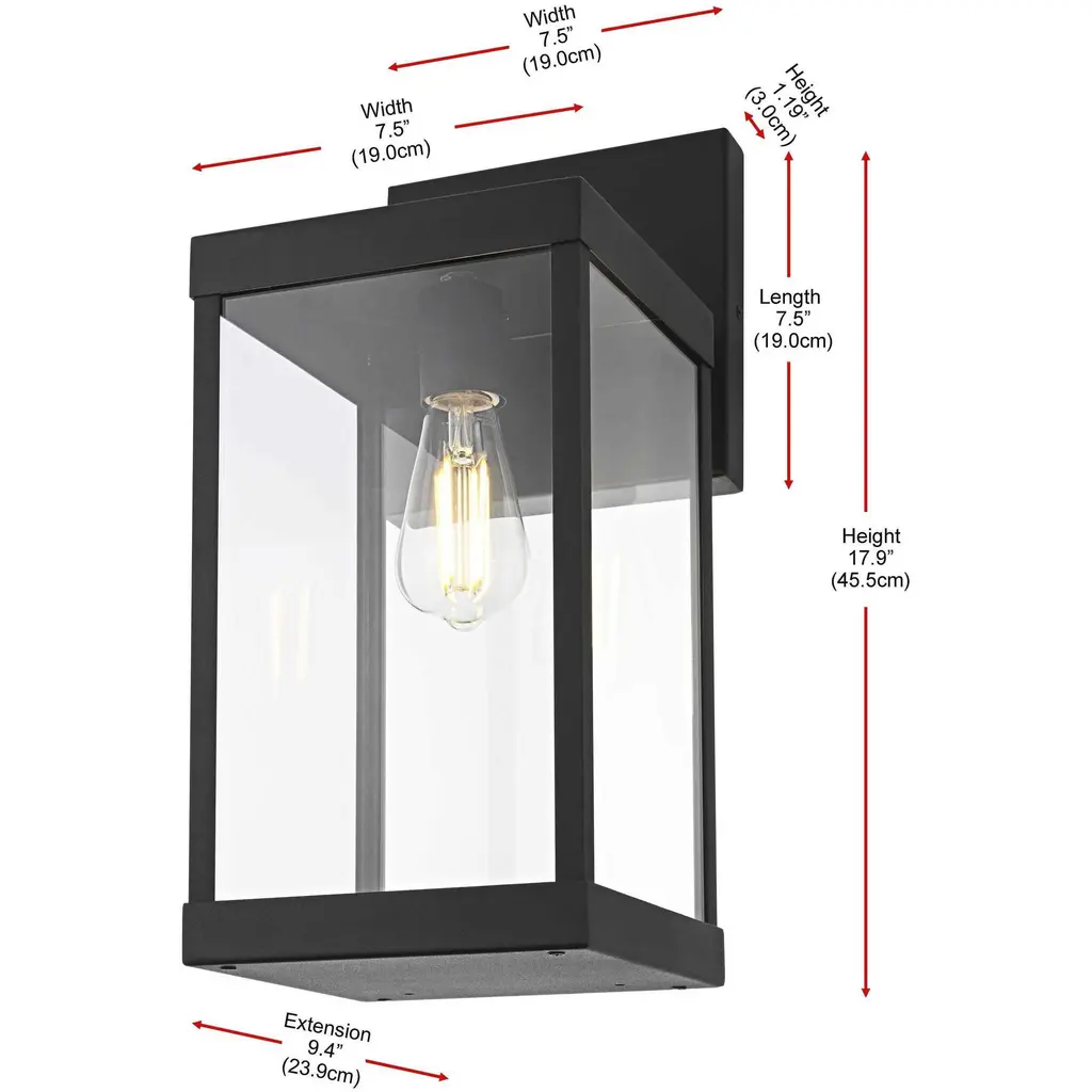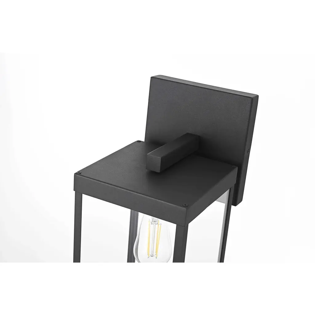 Bring definition and clarity to outdoor spaces with a modern lantern that makes a statement. A crisp rectangular frame, crafted from durable iron with a matte black finish, offers a bold contrast to the clear glass panels that surround the bulb. The structured design features an enclosed bottom for a clean and finished look, while the suspended bulb effect creates a striking focal point. A minimalist backplate and streamlined mounting arm maintain the sleek aesthetic, making this wet-rated wall light perfect for patios, entryways, and garages. Designed with an E26 socket (bulb not included), this lantern provides customizable lighting to enhance any exterior with precision and style.