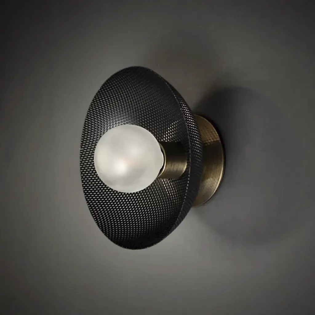 Transitional and mid-century modern style blend perfectly together in the Petite Centric Wall Sconce. It is a piece of luxury design from Blueprint Lighting. The perforated metal akin to a micro honeycomb was applied in homage to iconic mid-mod designer Mathieu Mategot’s “Rigitulle” style. Completed with a natural brass frame finish and modern accents, this sconce was made in the USA and is meant for display in places that would benefit from the elevated style and inspiration.