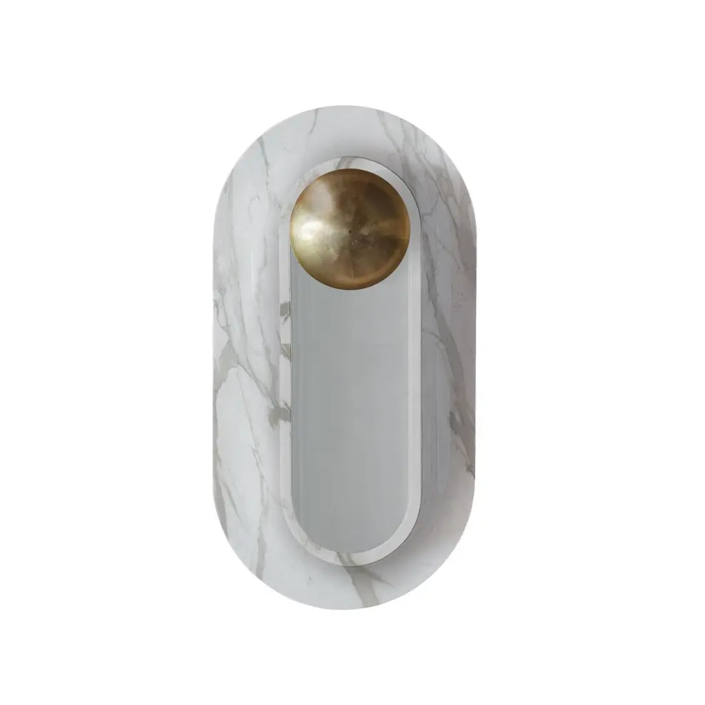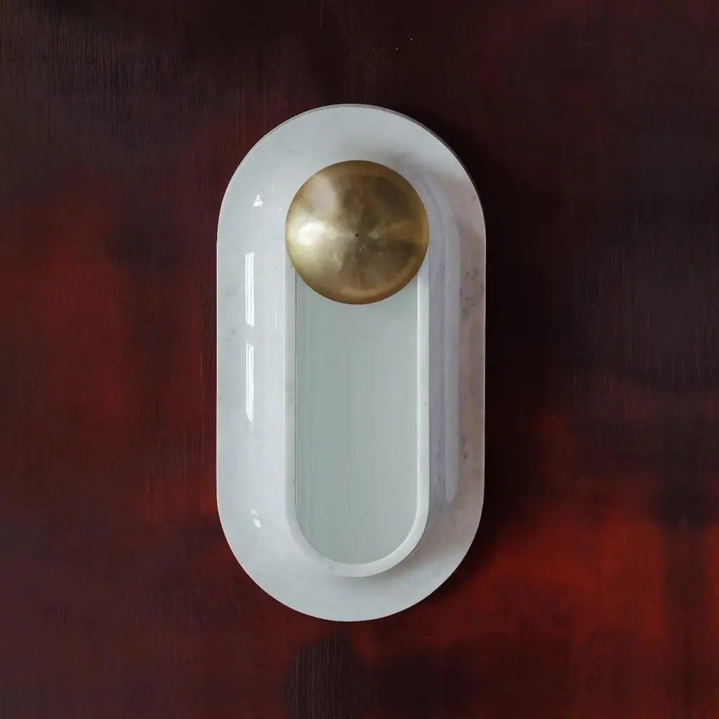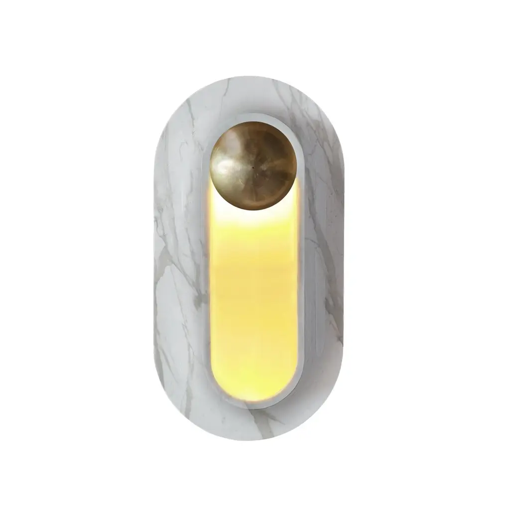 Pfaffikon Sculptural Marble and Brass Wall Lamp by Jan GarncarekDimensions: D 12 x W 25 x H 46 cmMaterial: Brass, glass, Carrara marble.Information:weight: 7 kg / 33 lbvoltage: 120V, 240Vlamping: 1 X 12 W dimmable LED modulelumens:1000 Imkcolortemperature:2700 Kled driver: onboardtightness class: IP 21certificates: CE approved, RoHSThe Pfaffikon lamp it is a carrara marble sconce with brass decorative element. Gives delicate light which emerges from the frosted glass overlay.The sconce is the first lamp that its designer made in stone. It consists of a marble collar subtly emerging from the wall and a topping semi sphere made from brass from under which the light comes out. The idea was born during a trip through Switzerland and the first sketches were madenear a town named Pfakon. The lamp is also available in version made entirely from casted brass.Each sconce has the certificate of the originality and is signed. Hand crafted. Jan Garncarek is an important contemporary designer, graduated from the Academy of Fine Arts in Warsaw. He gained extra qualifications at Politecnico di Milano. He has acquired professional experience in the design society. He took part in projects such as: design of visual information for the Museum of the history of Polish Jews, interior design project of the Polish cultural Institute in Tel Aviv, space arrangement of the Presidential Palace of Poland, interior design project of the Polish Embassy in Berlin and Skopje, Modernization of the Malachowski's Square in Warsaw. His process of designing is the state of researching, discovering and being curious of the world, making insightful observations and drawing sensible conclusions. All our lamps can be wired according to each country. If sold to the USA it will be wired for the USA for instance.