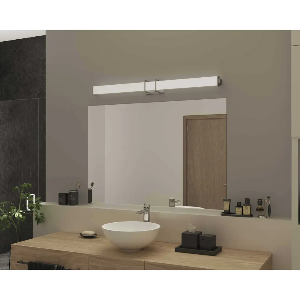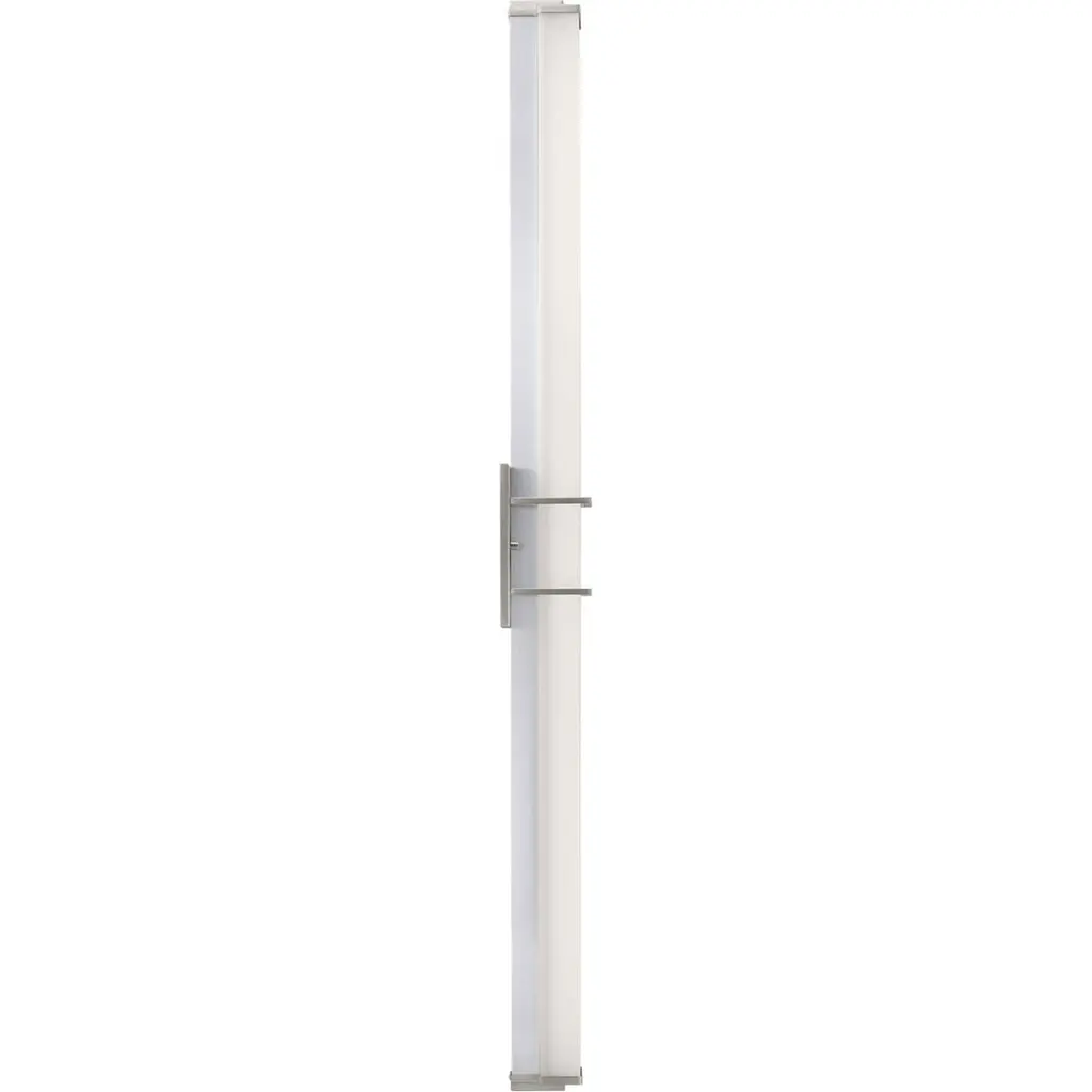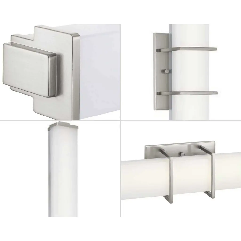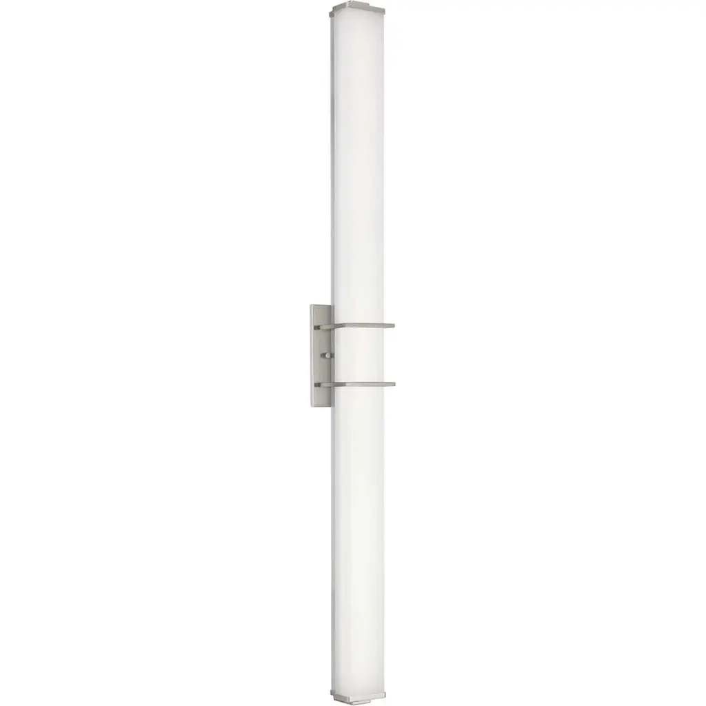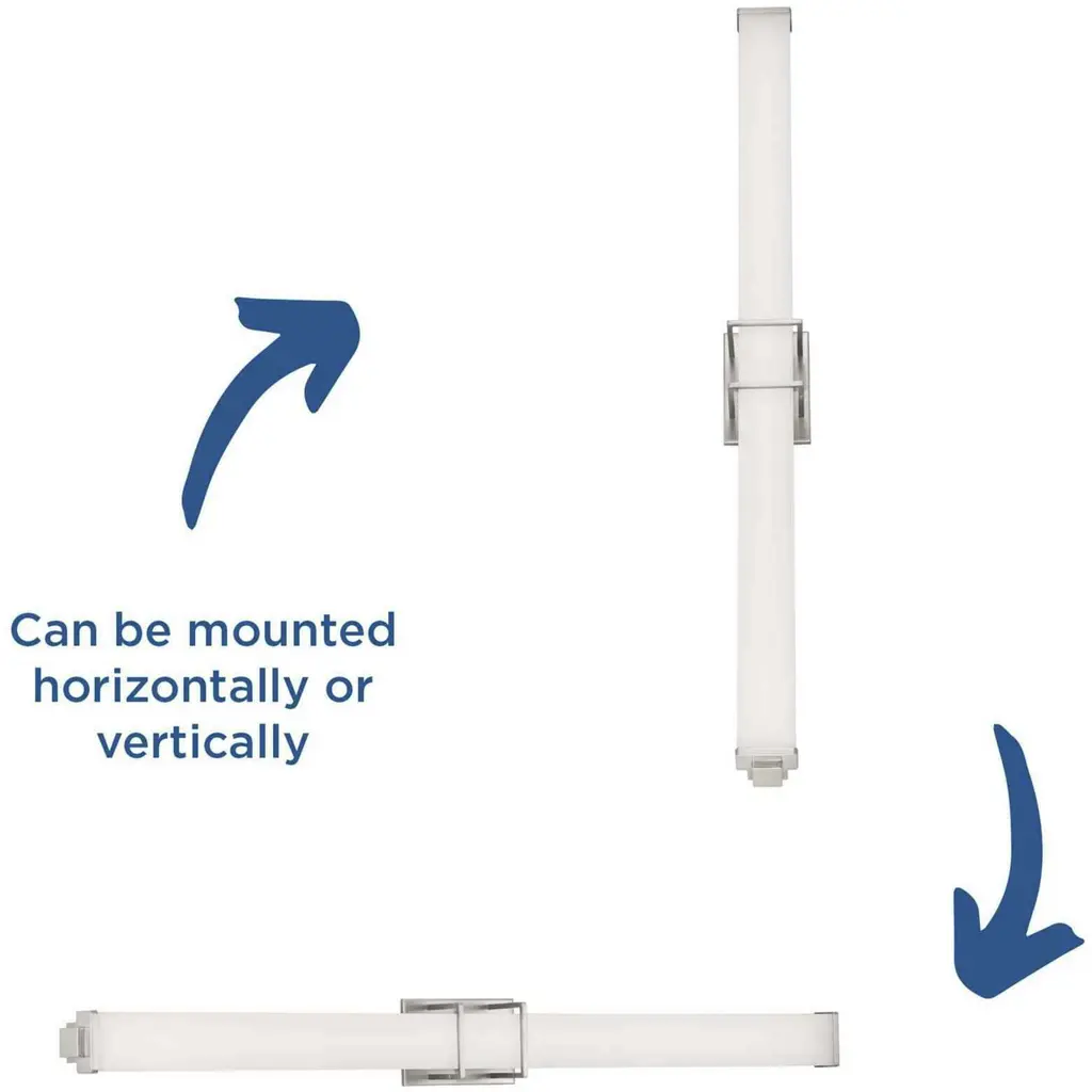 Phase 2.2 features a thin, acrylic shade framed by architectural accents in Brushed Nickel complete the design. This specially designed 48in. linear bath fixture delivers ambient light to surfaces free of shadows. Ideal for residential, commercial and multi-family applications. An integrated LED source provides energy and cost savings benefits. Can be installed vertically or horizontally.